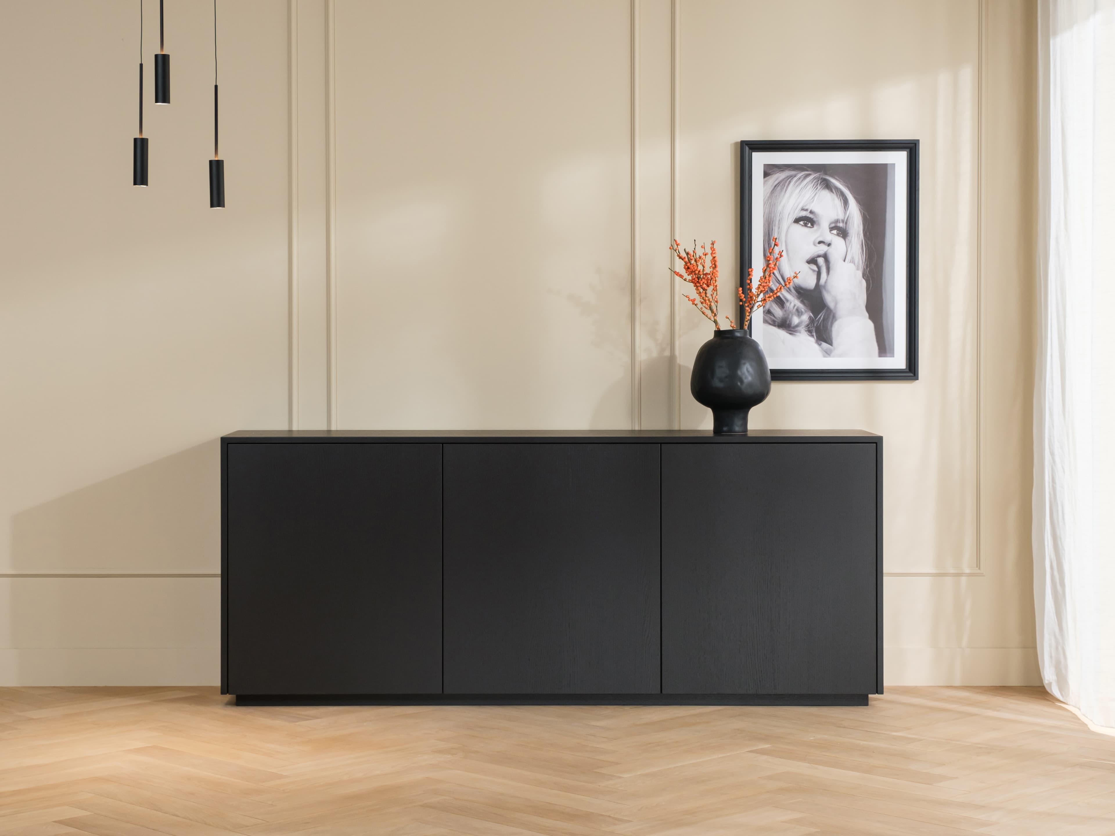Staand dressoir uit de Ambiance serie. Dit model is uitgevoerd in zwart eiken en staand op een plint. De Ambiance serie is met haar stoere look en veelzijdigheid een verrijking voor ieder interieur. De plint geeft een robuuste en solide look. Het zwart eiken fineer zorgt voor een warme en moderne uitstraling.