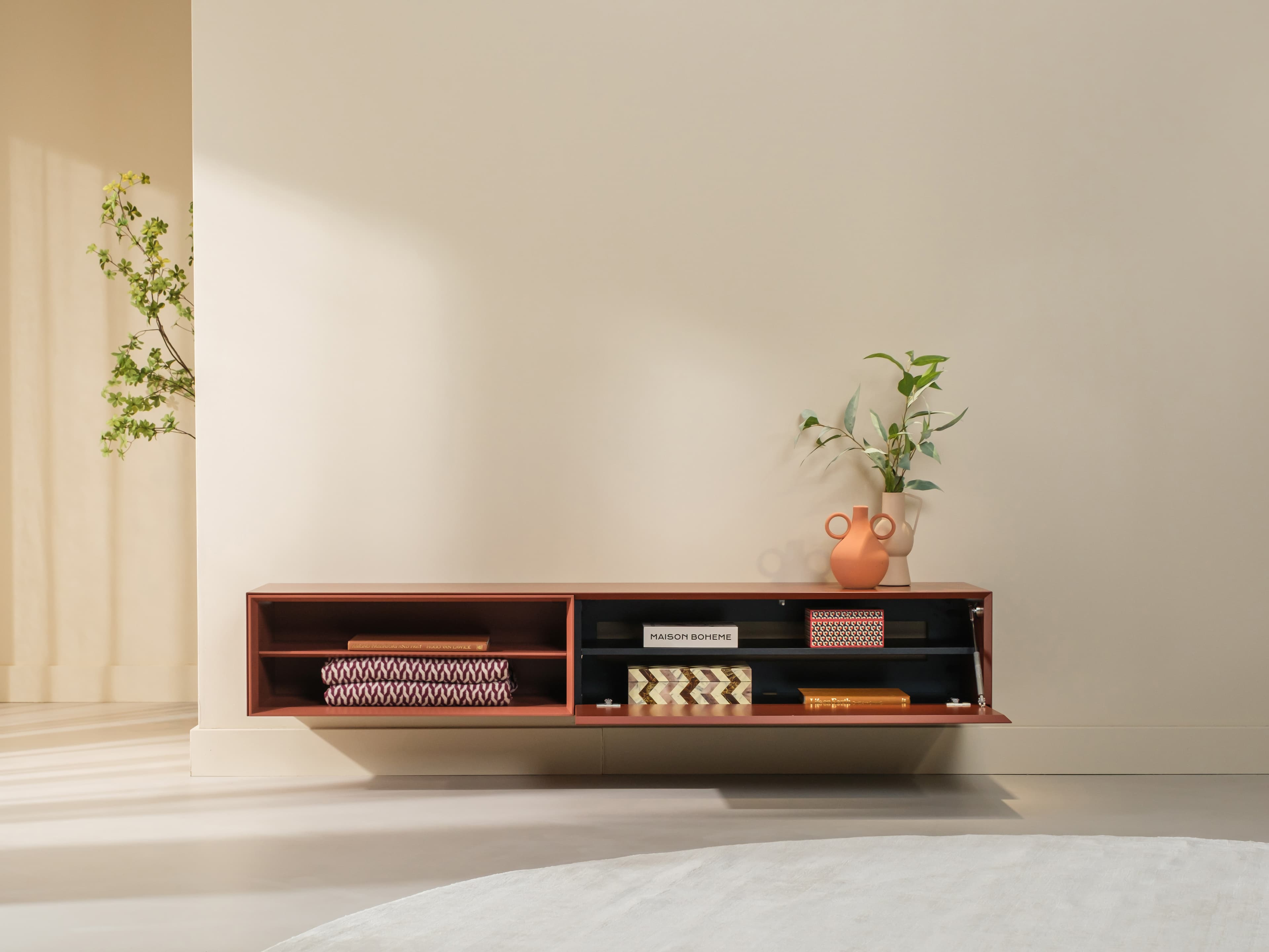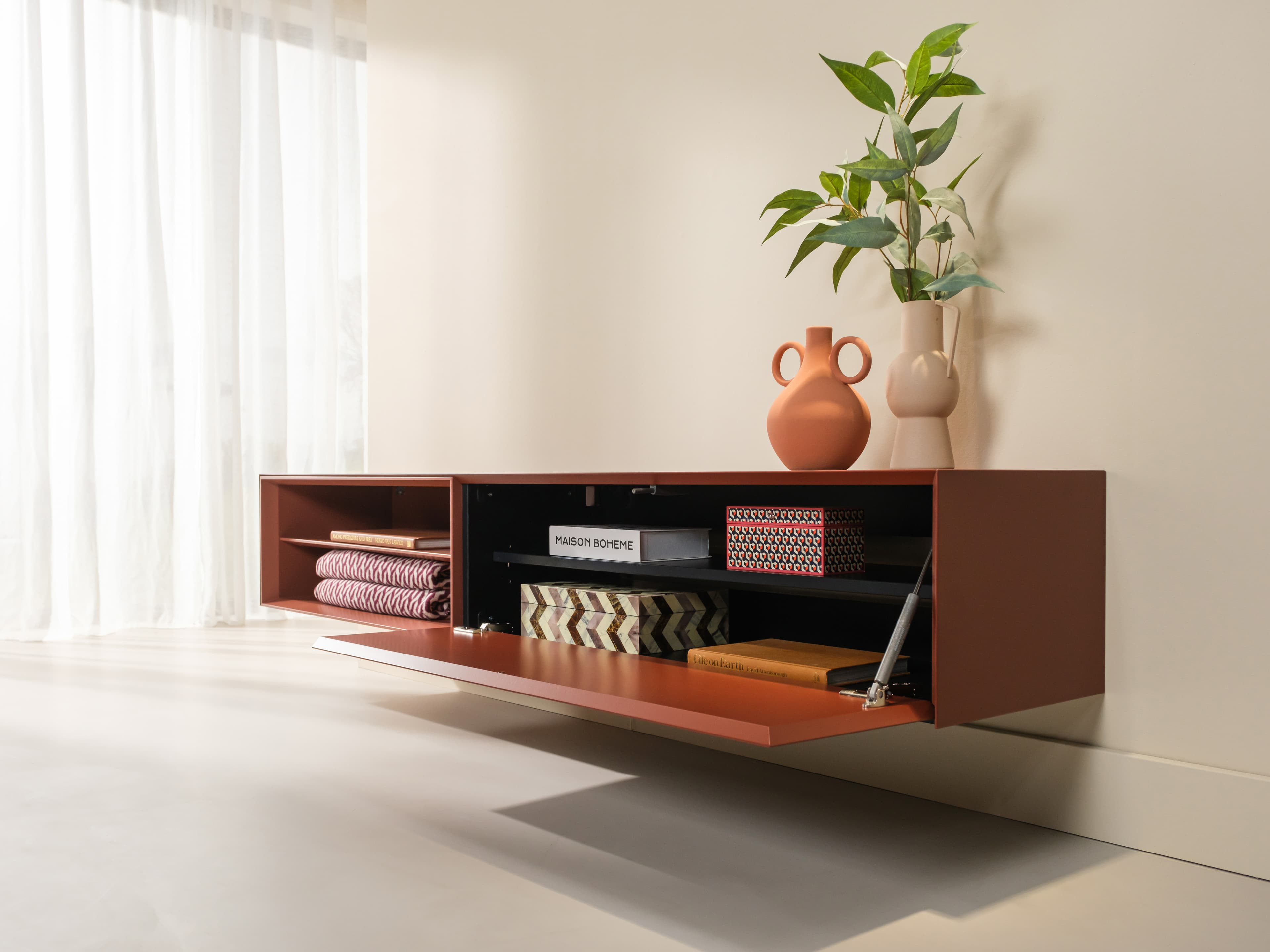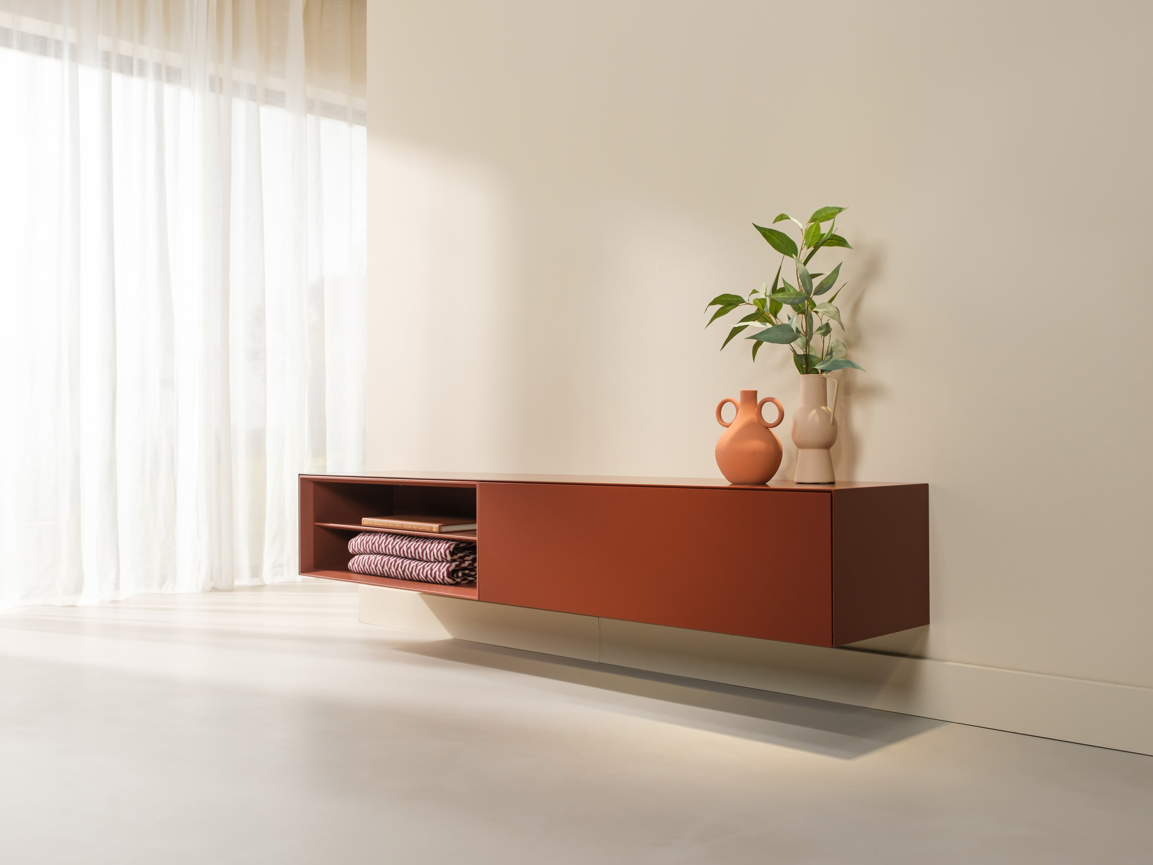 Zwevend tv meubel uit de Excellent serie. De Excellent serie geeft ieder interieur een verfijnde luxe uitstraling voor jarenlang woonplezier. Kenmerkend zijn de stijlvolle slanke lijnen en perfect afgewerkte details. Dit model is uitgevoerd met een open vak en gespoten in een unieke kleur.