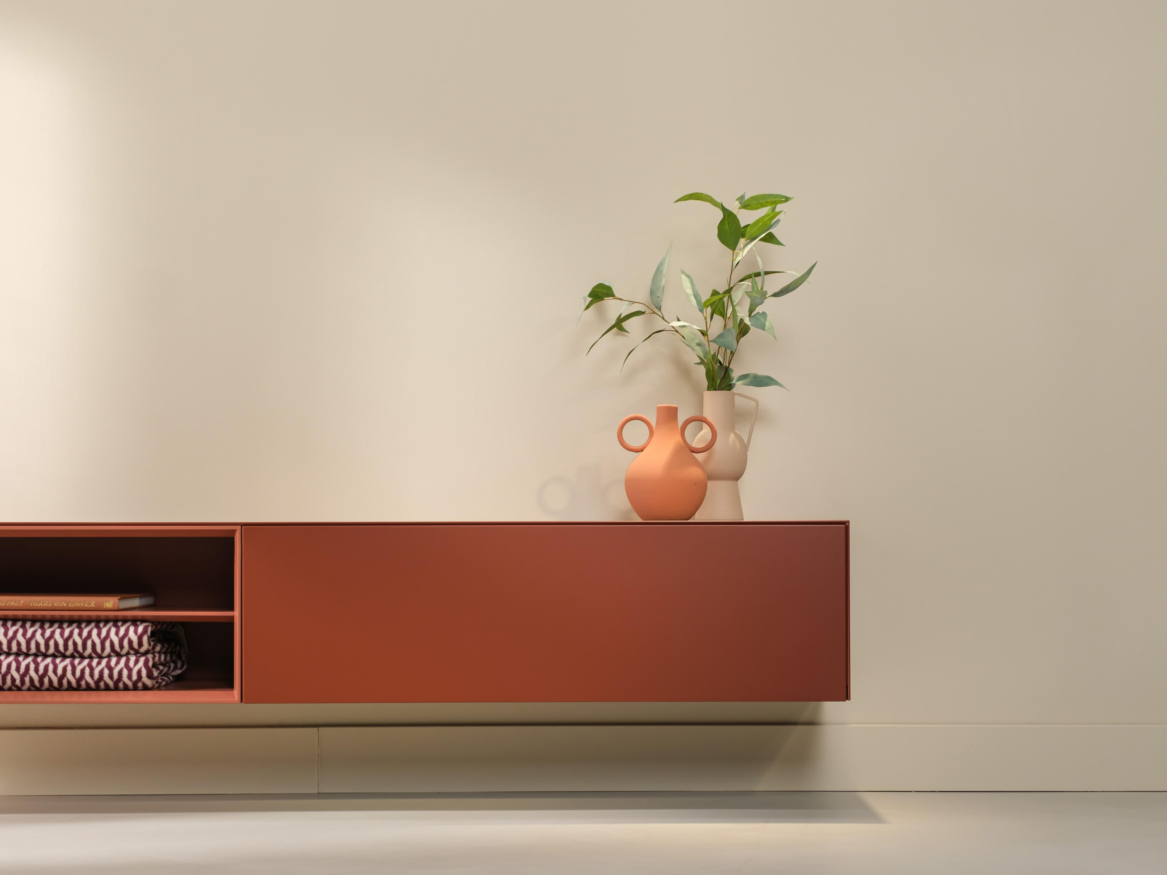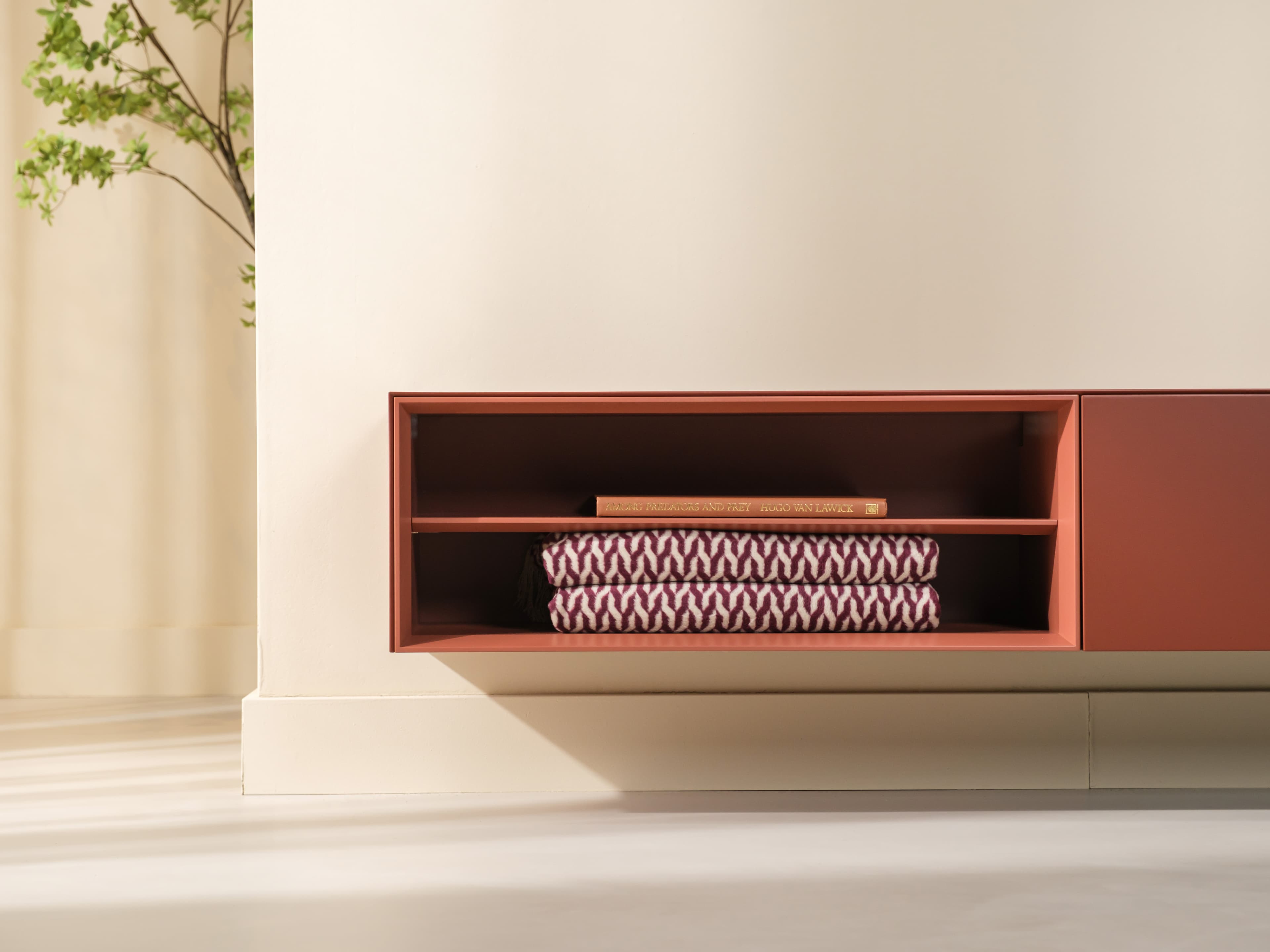 Het tv meubel is in formaat, kleur en indeling eenvoudig naar wens aanpasbaar. Bepaal de kleur van het meubel en de inzet nis los van elkaar. Kies uit onze signatuurkleuren of ga voor je eigen unieke kleur. Van RAL tot vele andere bekende kleuren en kleurenwaaiers. In effen, maar ook in houtstructuur.