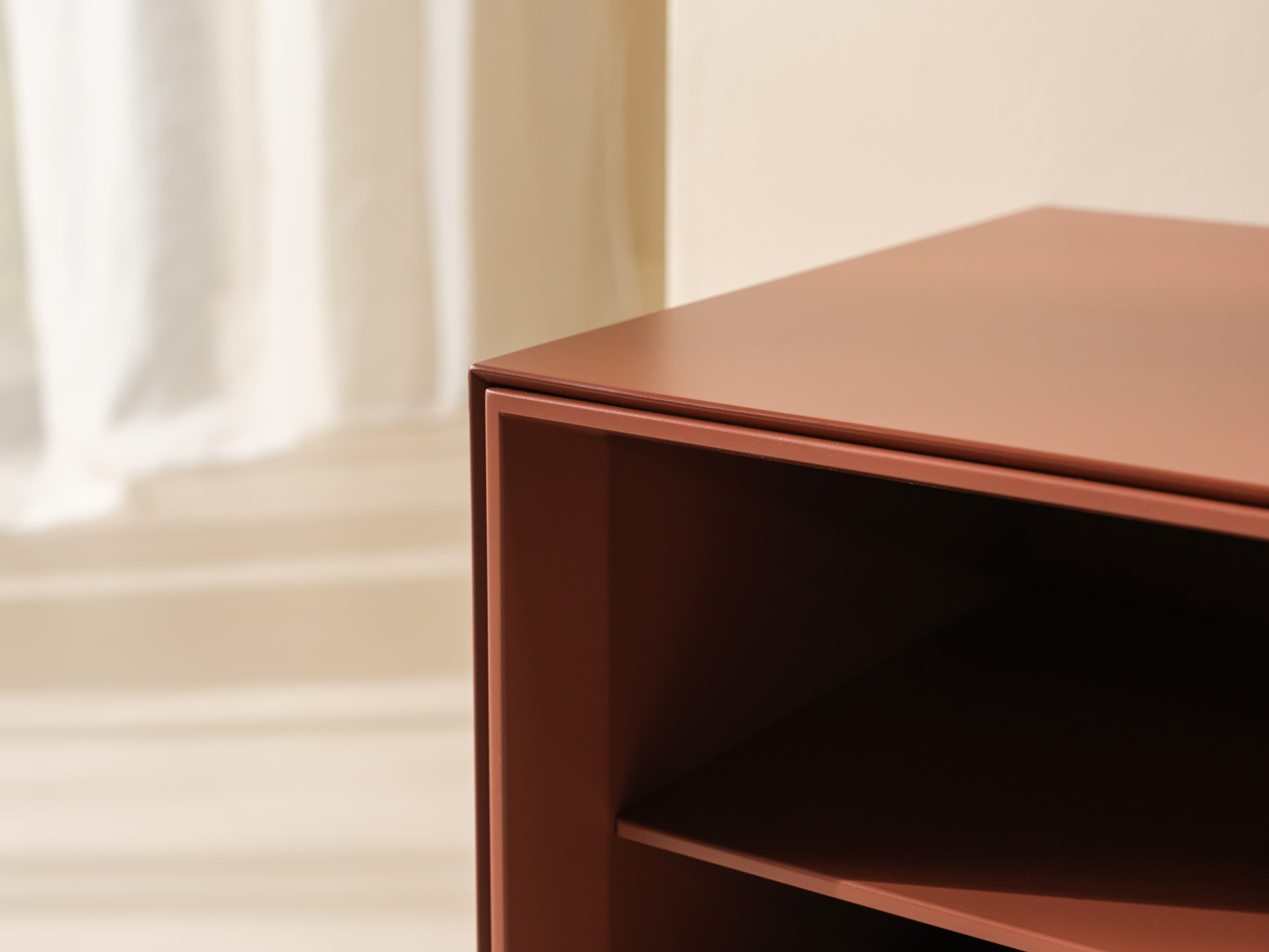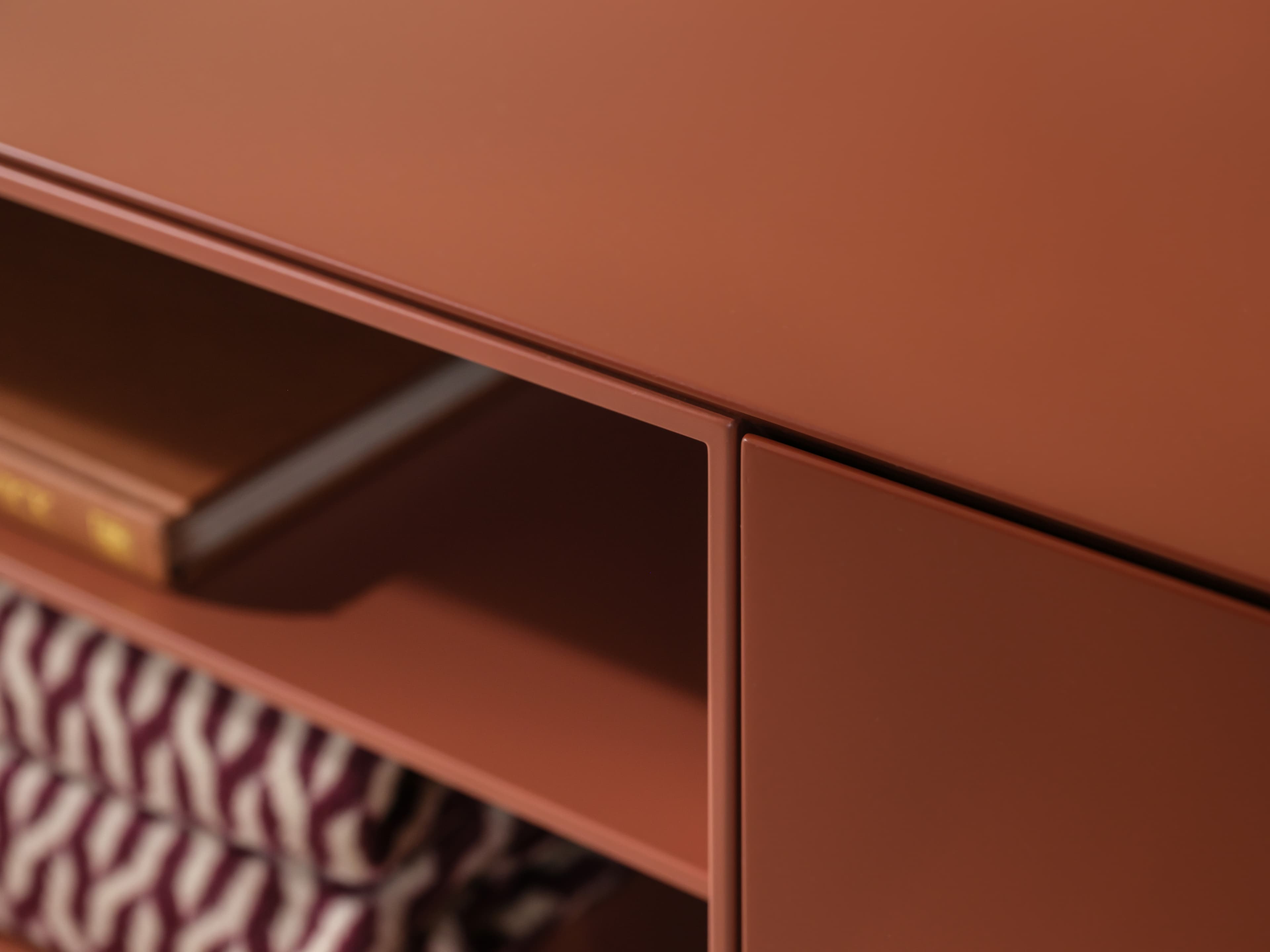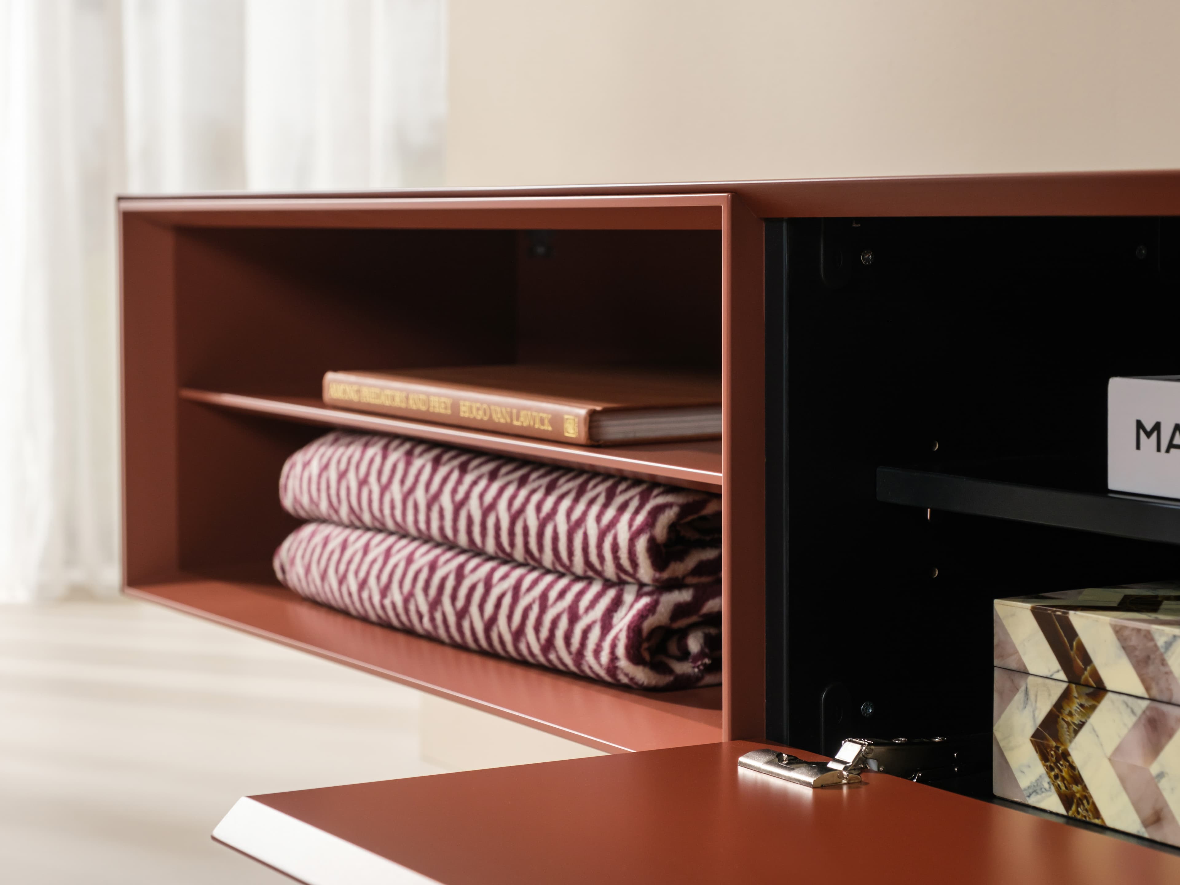 De inzet nis heeft een subtiel kleurverschil met het meubel. De afwijkende kleur en het open gedeelte geven een speelse ruimtelijkheid aan het geheel. Bovendien is het een handige opbergplek voor bijvoorbeeld boeken, tijdschriften of een afstandsbediening. De valkleppen vallen mooi rustig open dankzij het verfijnde push-to-open systeem met hoogwaardige gasveren.