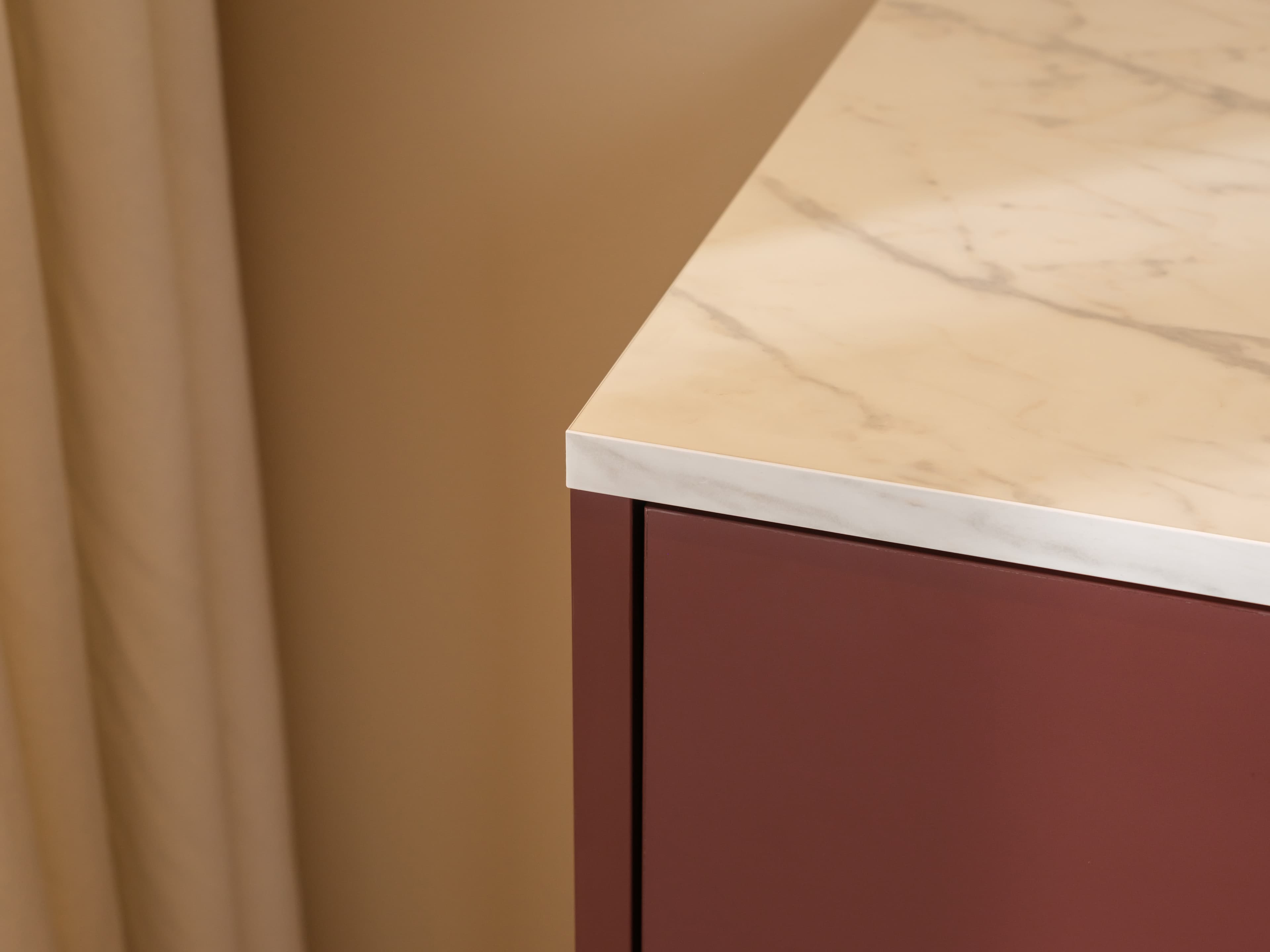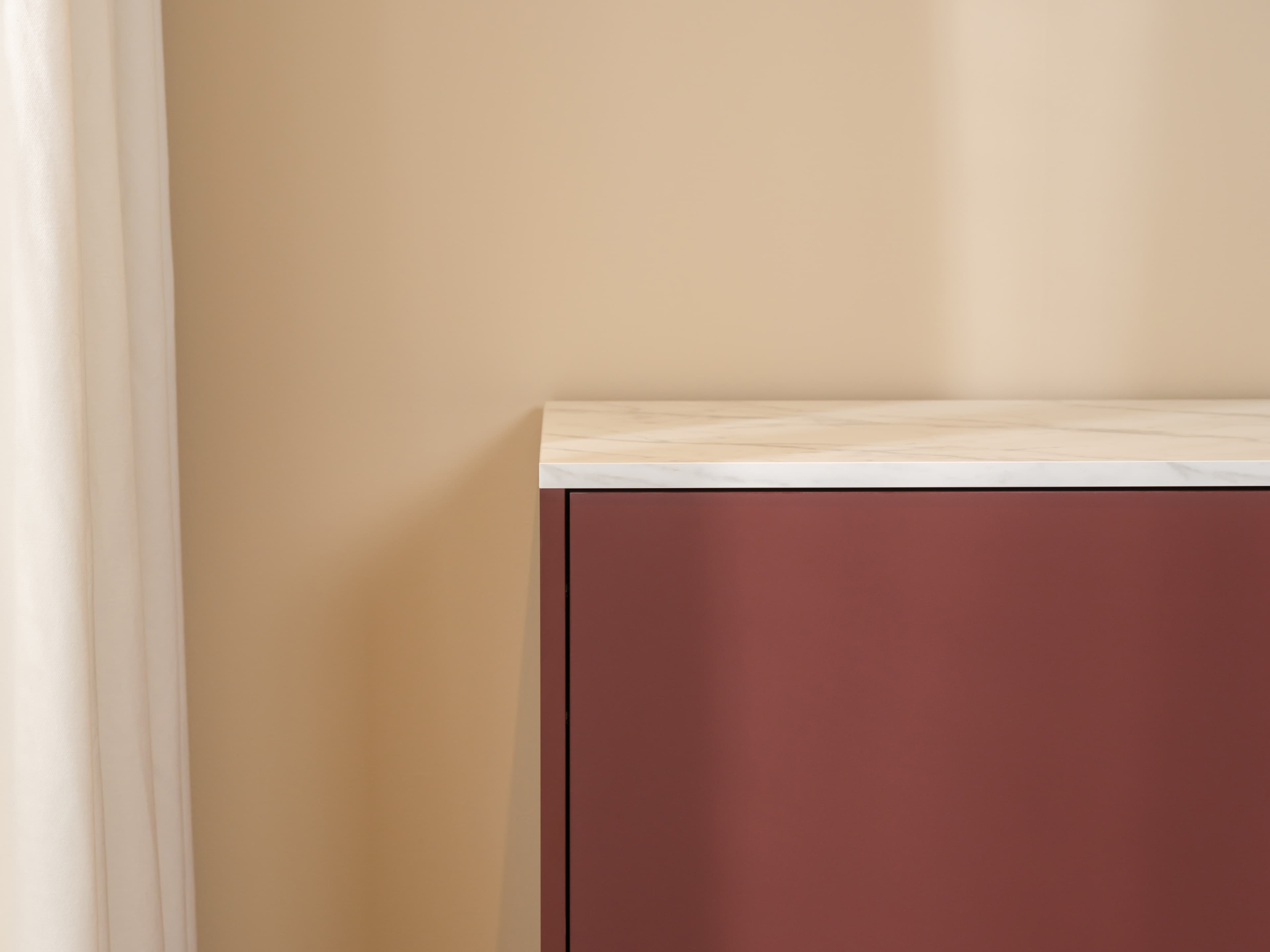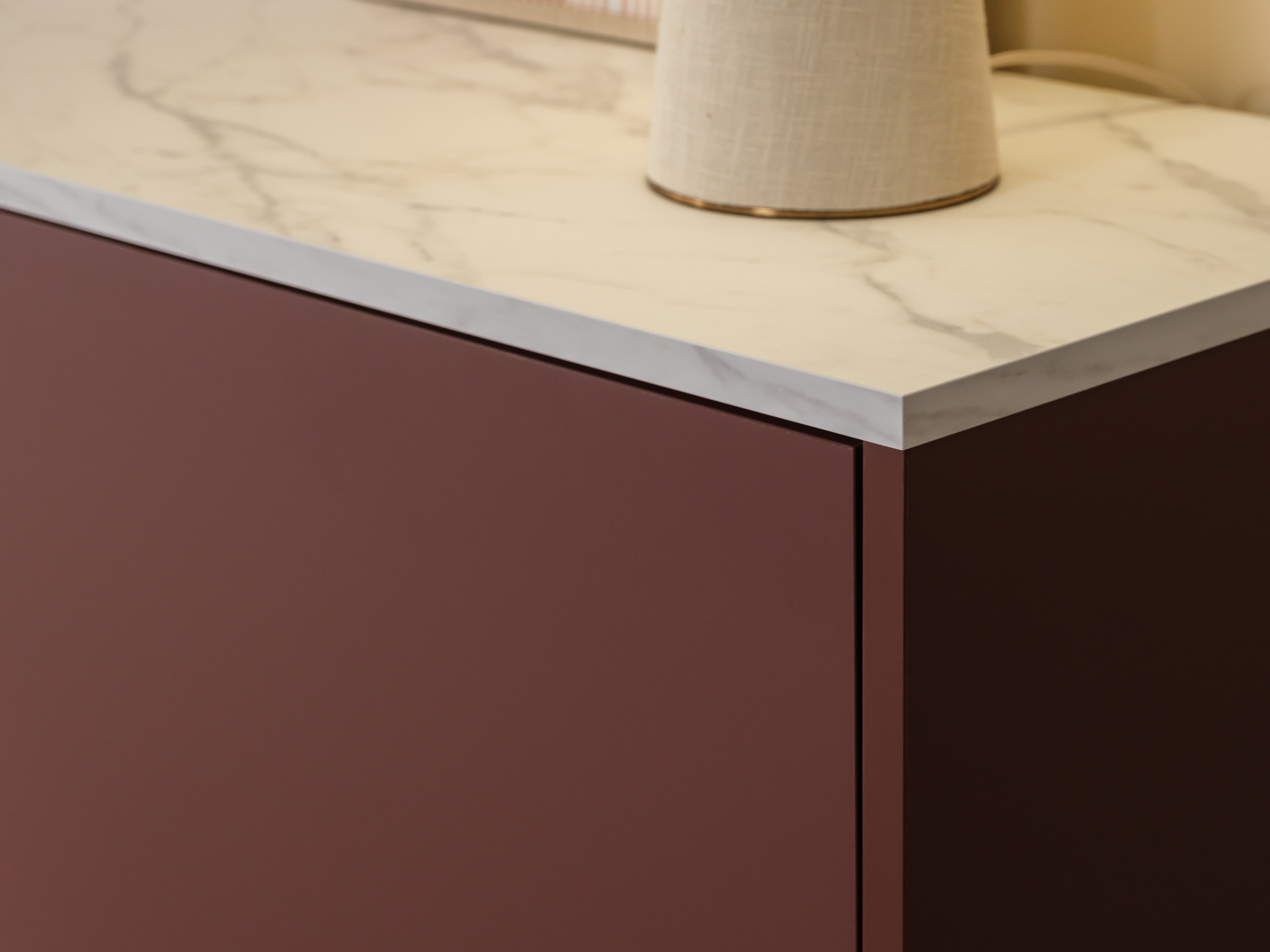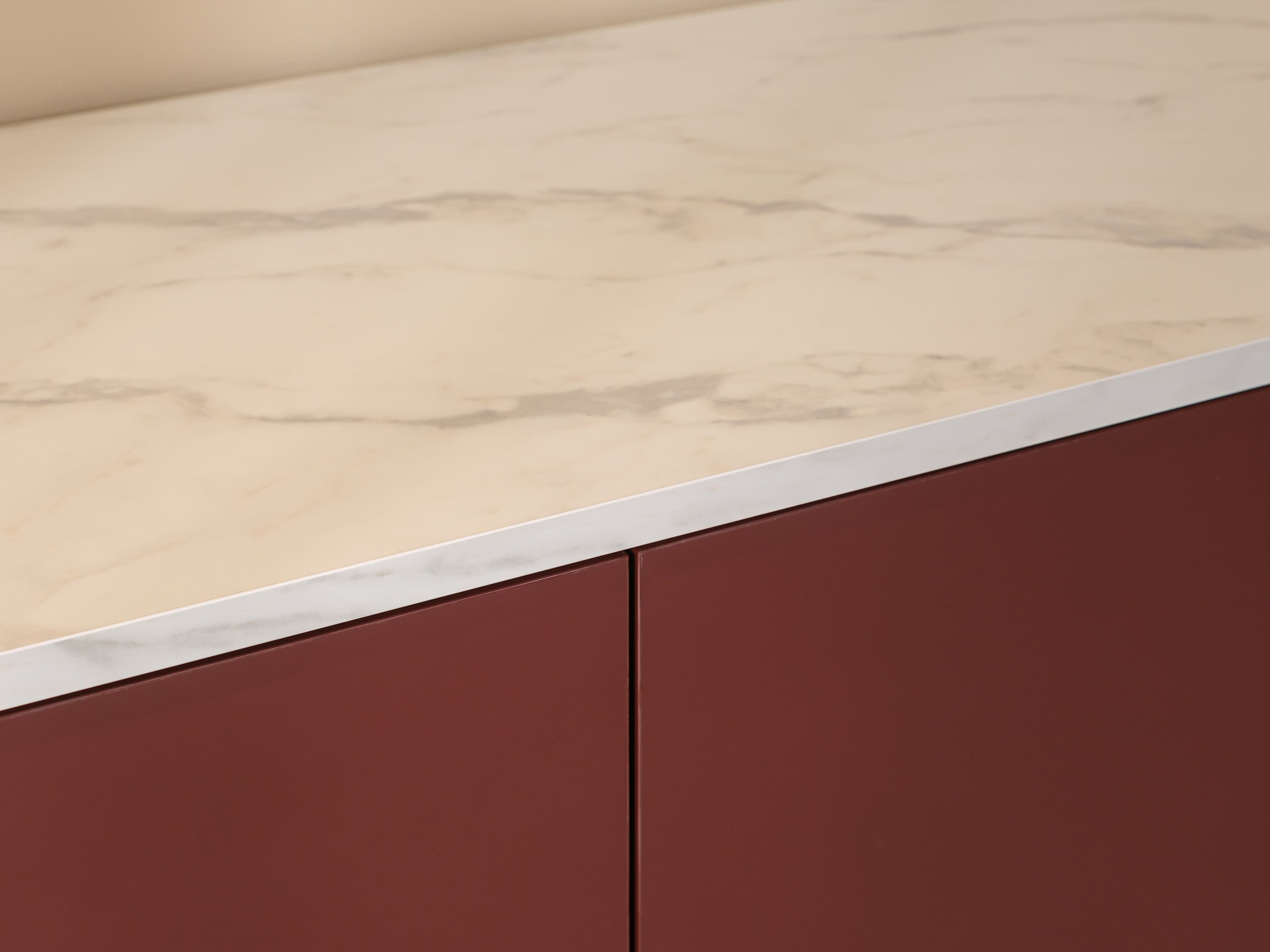 Dit model is uitgevoerd in onze Style trendkleur Velvet red met een Marble white bovenblad en een subtiele lage zwarte plint. Het marmerlook bovenblad heeft een matte uitstraling en verfijnde soft-touch. Een echte luxe en elegante eyecather.