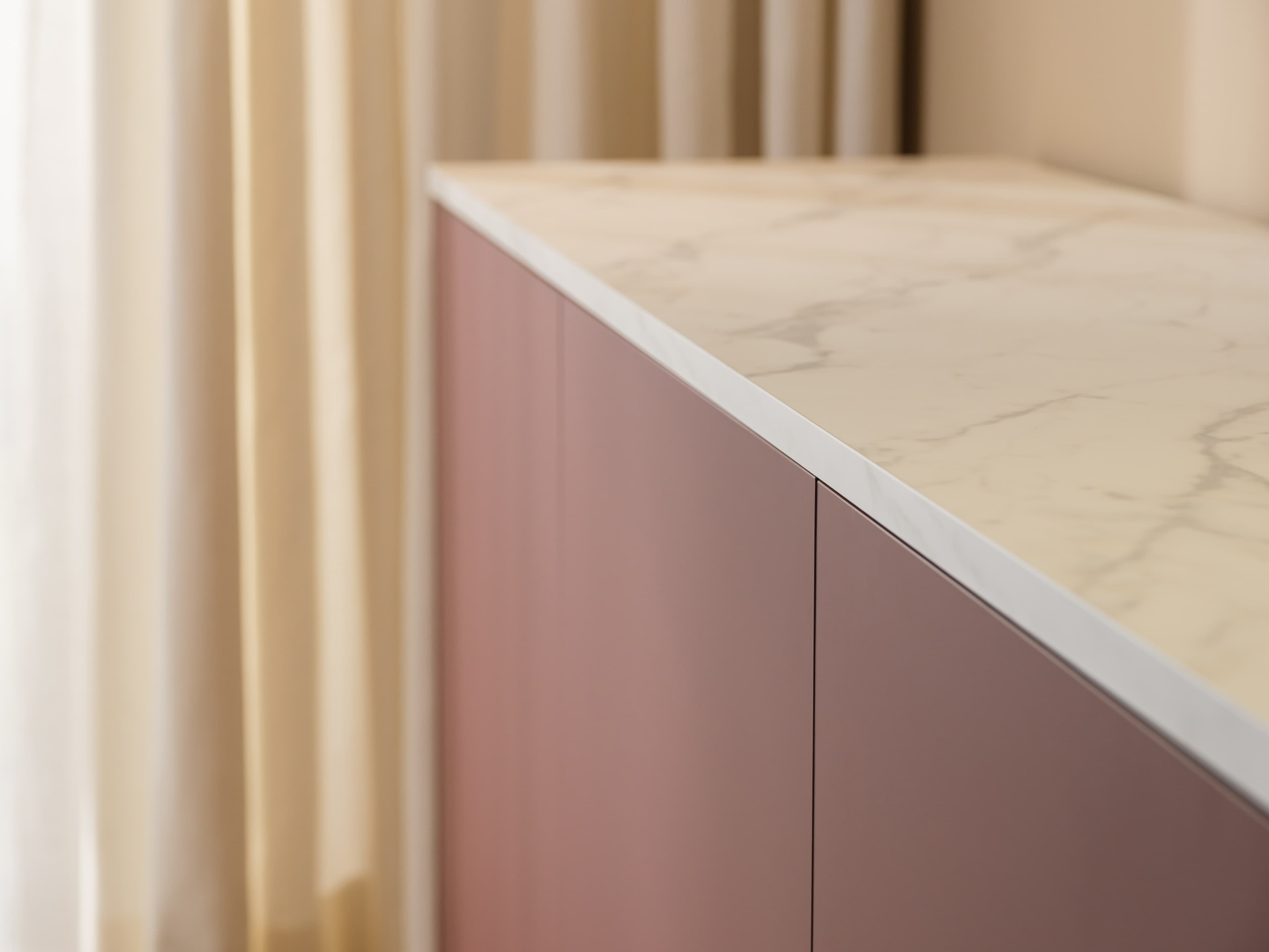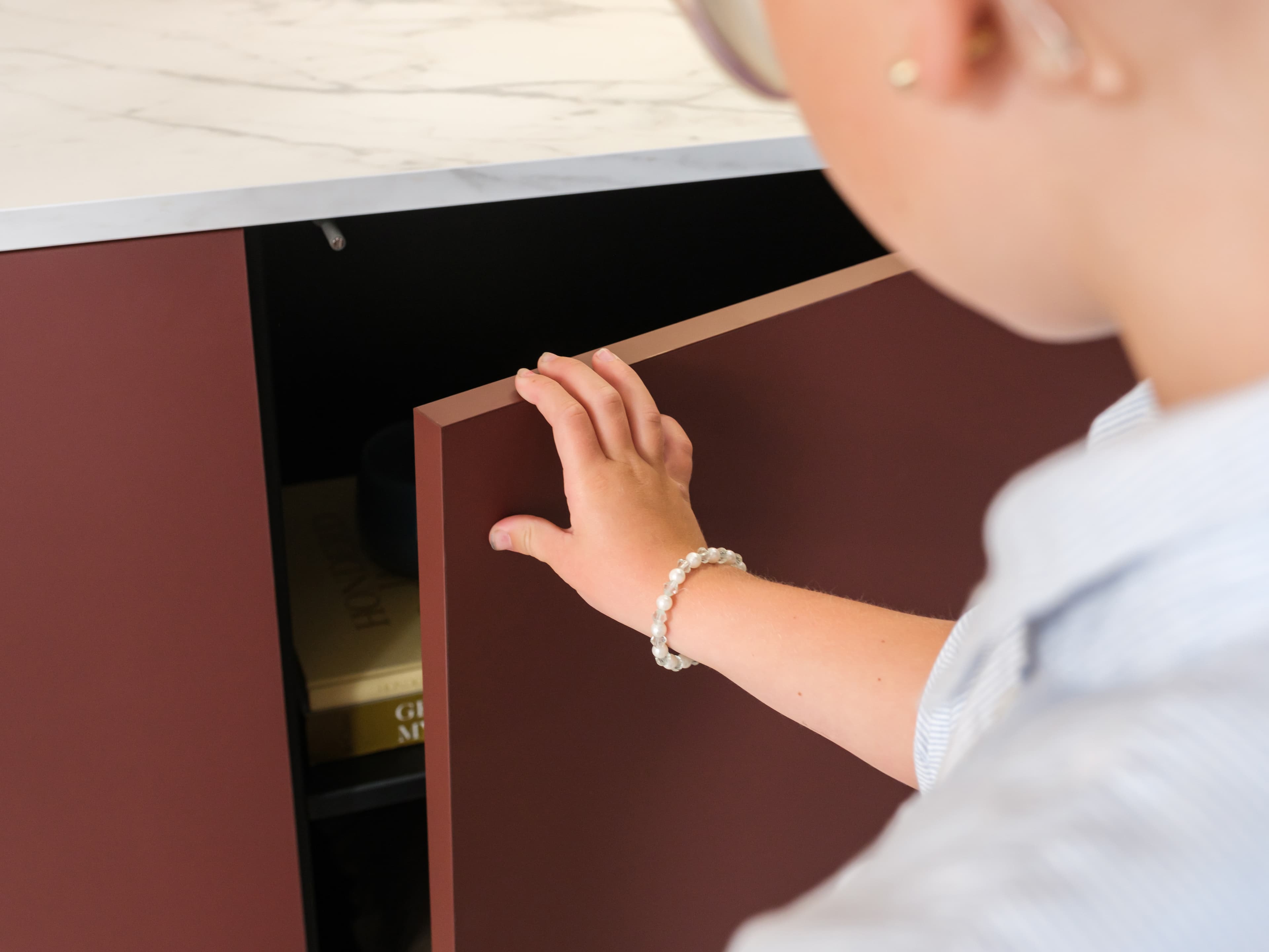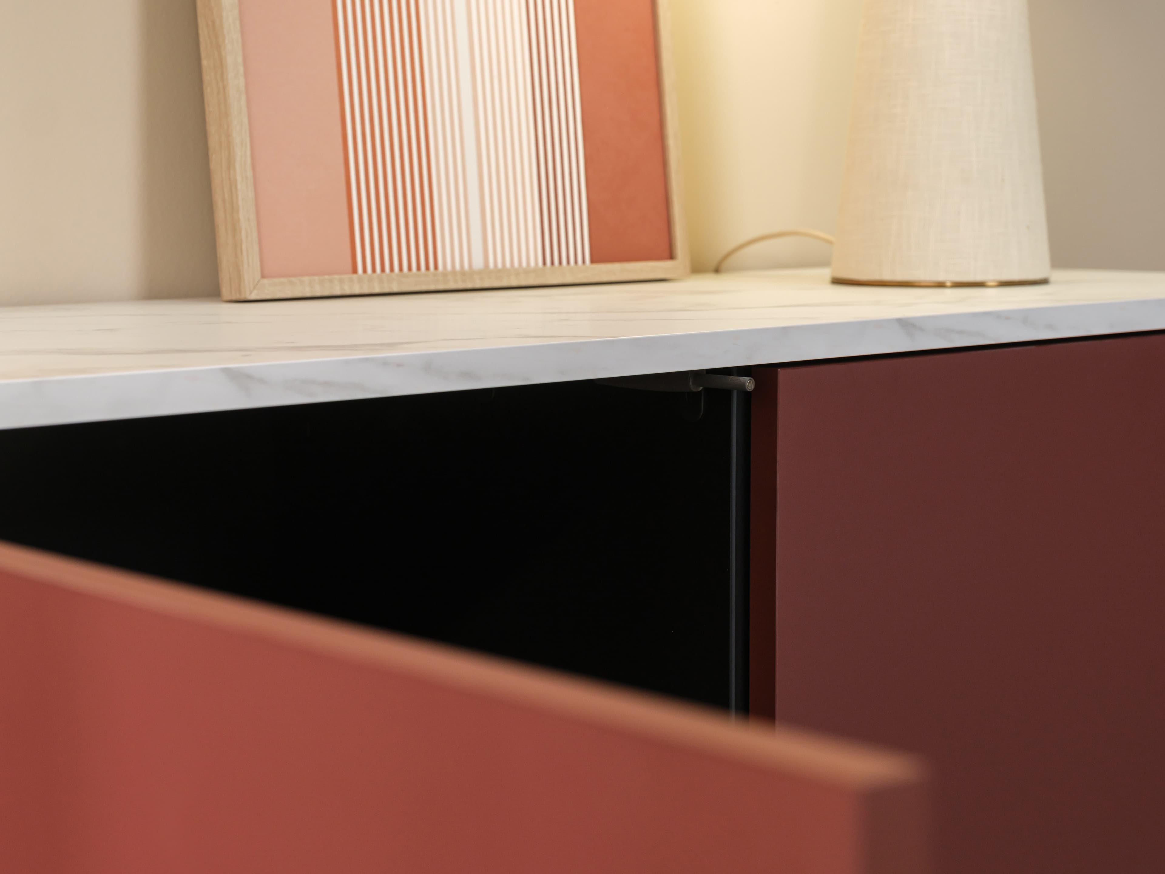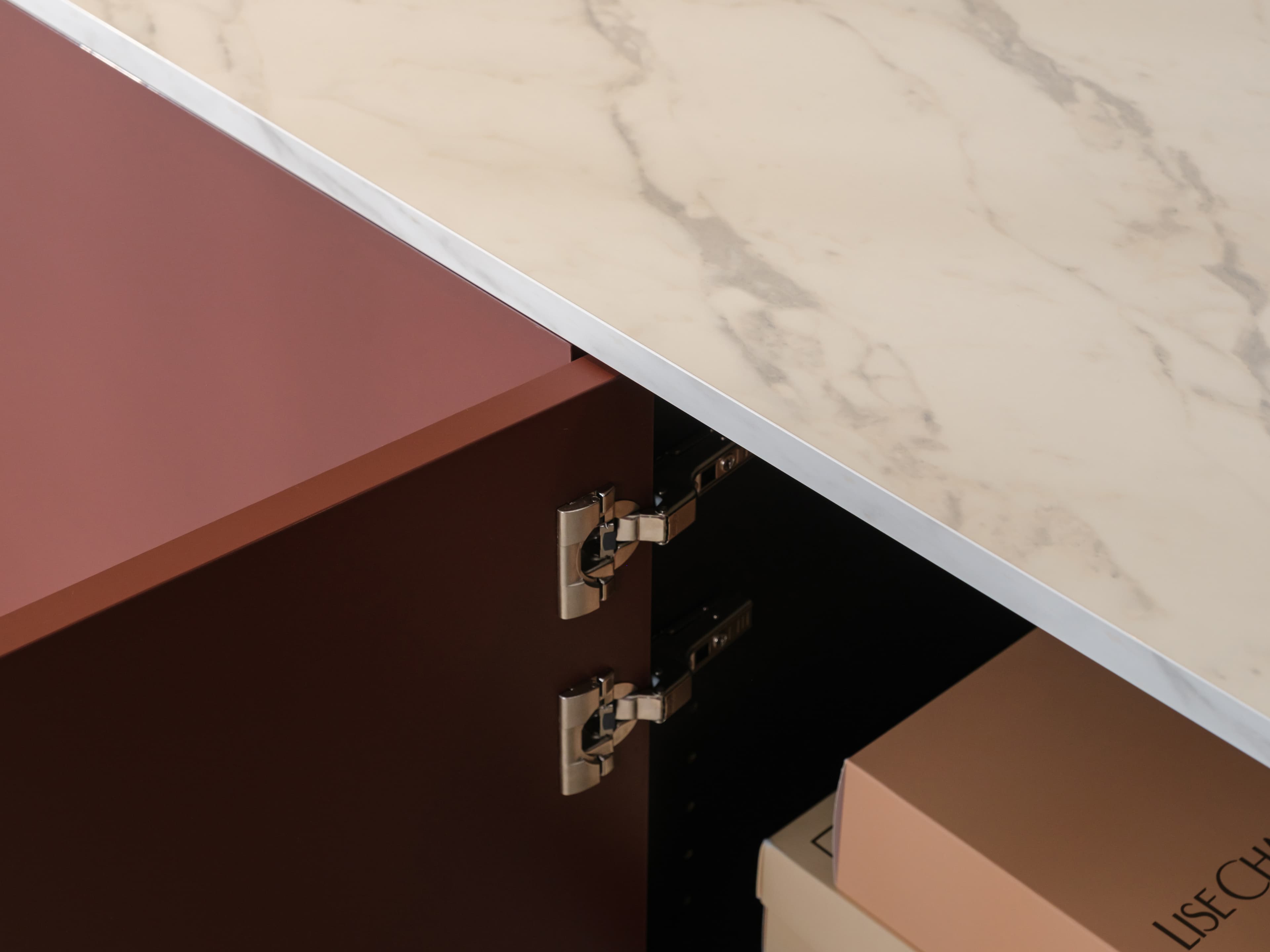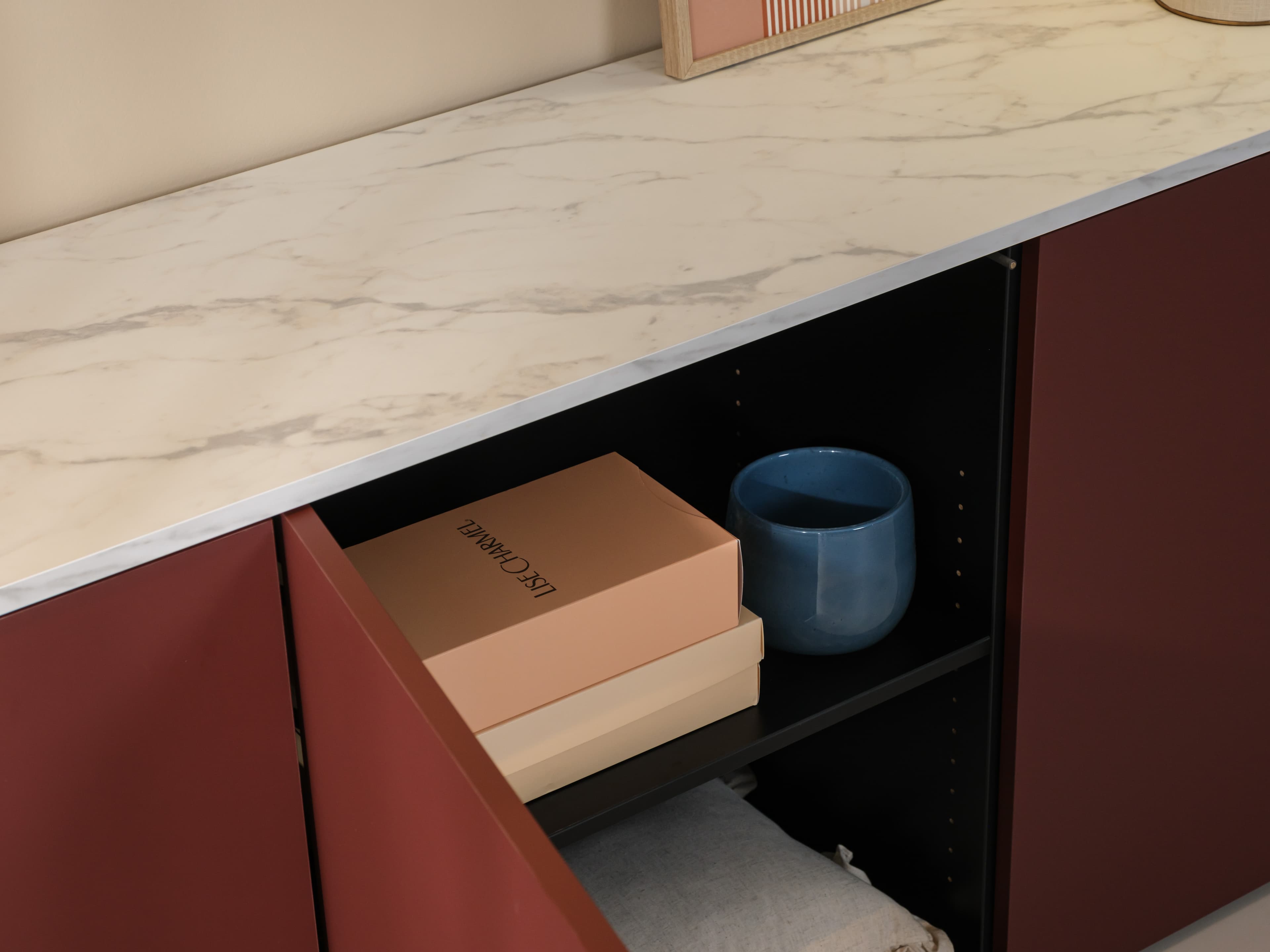 Dit model is uitgevoerd in onze Style trendkleur Velvet red met een Marble white bovenblad en een subtiele lage zwarte plint. Het marmerlook bovenblad heeft een matte uitstraling en verfijnde soft-touch. Een echte luxe en elegante eyecather.