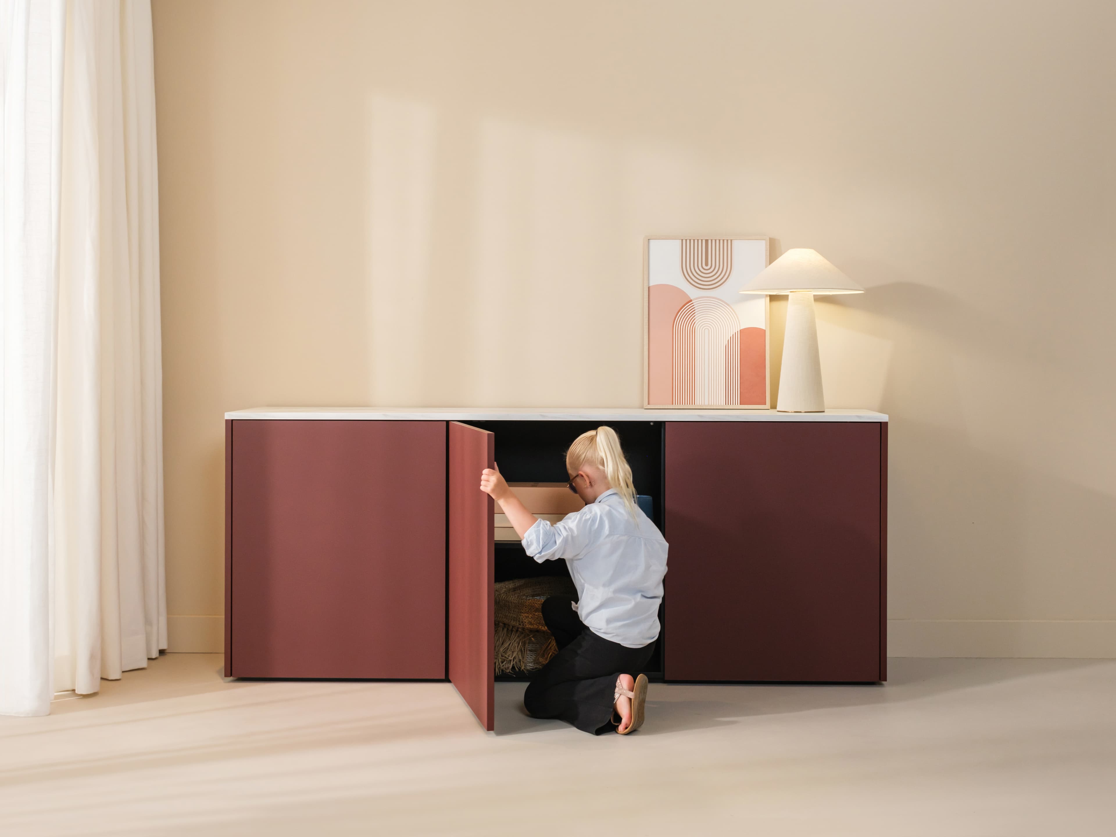 Het dressoir is in formaat en indeling eenvoudig naar wens aanpasbaar. Kies uit één van de drie trendkleuren of zes basiskleuren. Ook staand op plint of zelfs zwevend mogelijk.