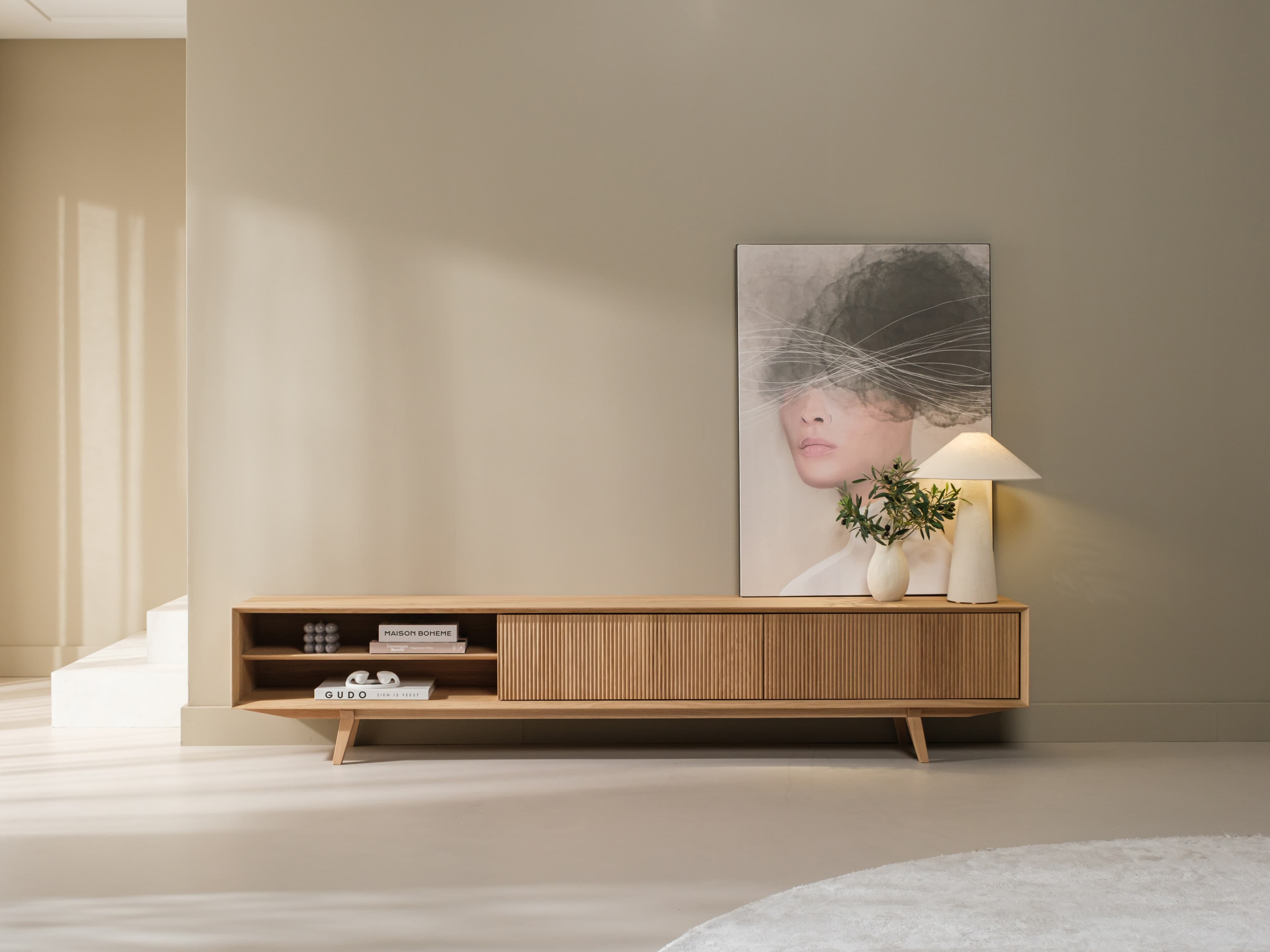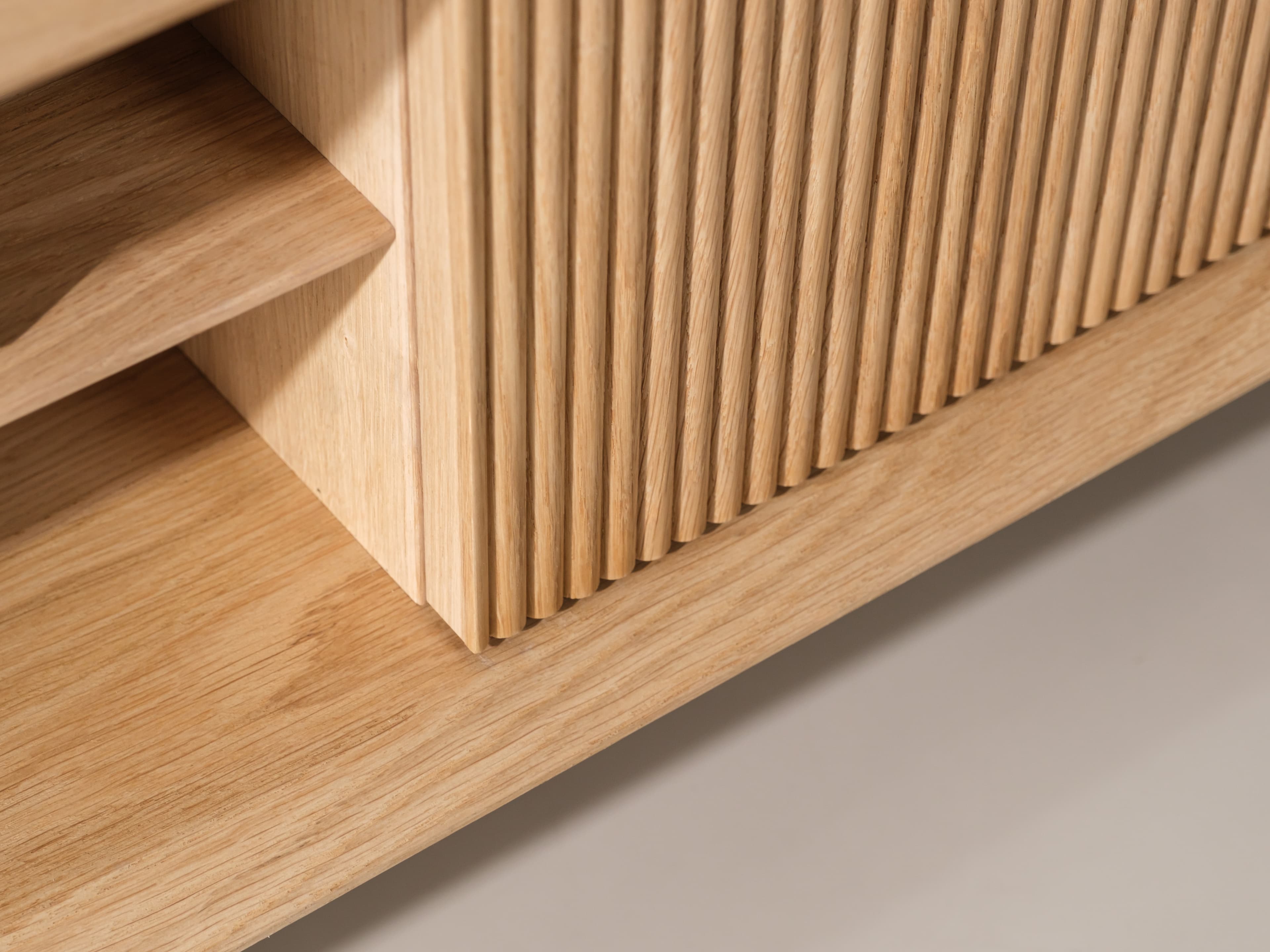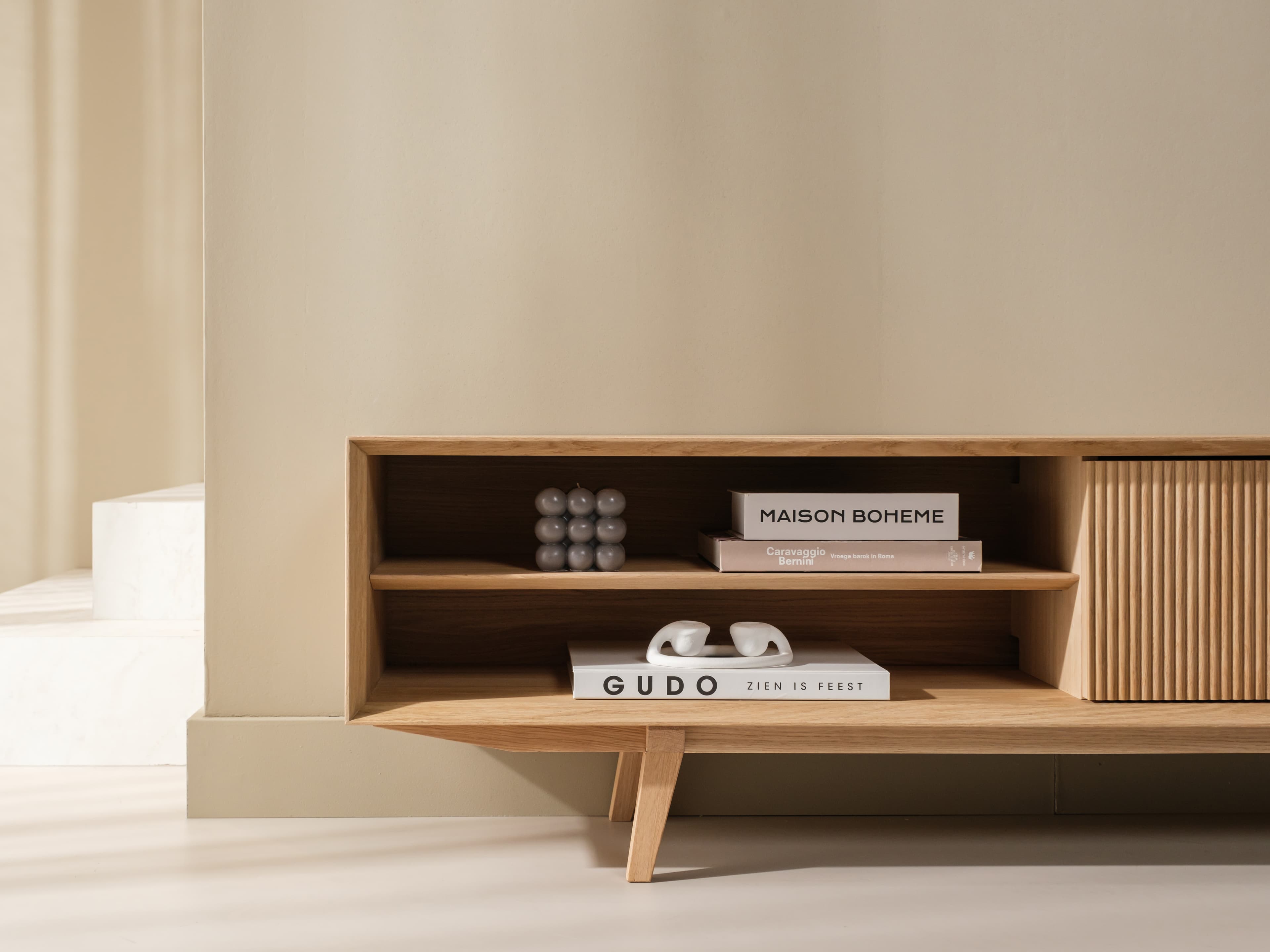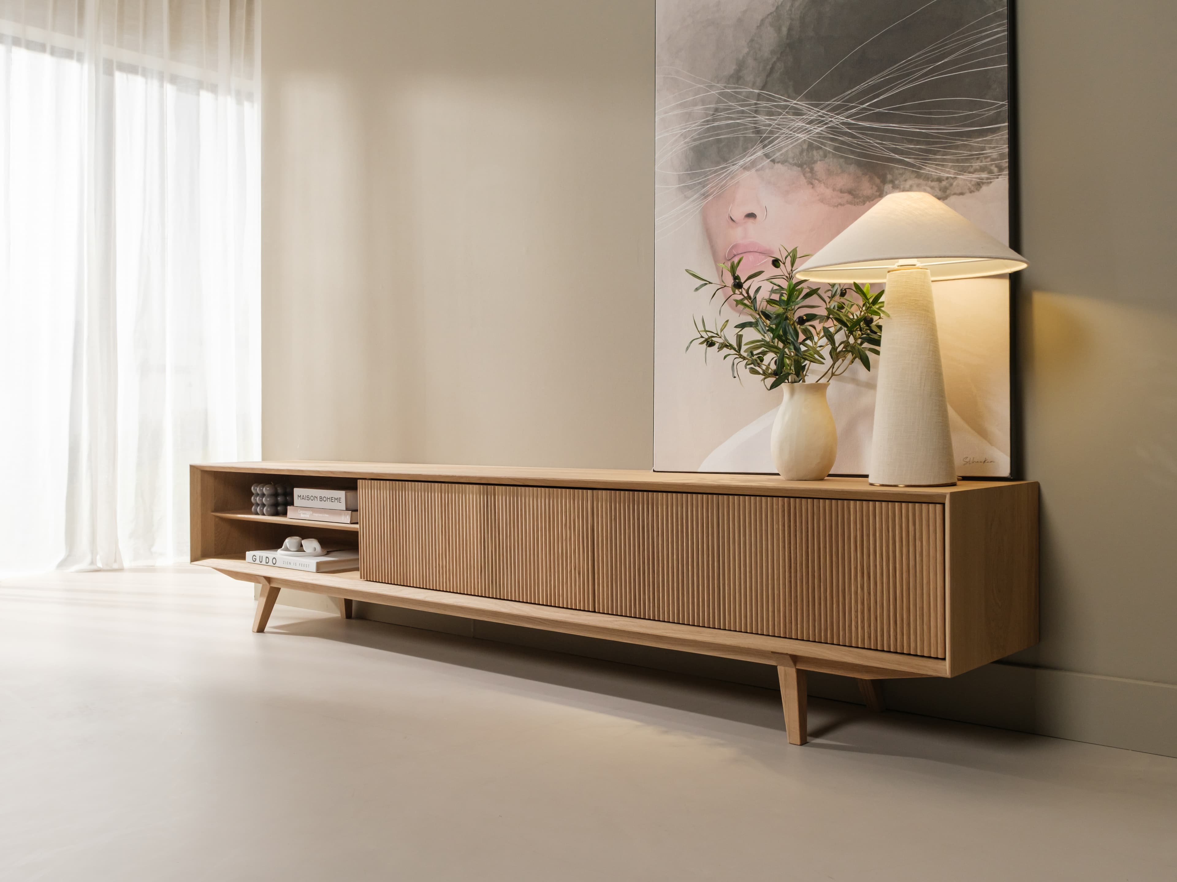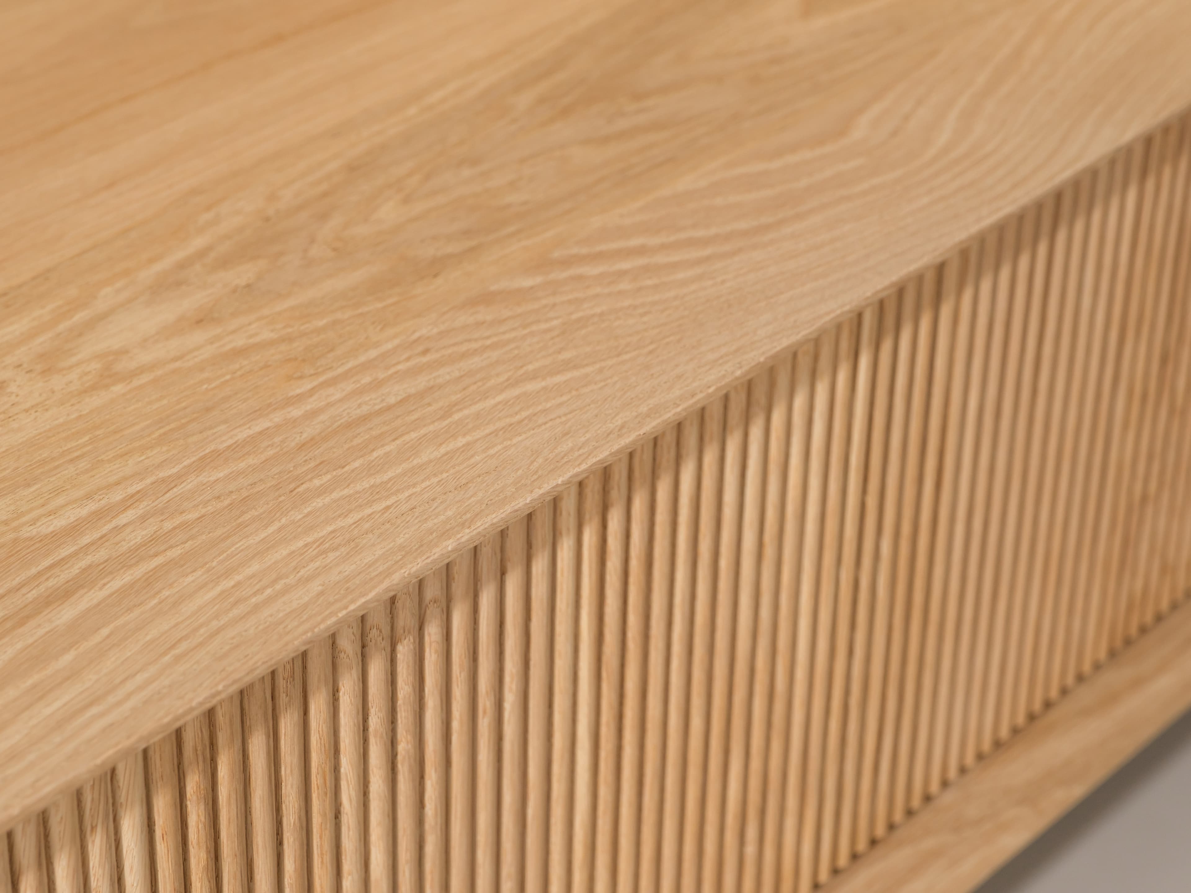 Staand tv meubel uit de Groove serie in naturel eiken. De karakteristieke Groove serie heeft een rijke textuur en een speelse dynamiek. Dit model is uitgevoerd met unieke houten poten, kenmerkende ribbelfronten en een open vak.