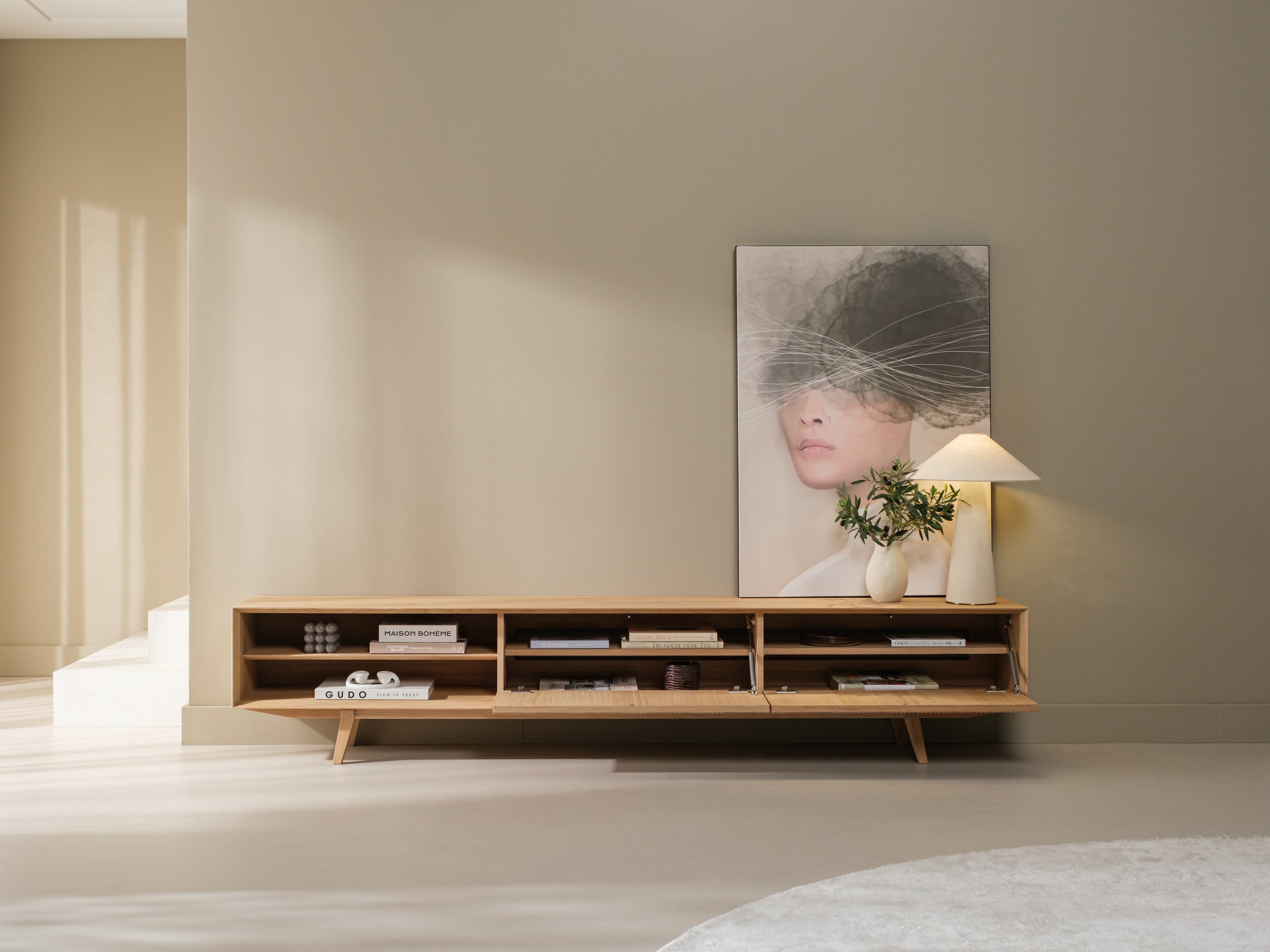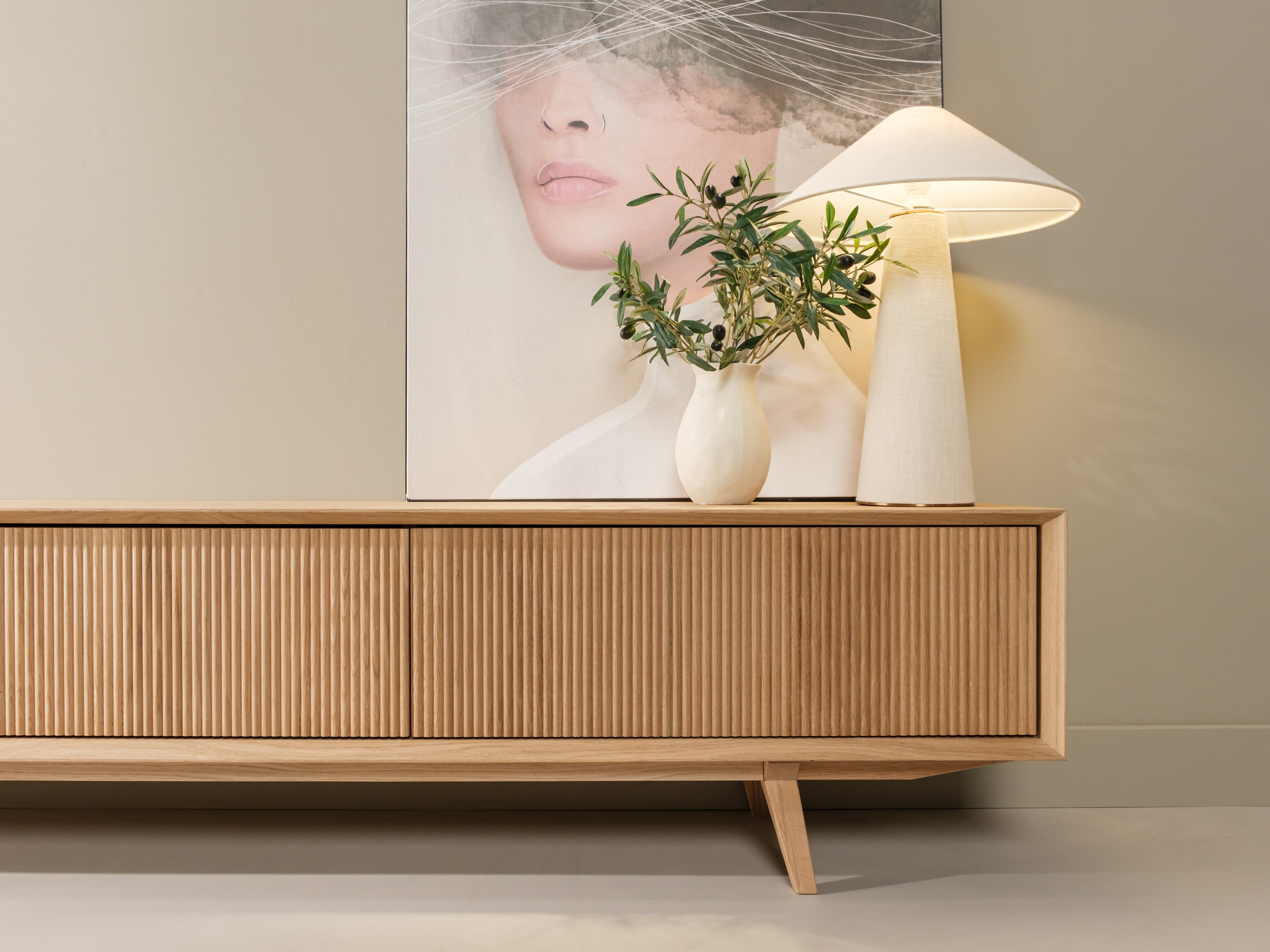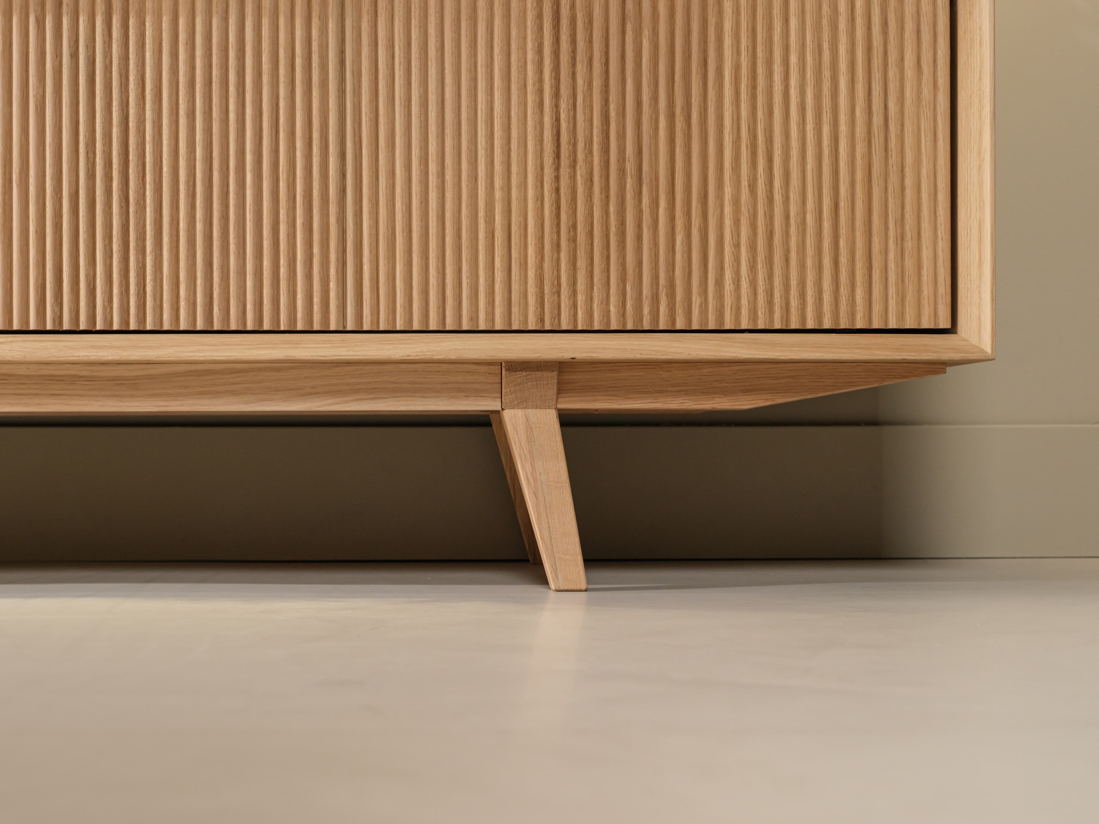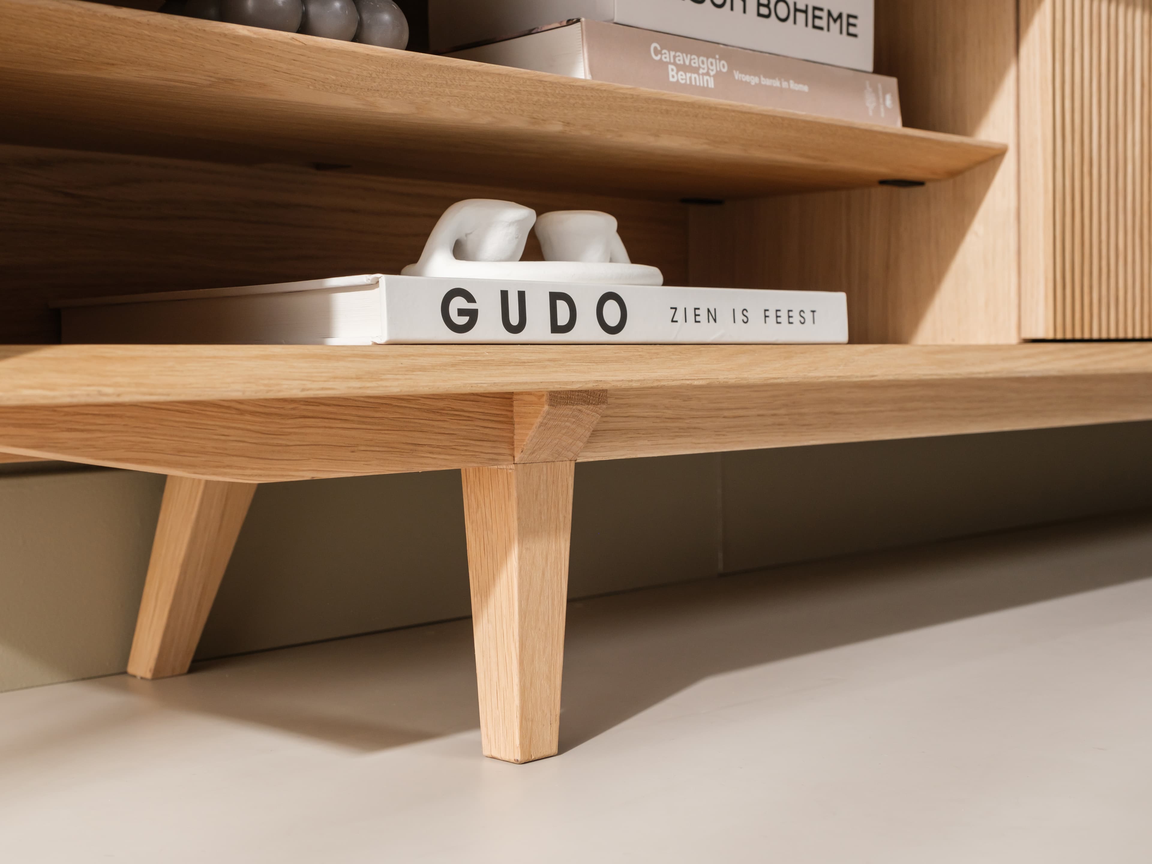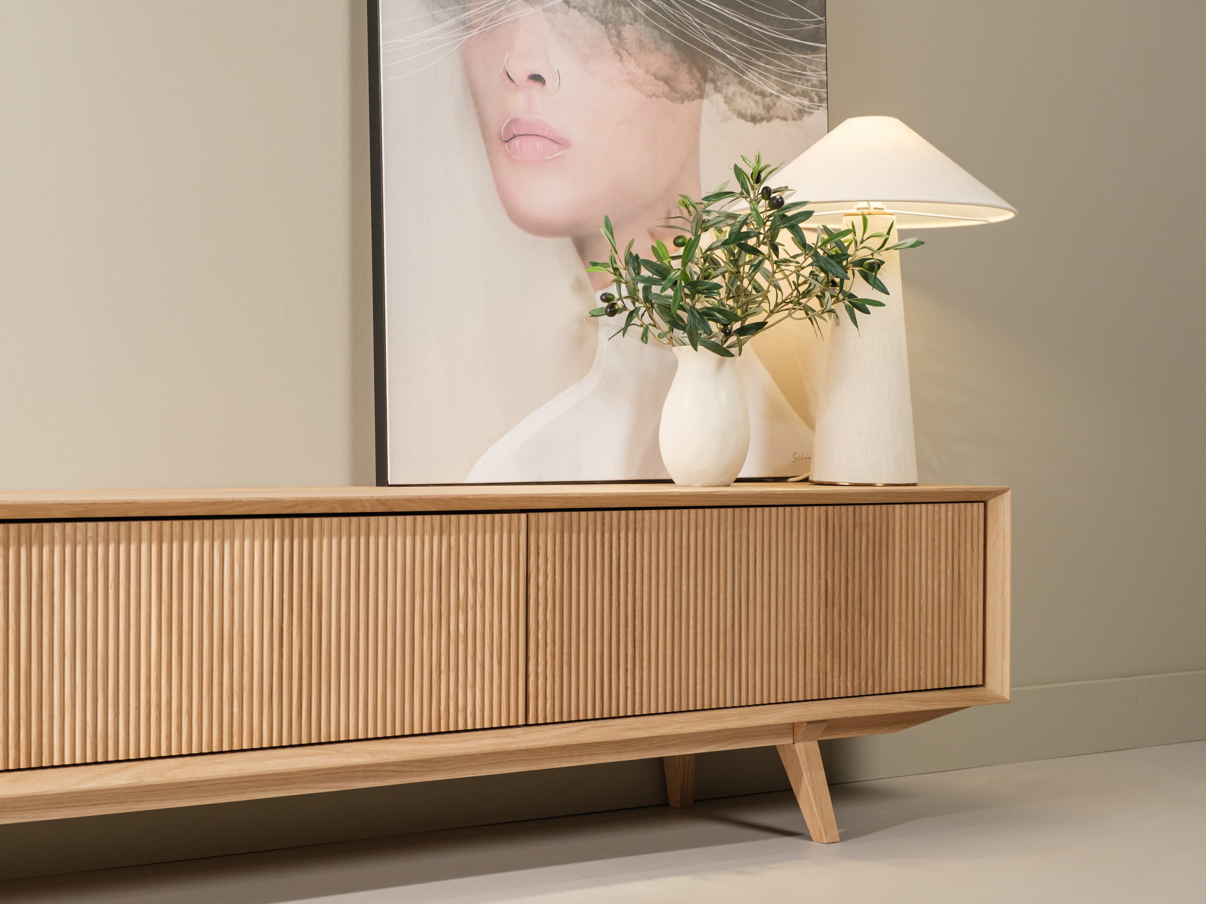 Staand tv meubel uit de Groove serie in naturel eiken. De karakteristieke Groove serie heeft een rijke textuur en een speelse dynamiek. Dit model is uitgevoerd met unieke houten poten, kenmerkende ribbelfronten en een open vak.