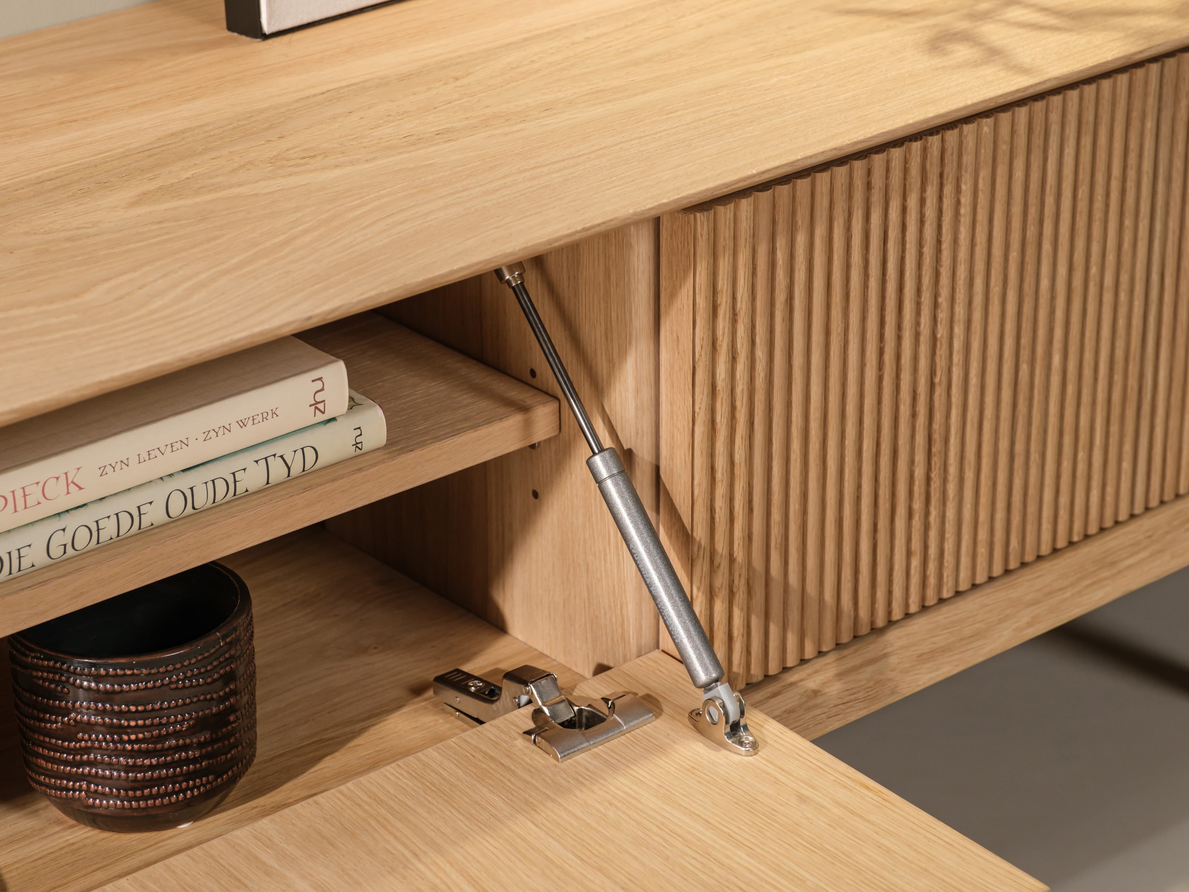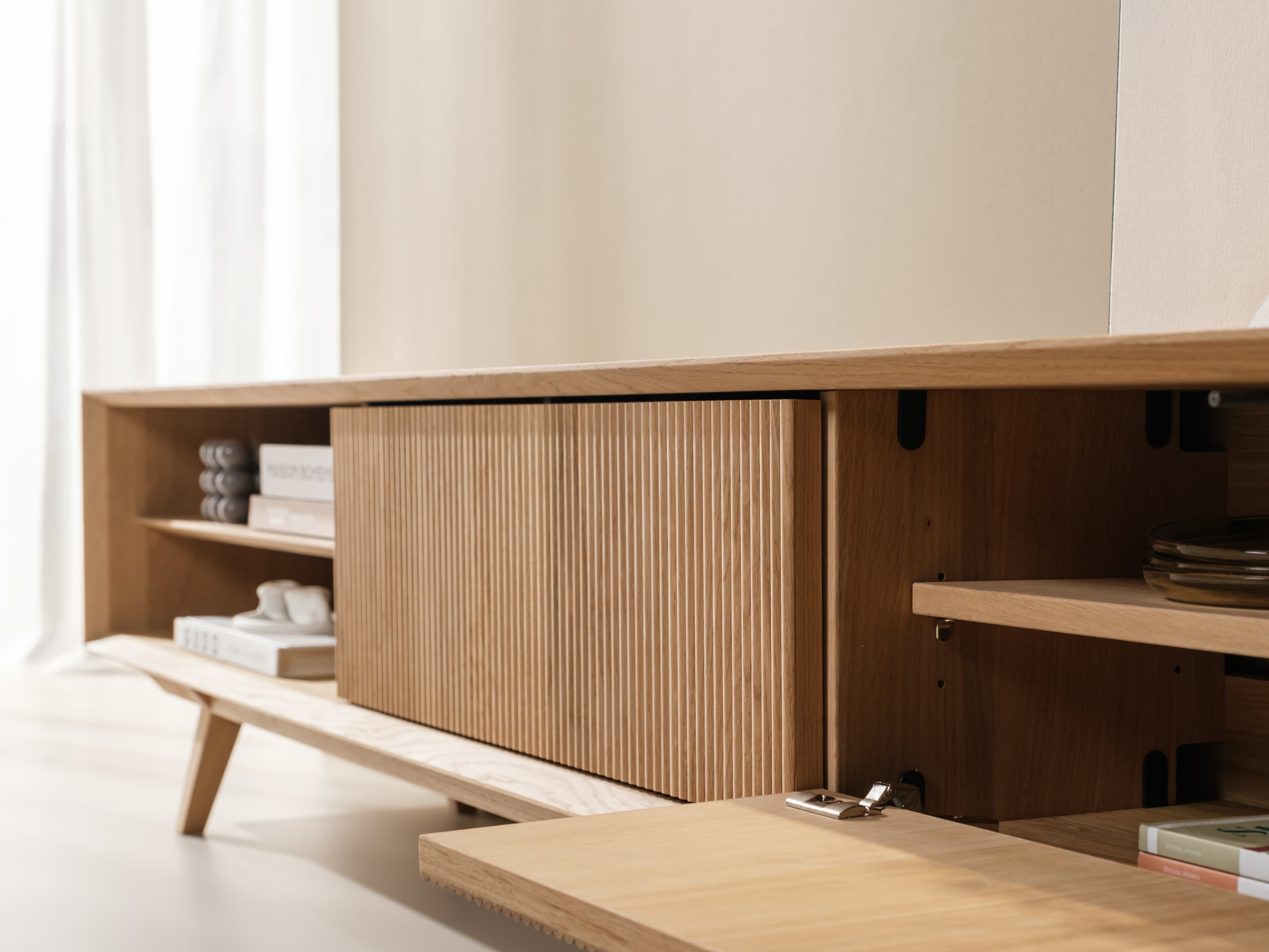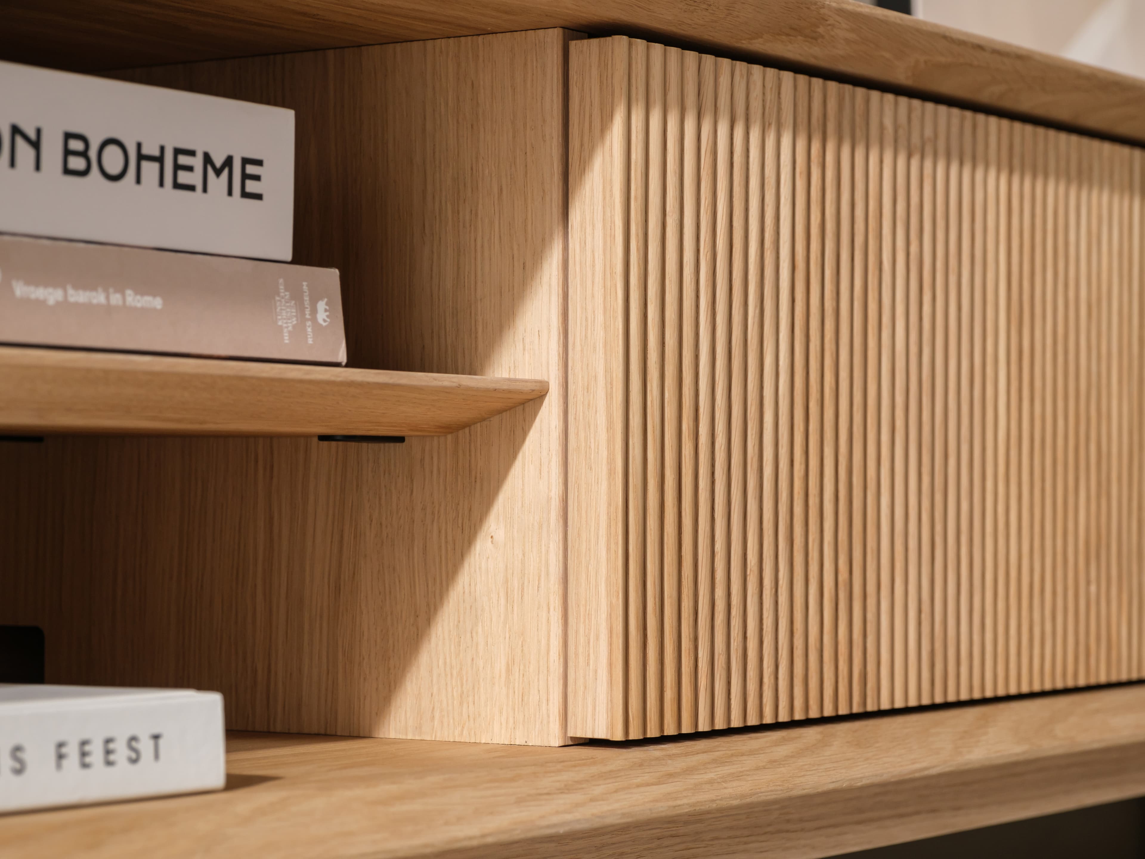 Kenmerkend voor de Groove serie zijn de terugliggende fronten met ribbelpatroon. In combinatie met het open vak krijgt het meubel zijn aantrekkelijke diepte en ruimtelijkheid. Daarnaast biedt het open vak een ideale opbergplek voor bijvoorbeeld boeken, tijdschriften of een afstandsbediening.