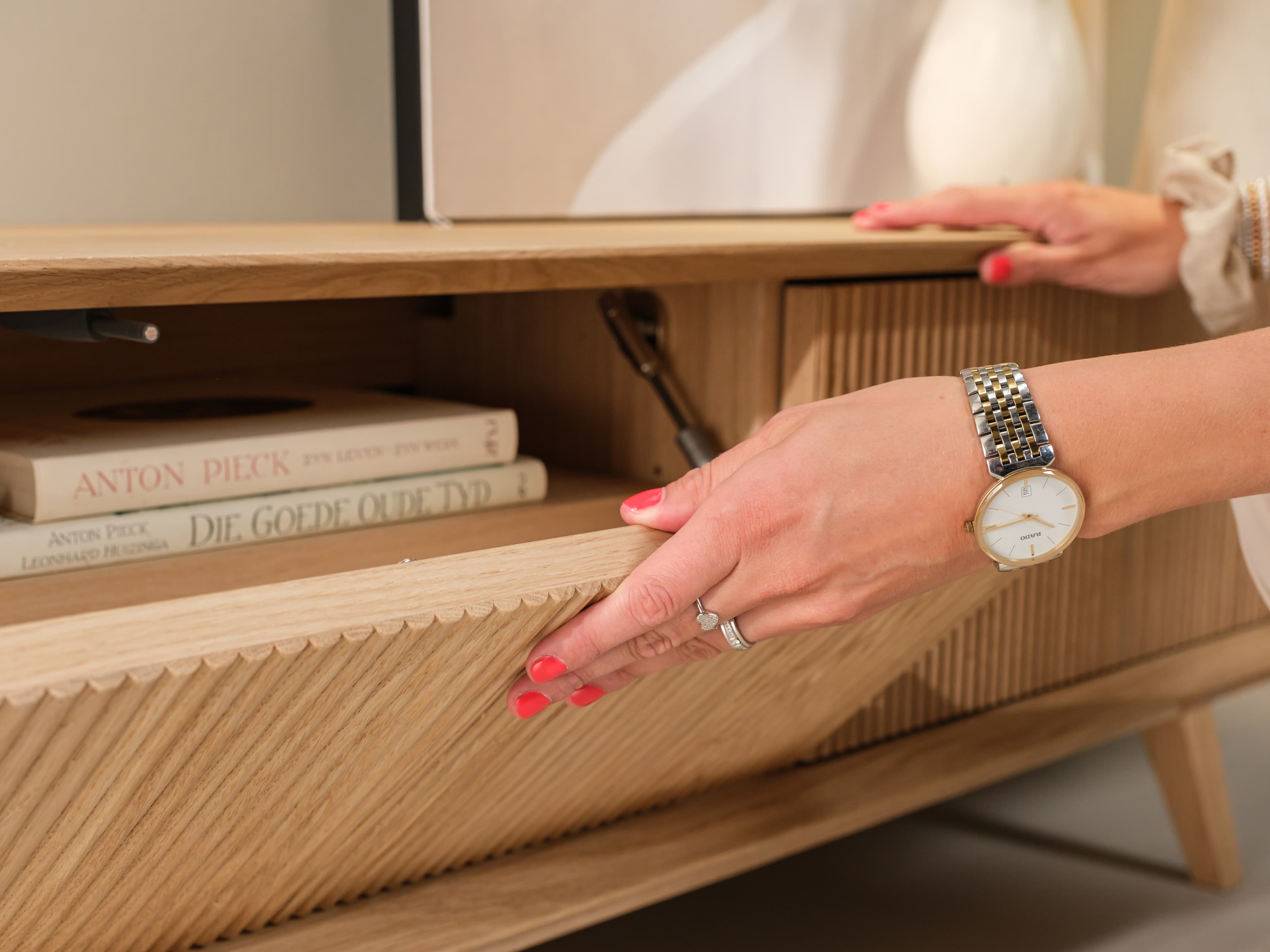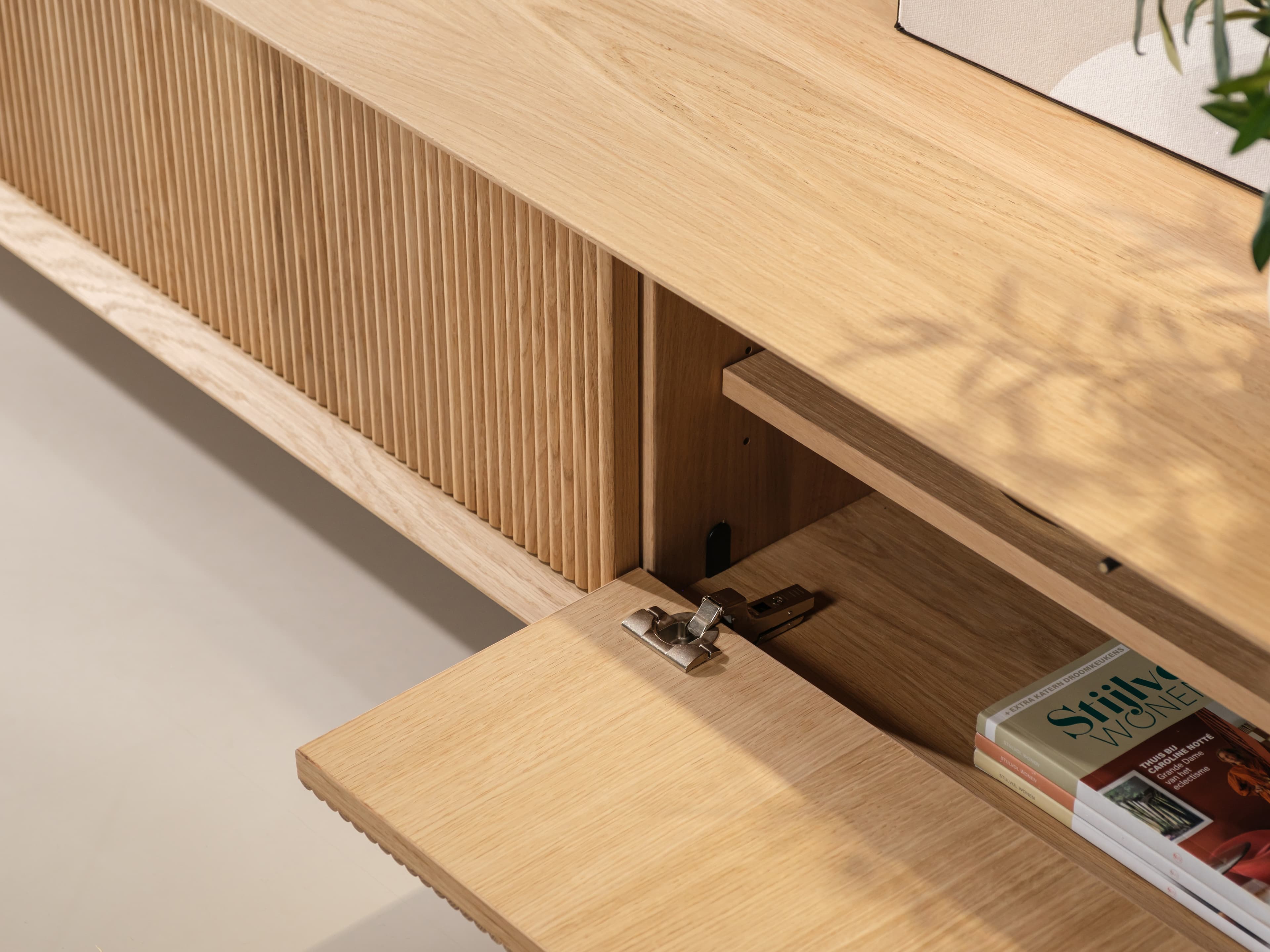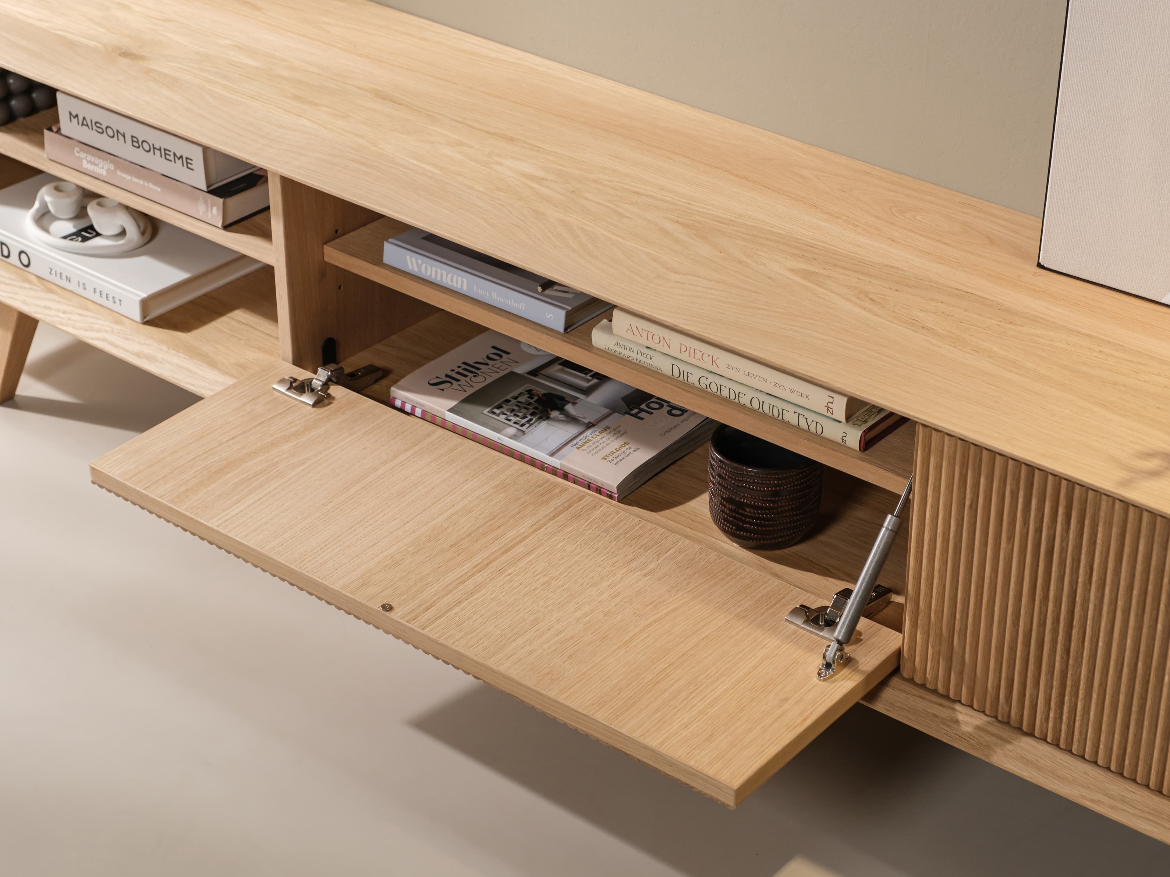Kenmerkend voor de Groove serie zijn de terugliggende fronten met ribbelpatroon. In combinatie met het open vak krijgt het meubel zijn aantrekkelijke diepte en ruimtelijkheid. Daarnaast biedt het open vak een ideale opbergplek voor bijvoorbeeld boeken, tijdschriften of een afstandsbediening.