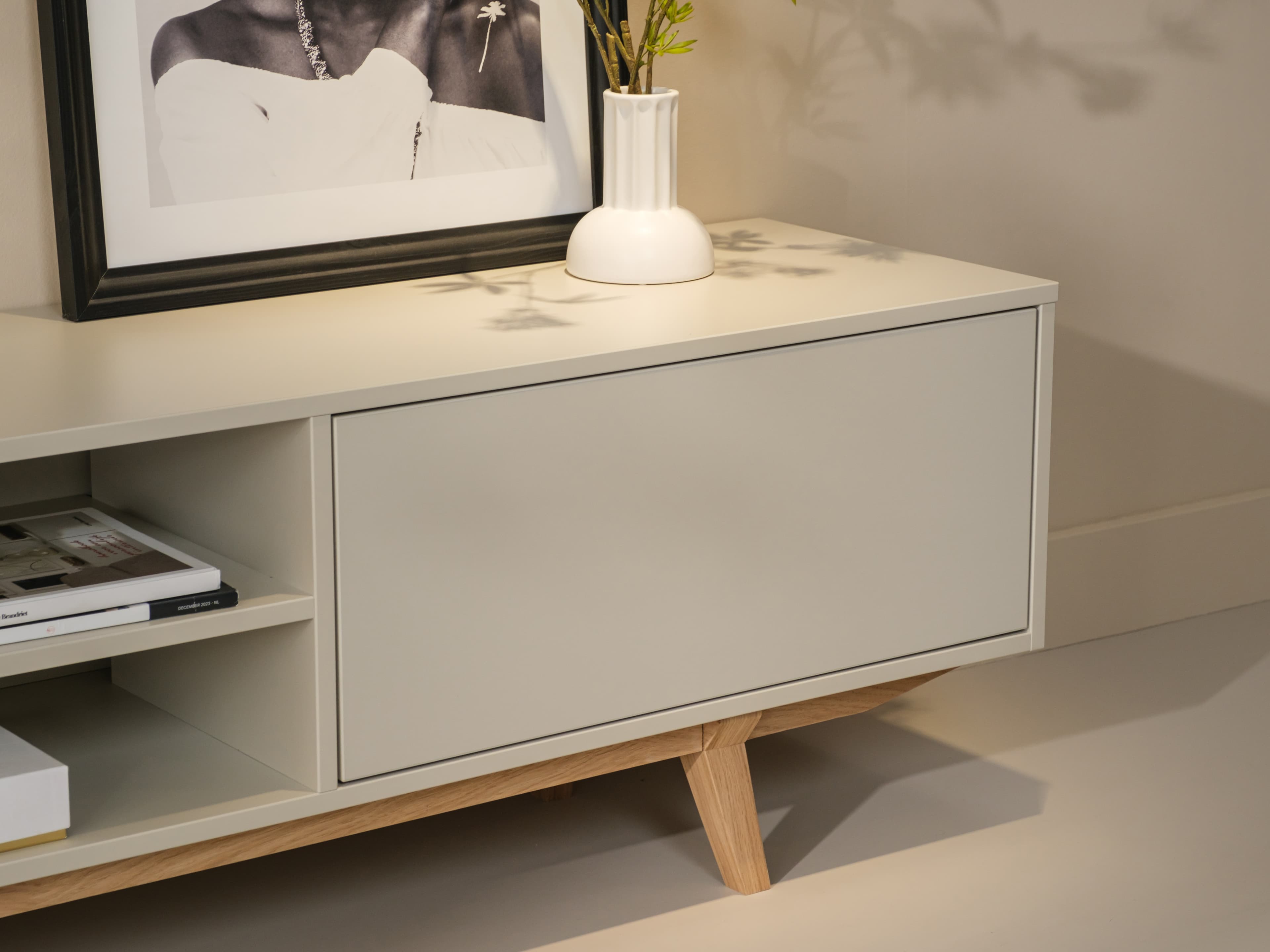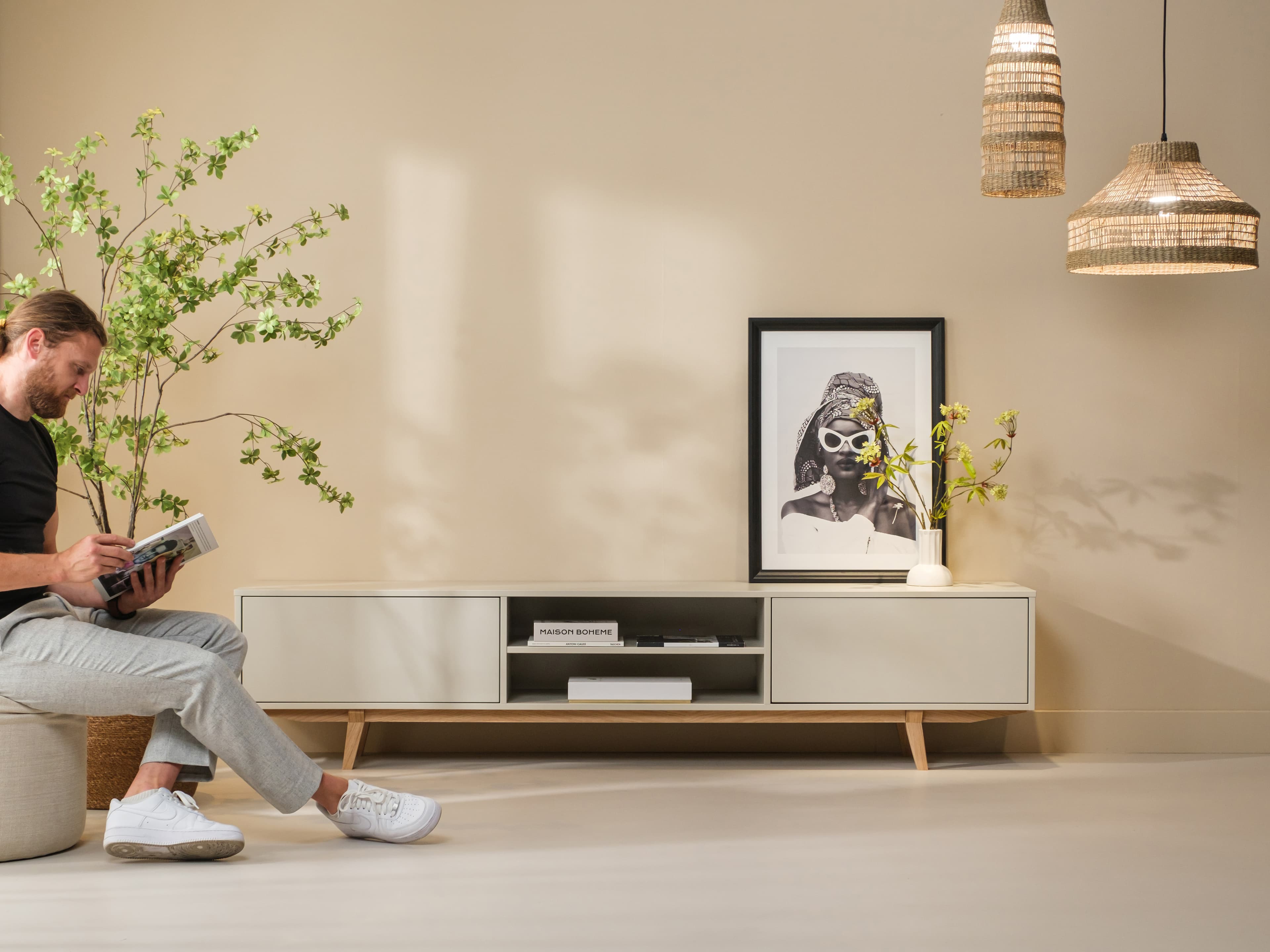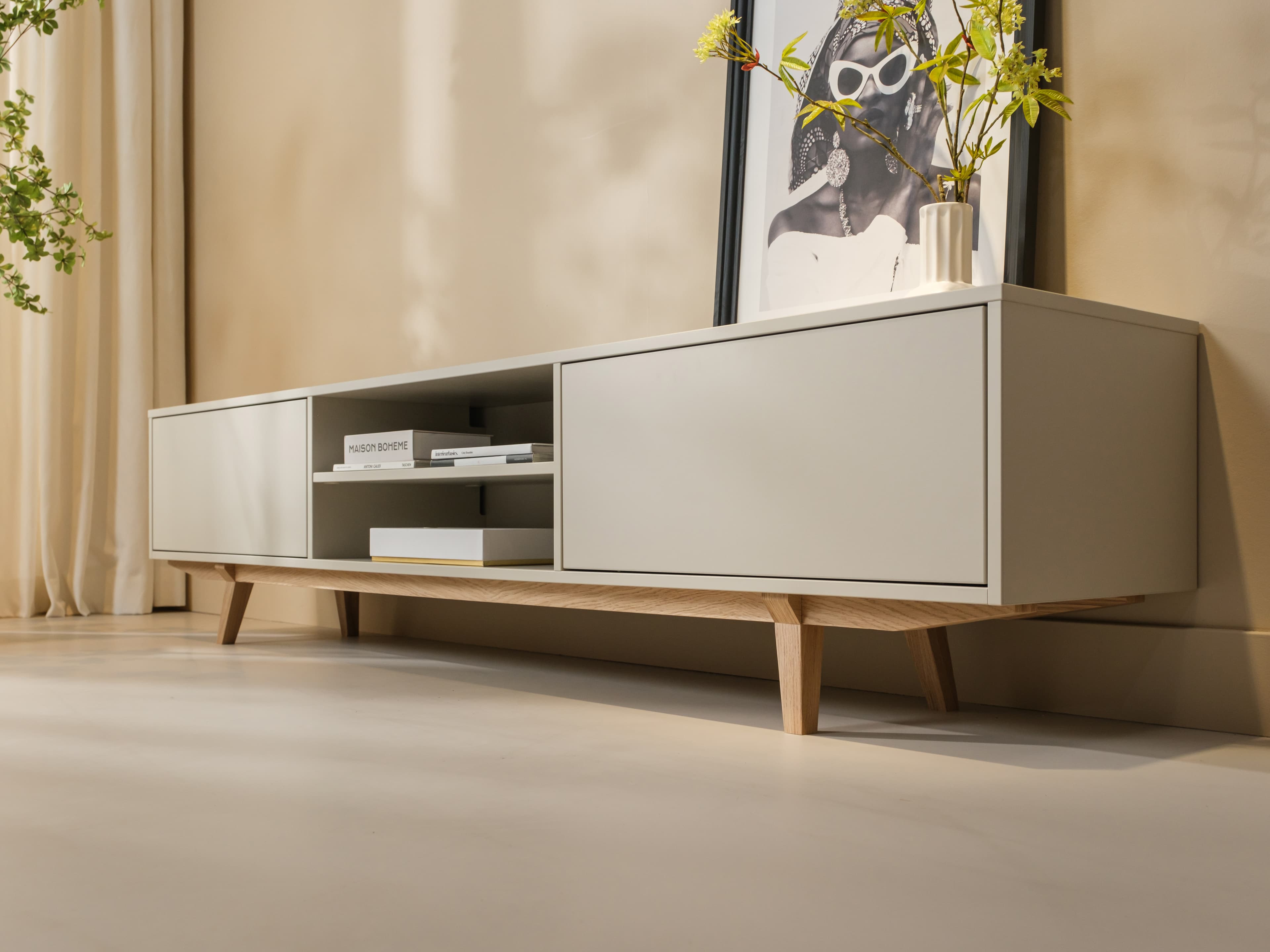 Tv meubel uit de Style serie met een onderstel van houten poten. Een toegankelijk maatwerk Style tv meubel van Monoz is een prachtige aanvulling op je interieur.