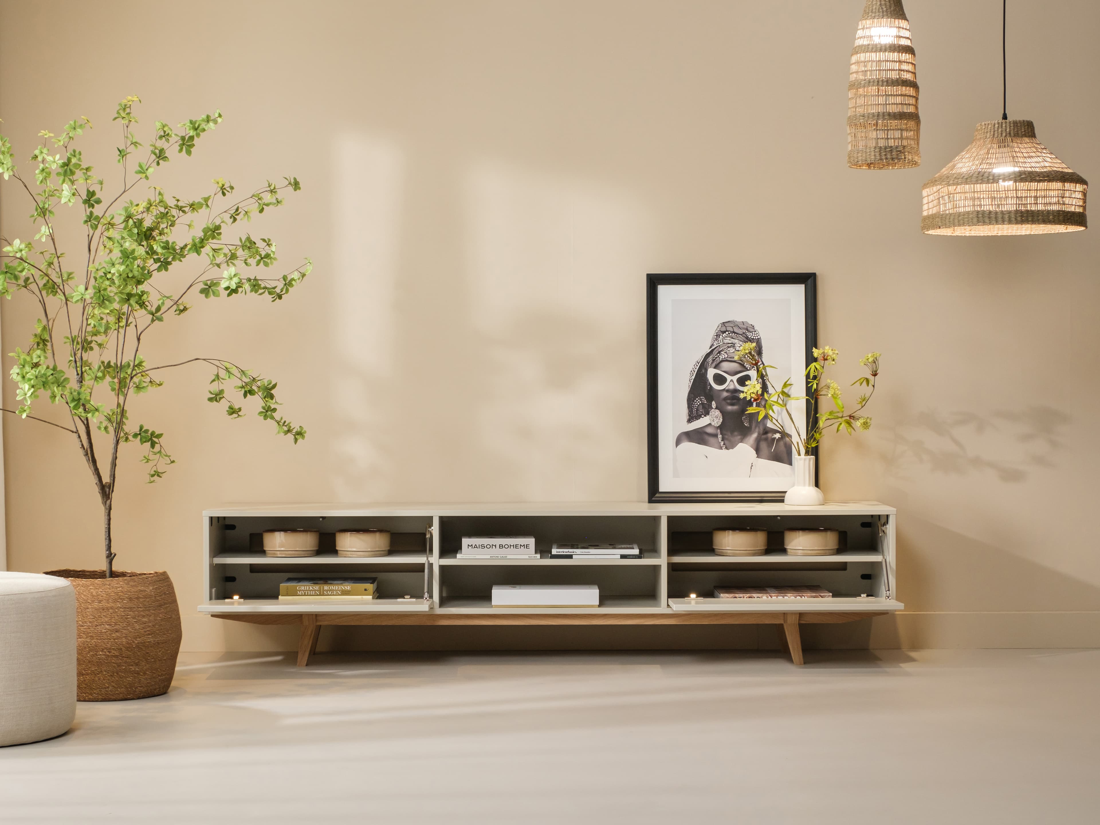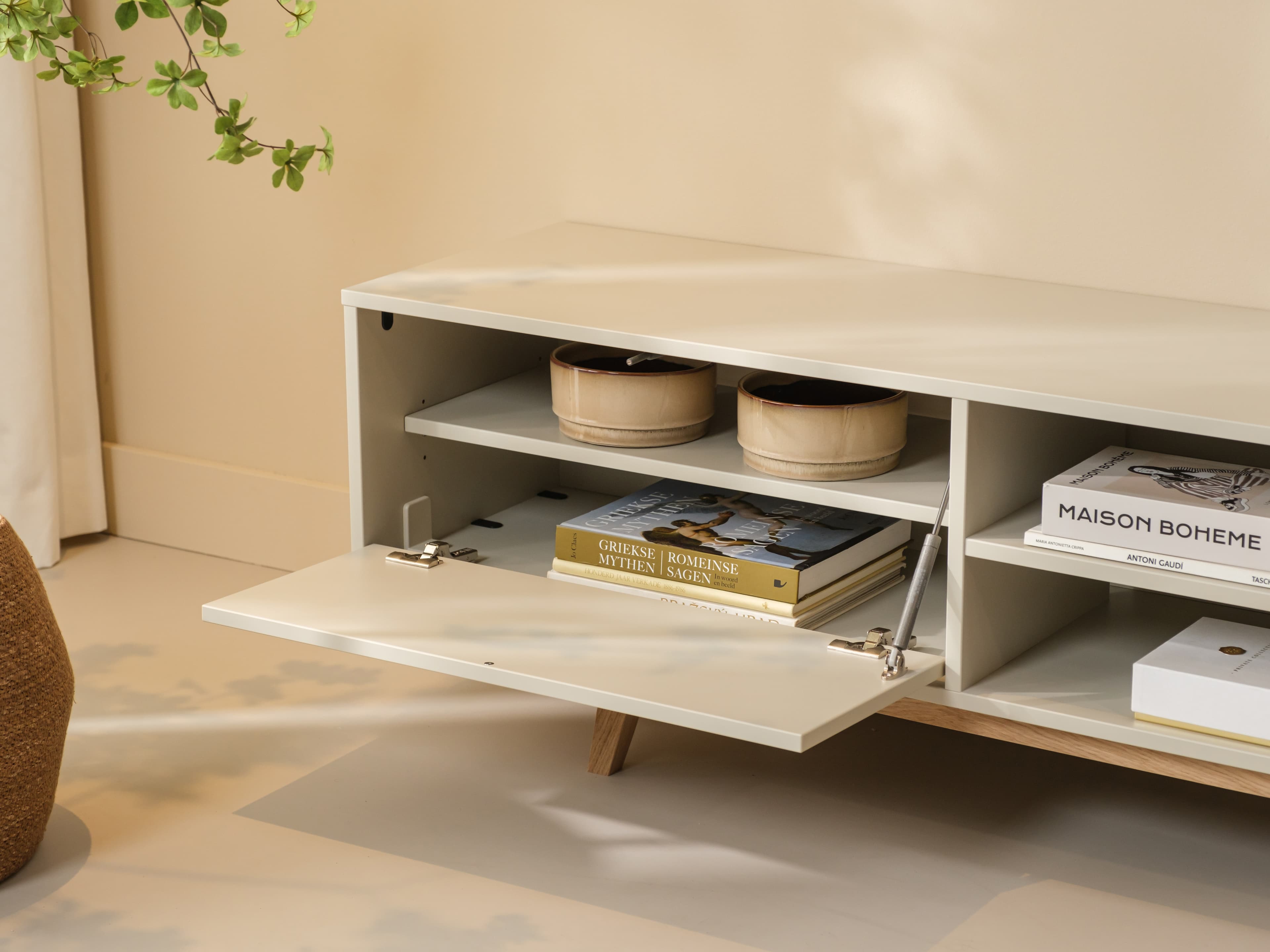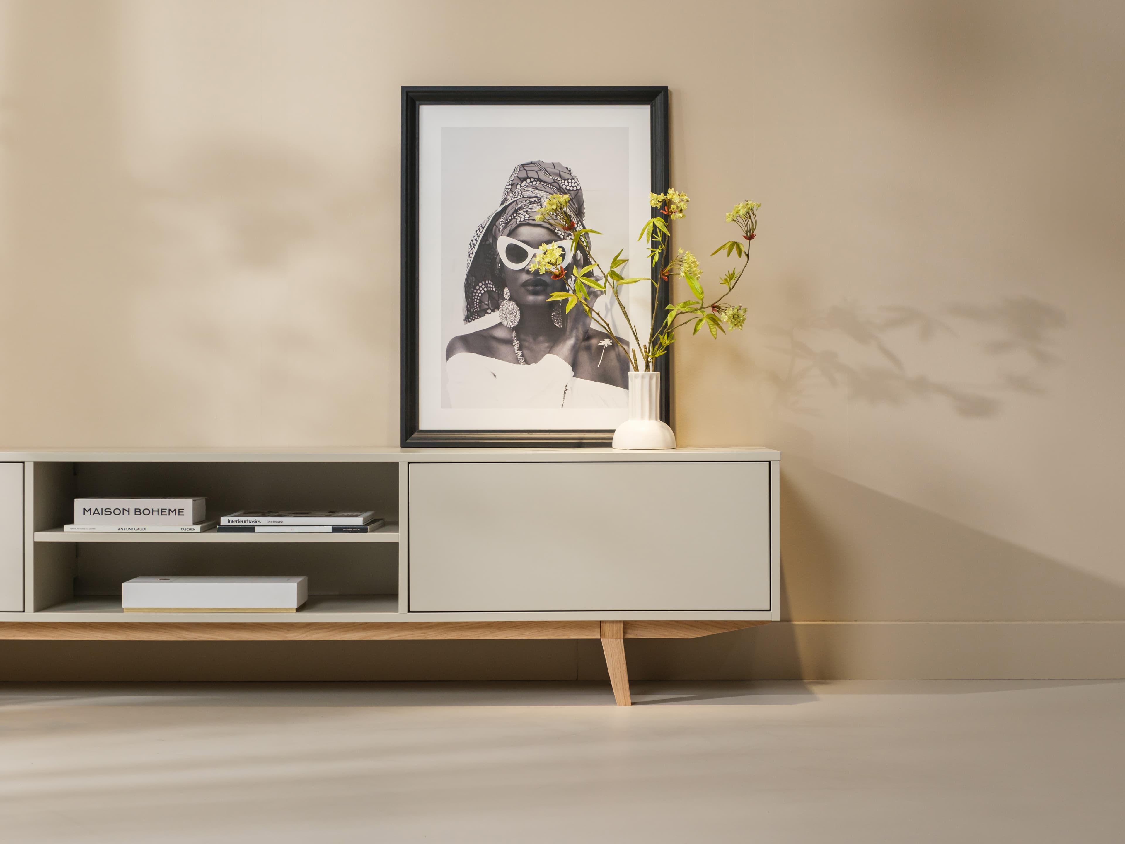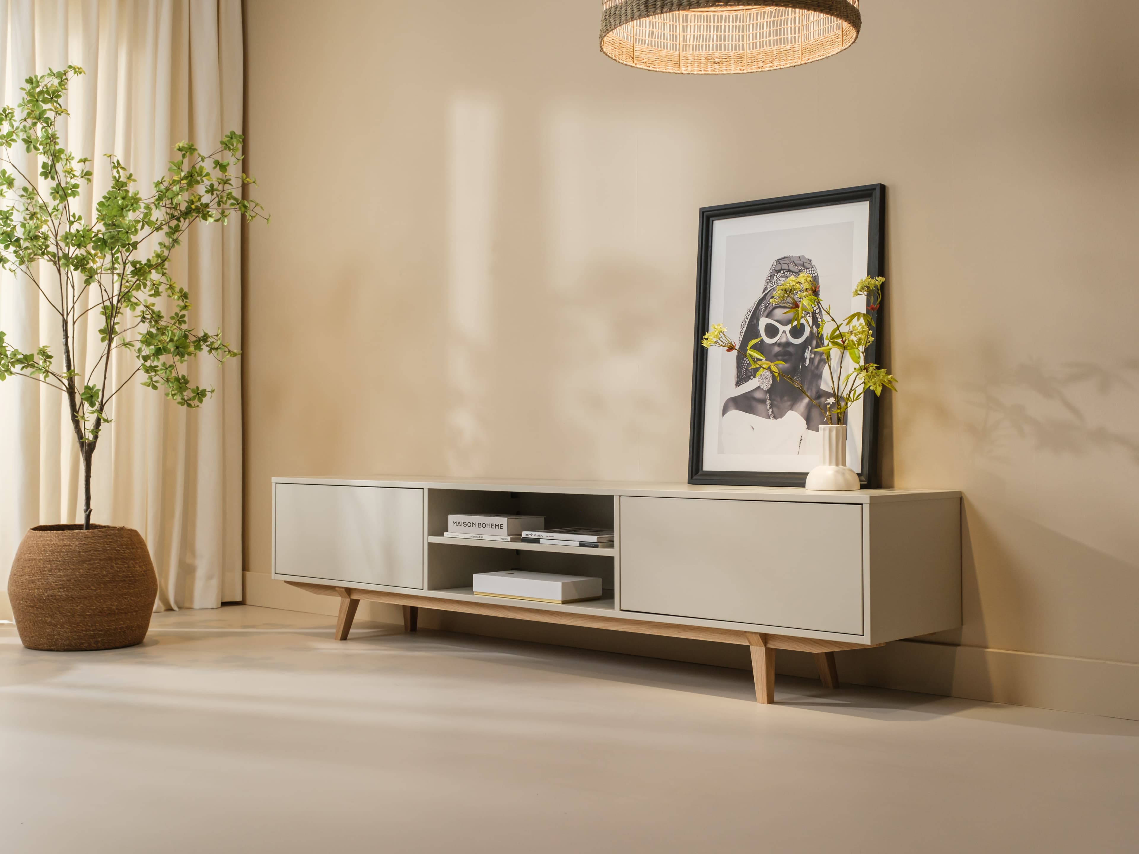 Tv meubel uit de Style serie met een onderstel van houten poten. Een toegankelijk maatwerk Style tv meubel van Monoz is een prachtige aanvulling op je interieur.