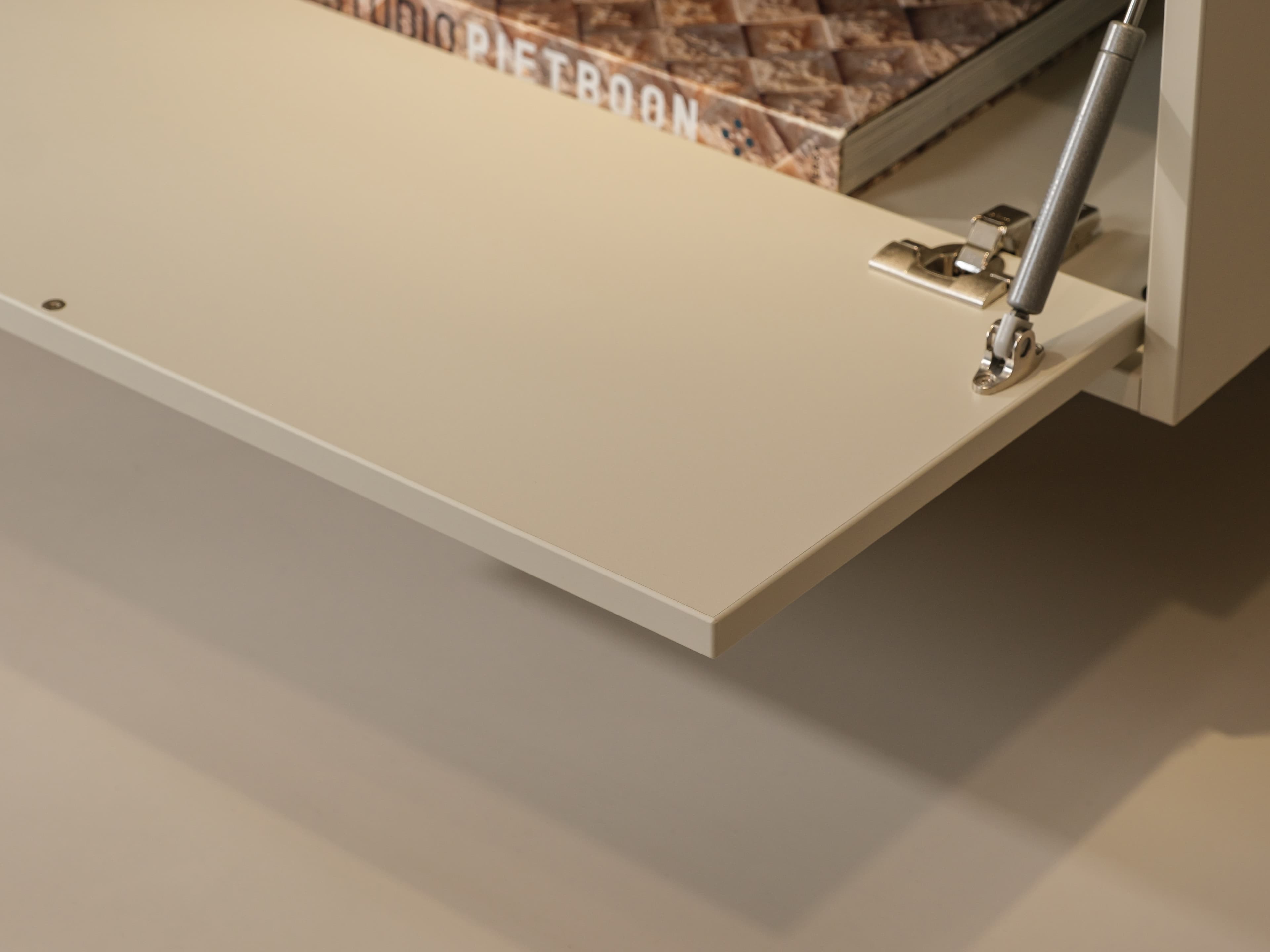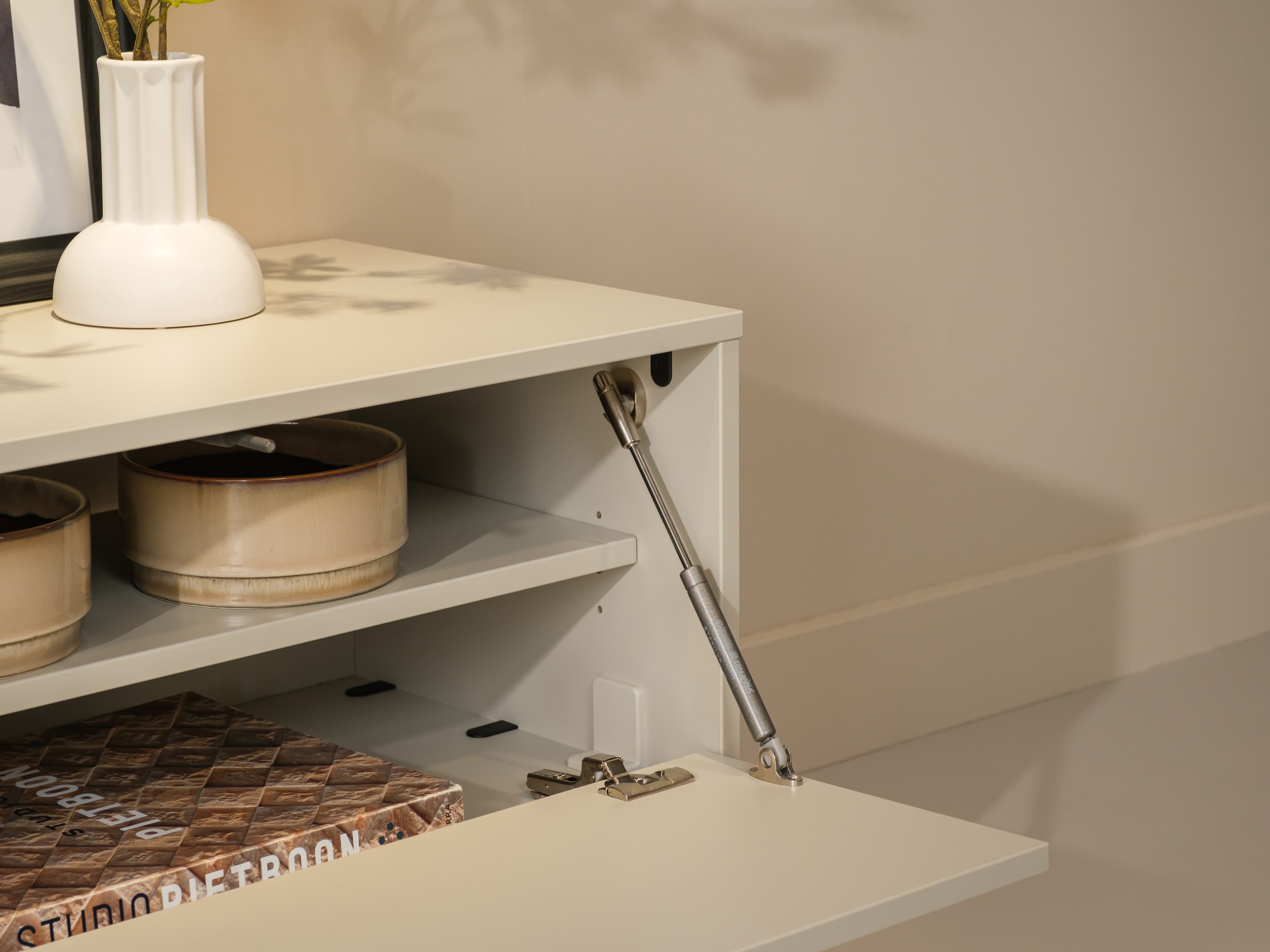 Het tv meubel is in formaat en indeling eenvoudig naar wens aanpasbaar. Kies je favoriet uit één van de zes stijlvolle kleuren. Het meubel is ook met chique zwarte poten, staand op een plint en zwevend mogelijk.