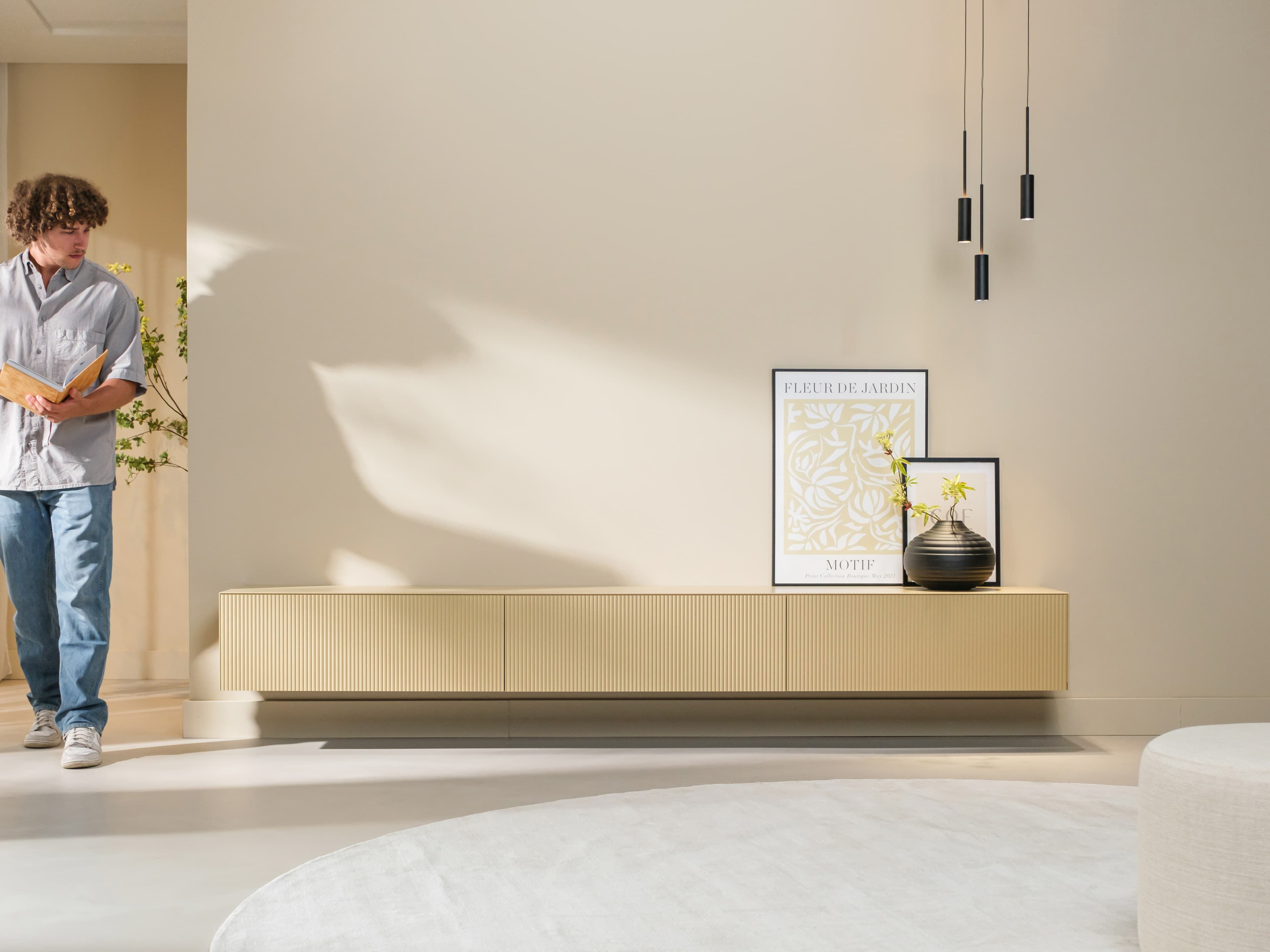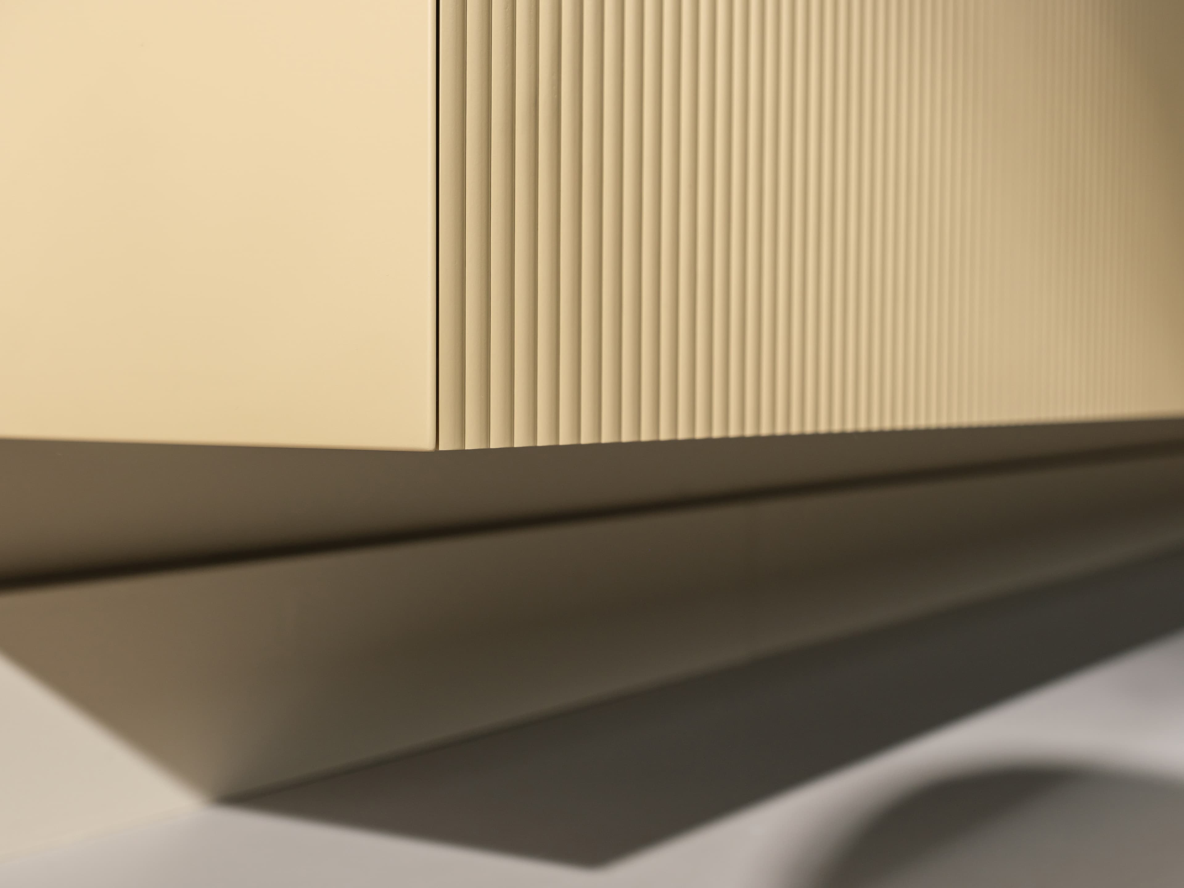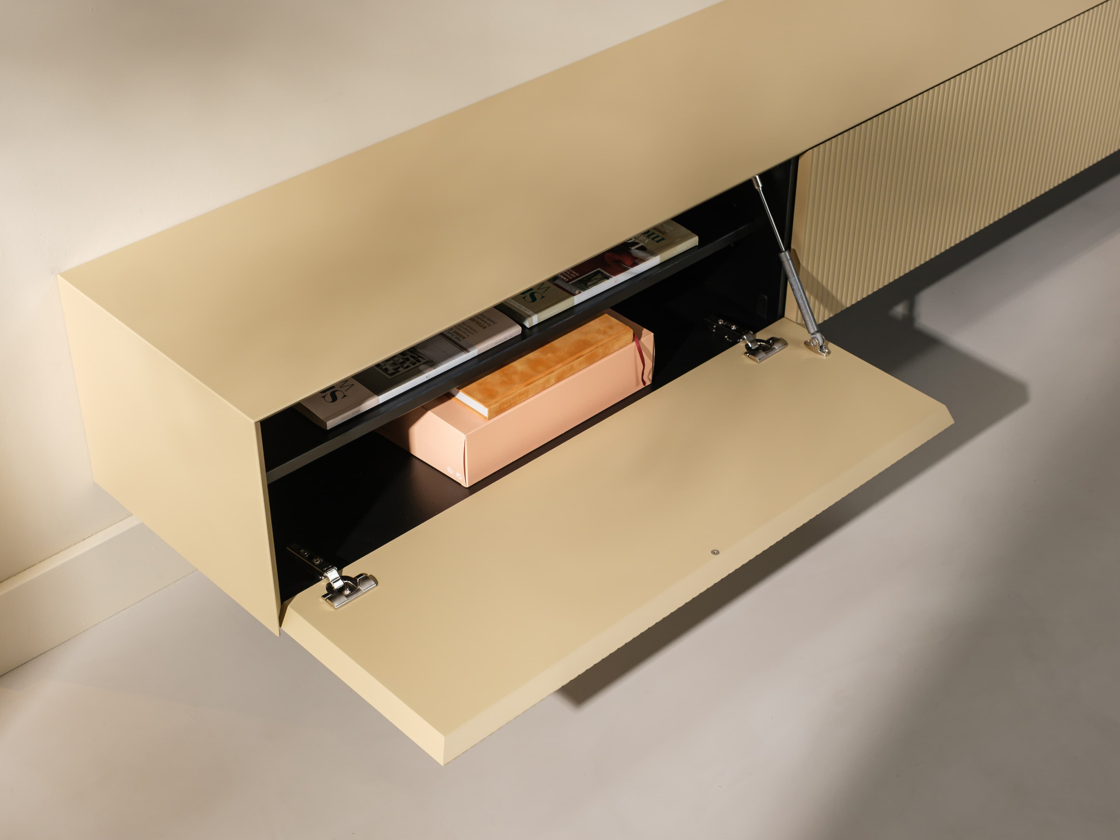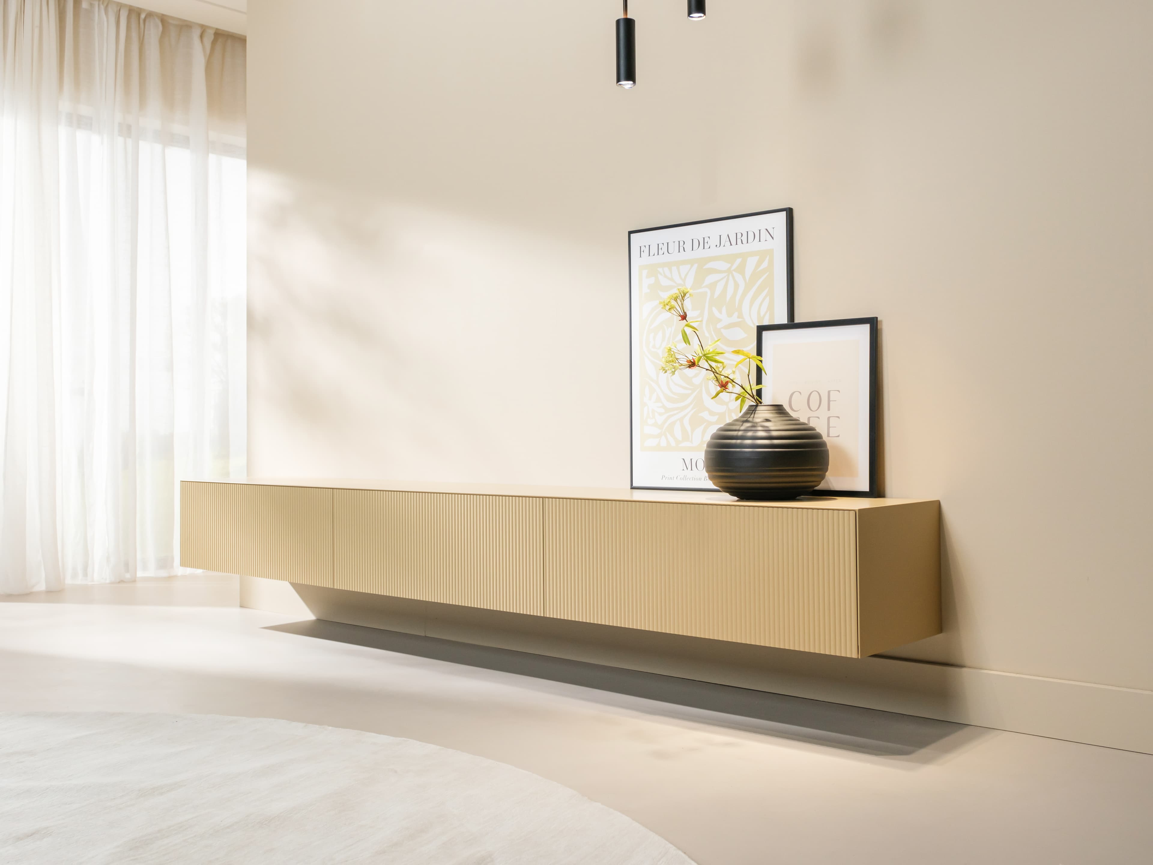 Zwevend tv meubel uit de Excellent serie. Dit model is gespoten in een unieke kleur en uitgevoerd met ribbelfronten. Kenmerkend zijn de stijlvolle slanke lijnen en perfect afgewerkte details.