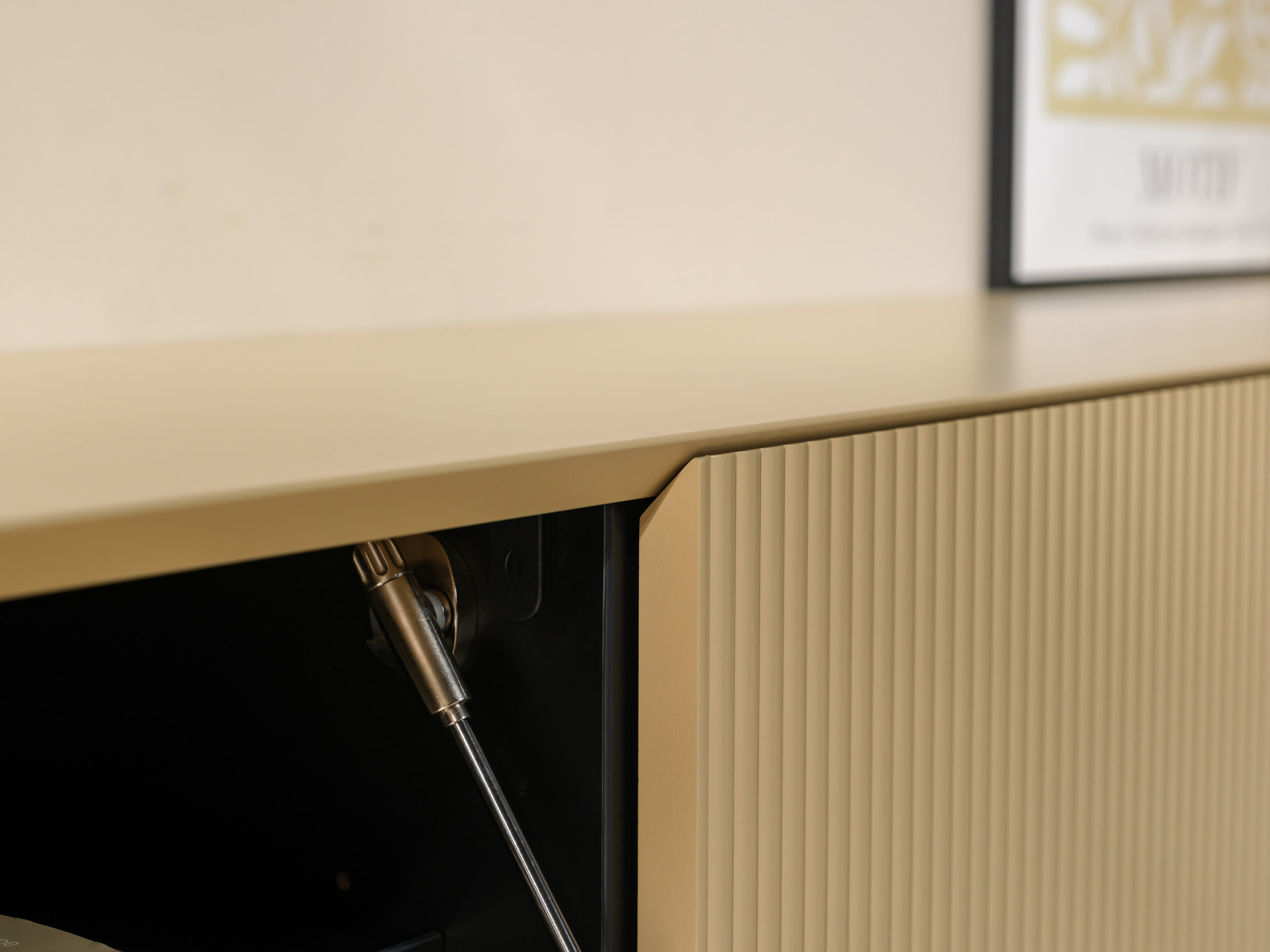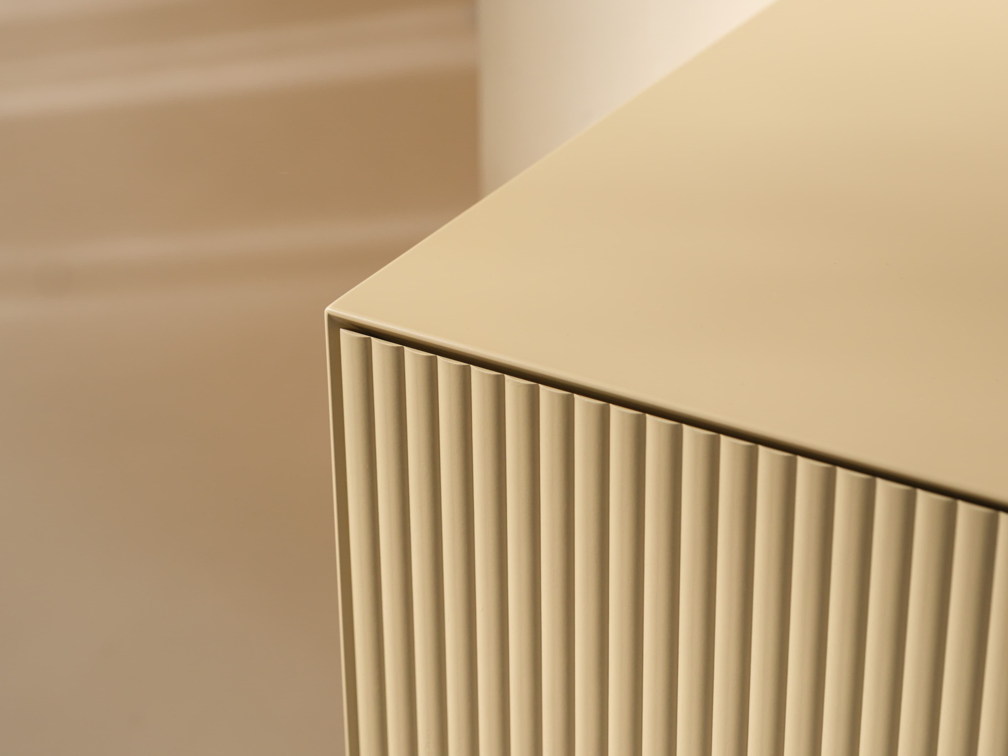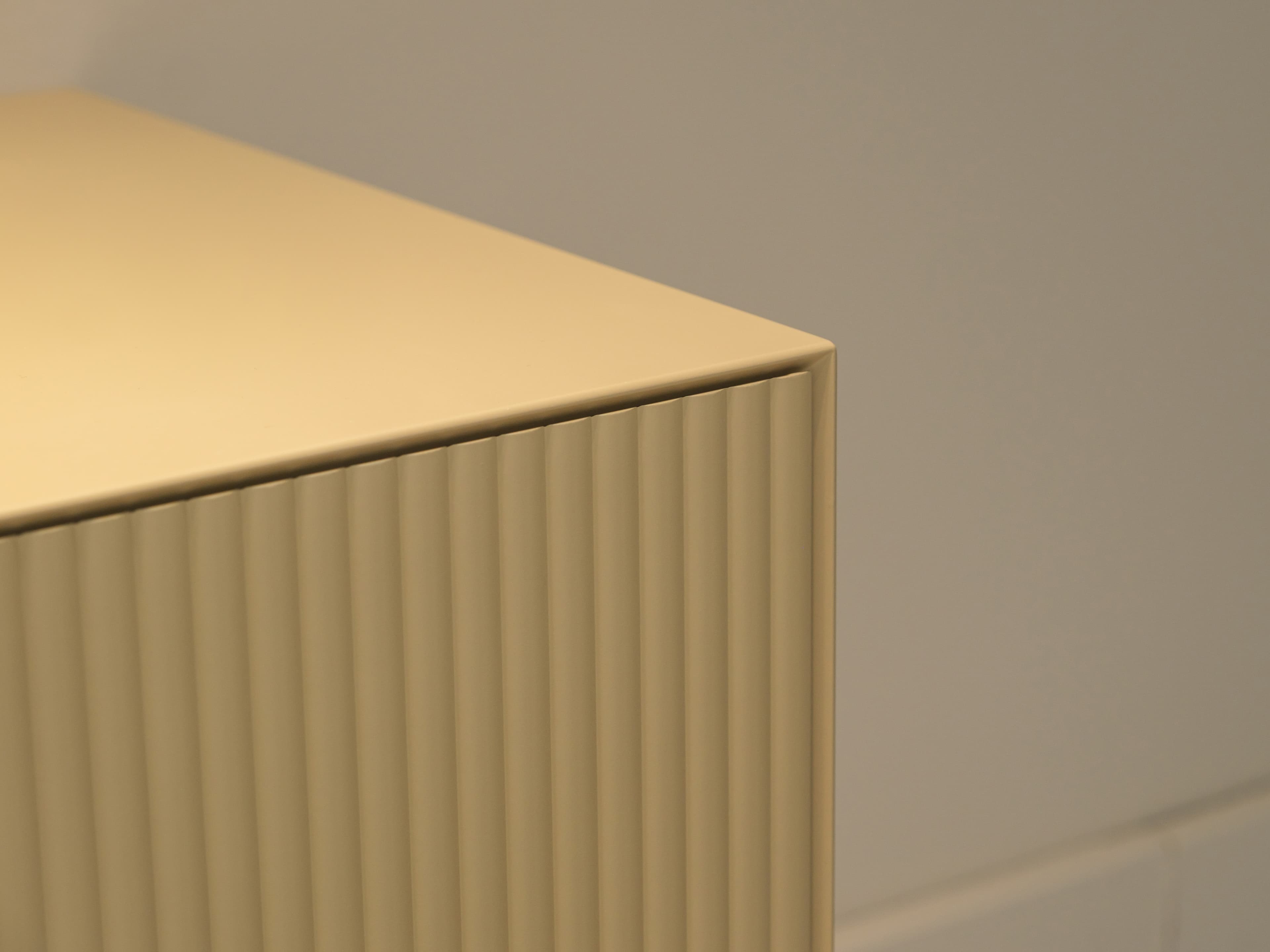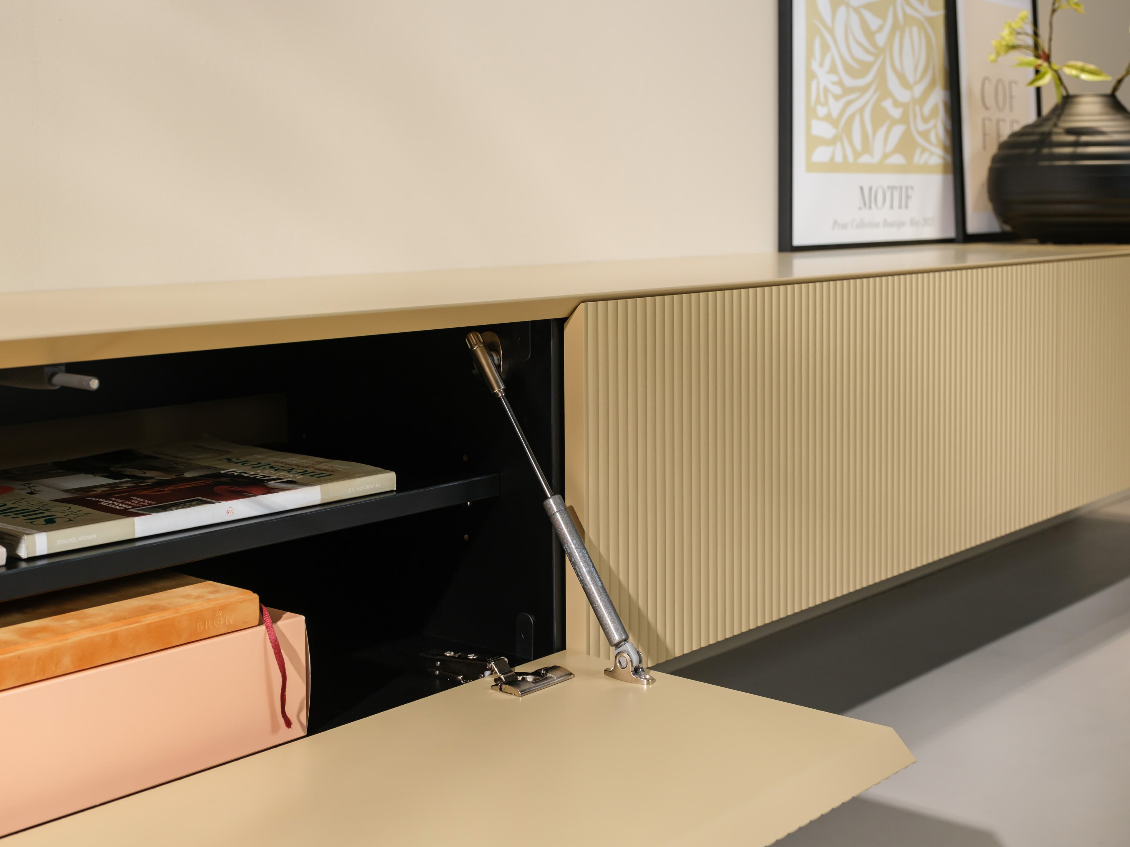 Zwevend tv meubel uit de Excellent serie. Dit model is gespoten in een unieke kleur en uitgevoerd met ribbelfronten. Kenmerkend zijn de stijlvolle slanke lijnen en perfect afgewerkte details.