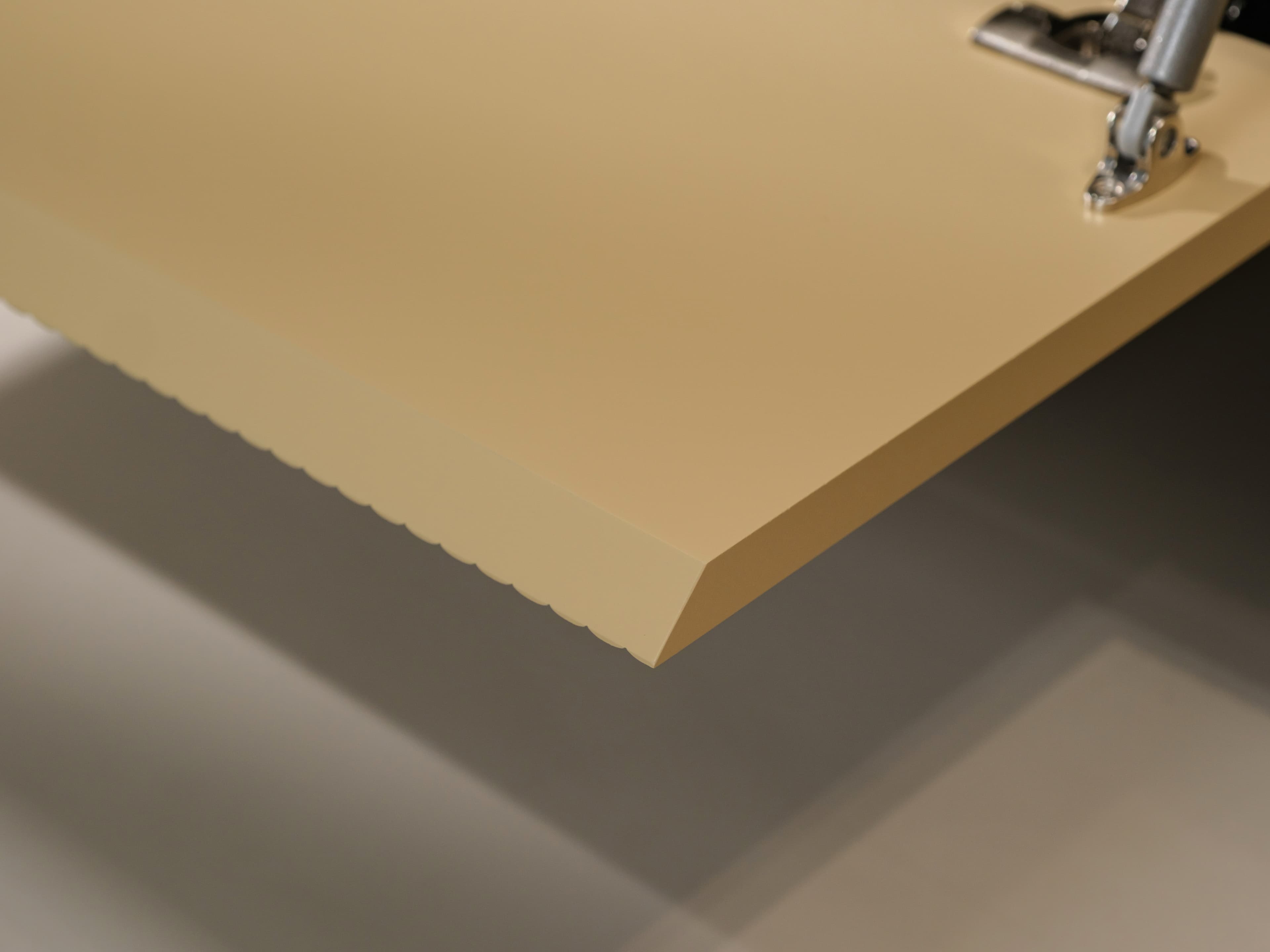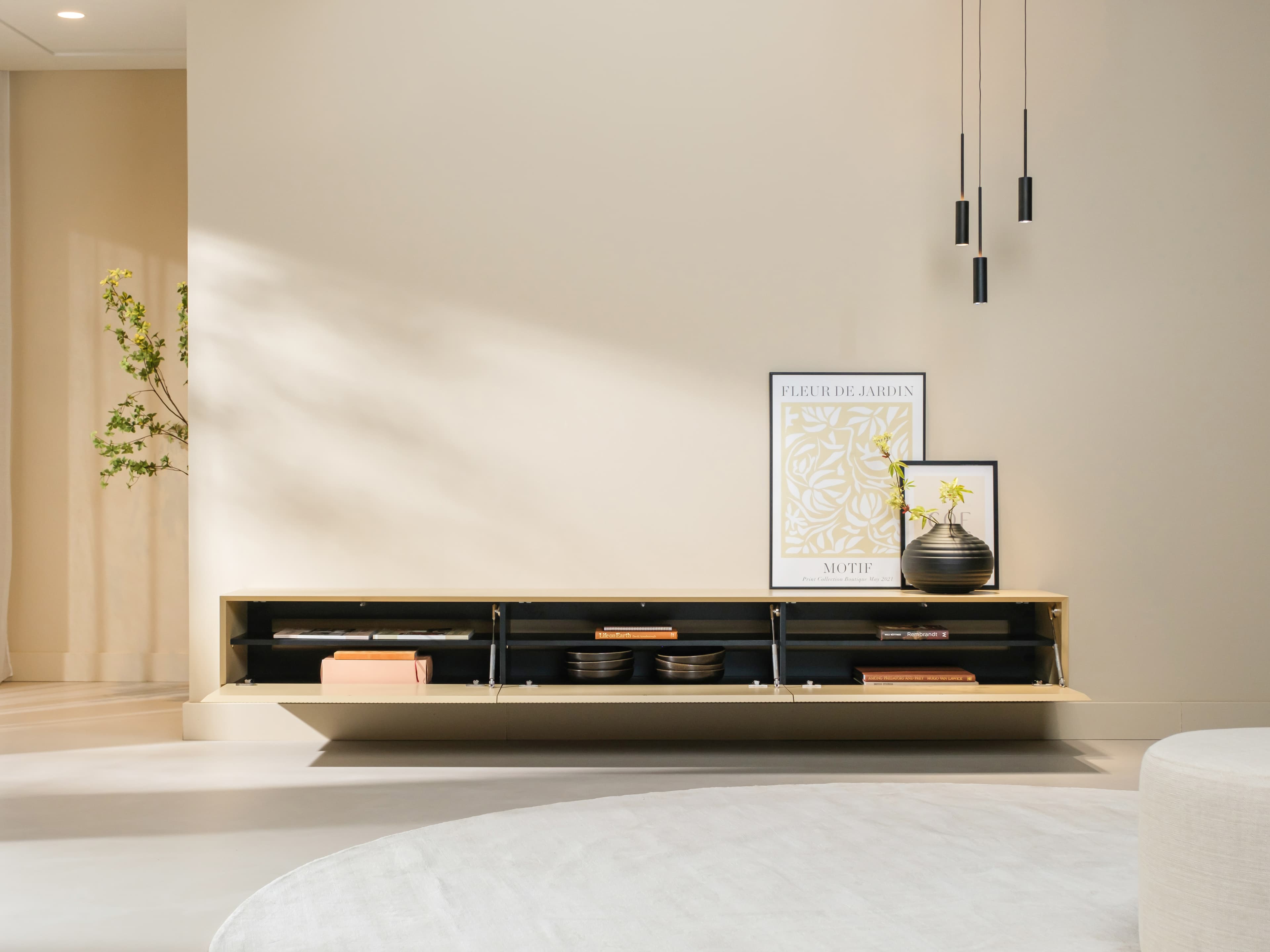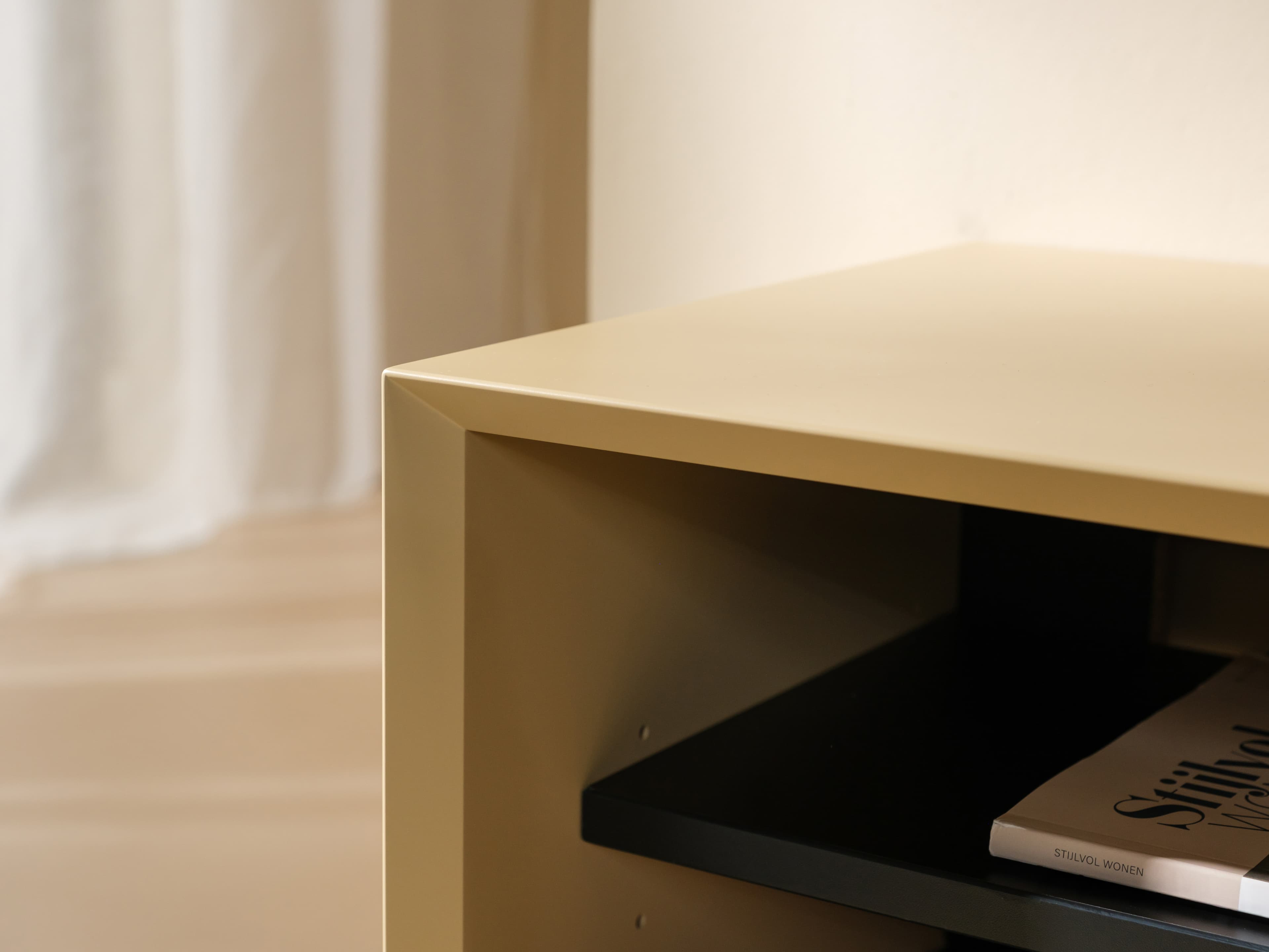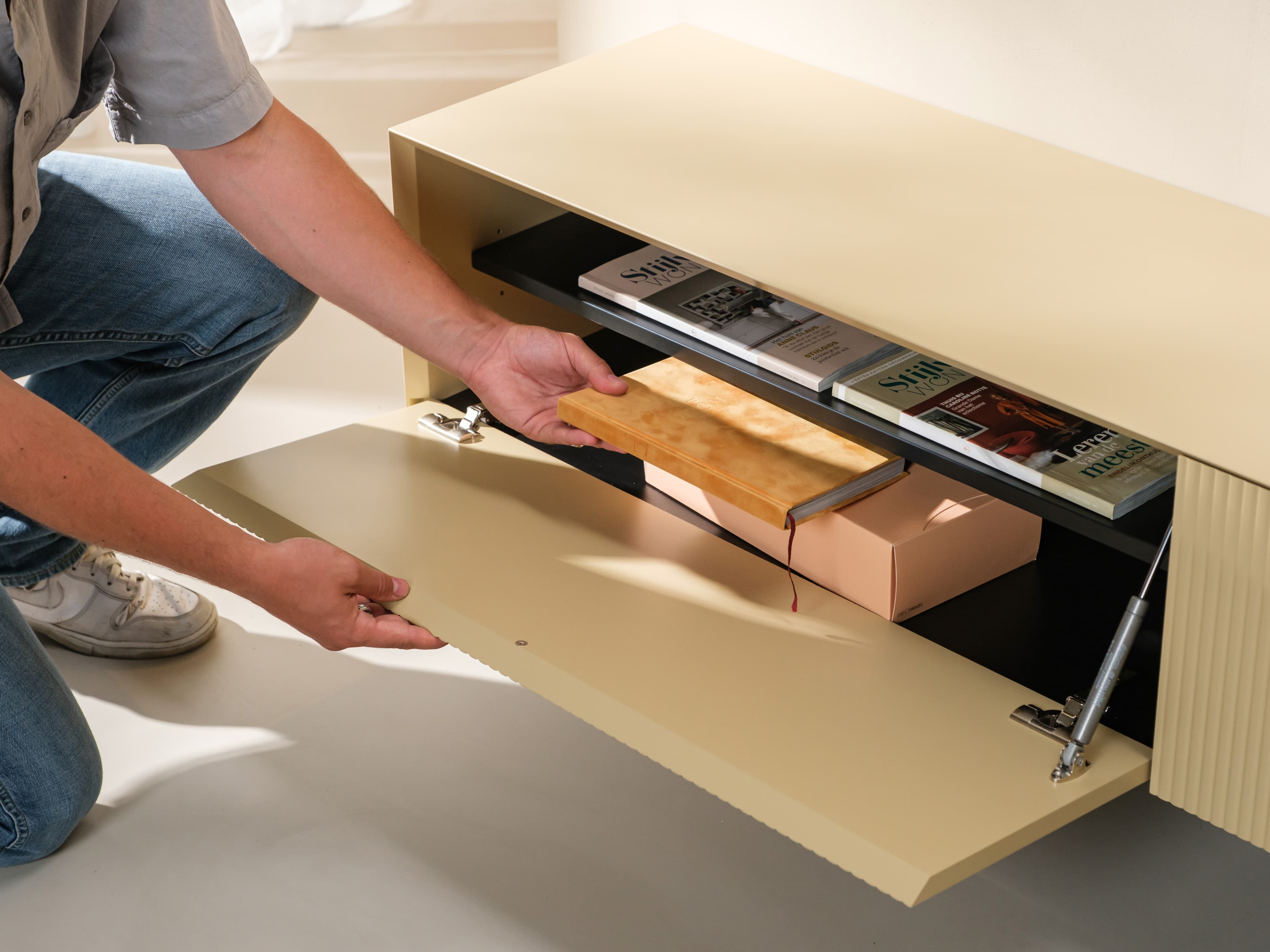 Het tv meubel is in formaat, indeling en kleur eenvoudig naar wens aanpasbaar. Kies je eigen unieke kleur. Van RAL tot vele andere bekende kleuren en kleurenwaaiers. Het meubel is ook beschikbaar met gladde fronten. Liever staand? Ook dat is mogelijk met diverse poten en plinten.