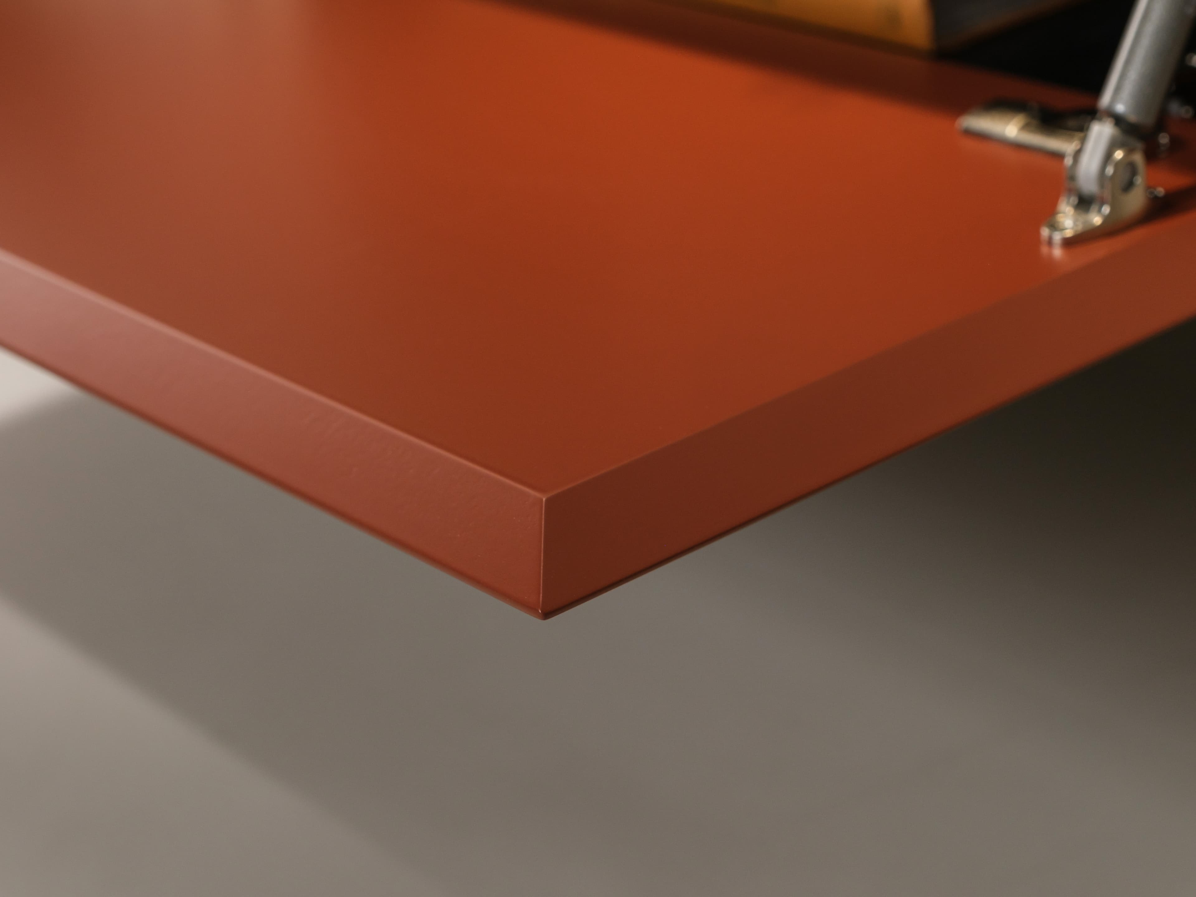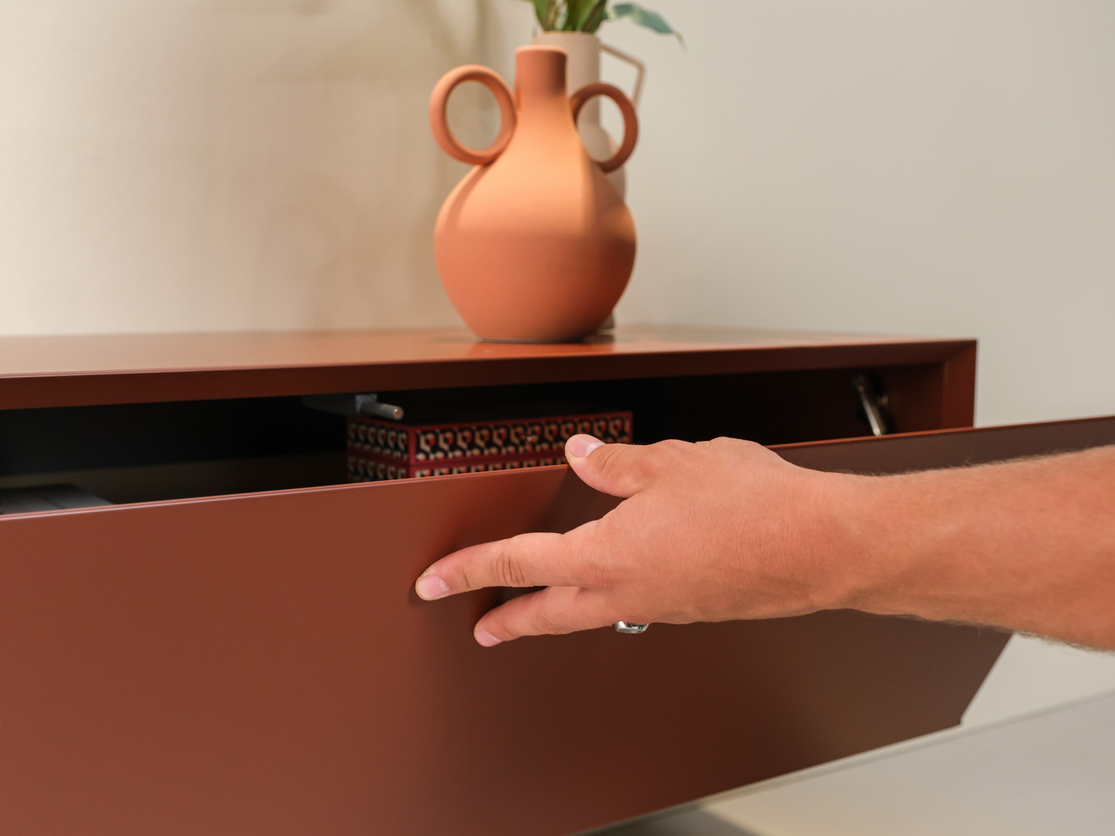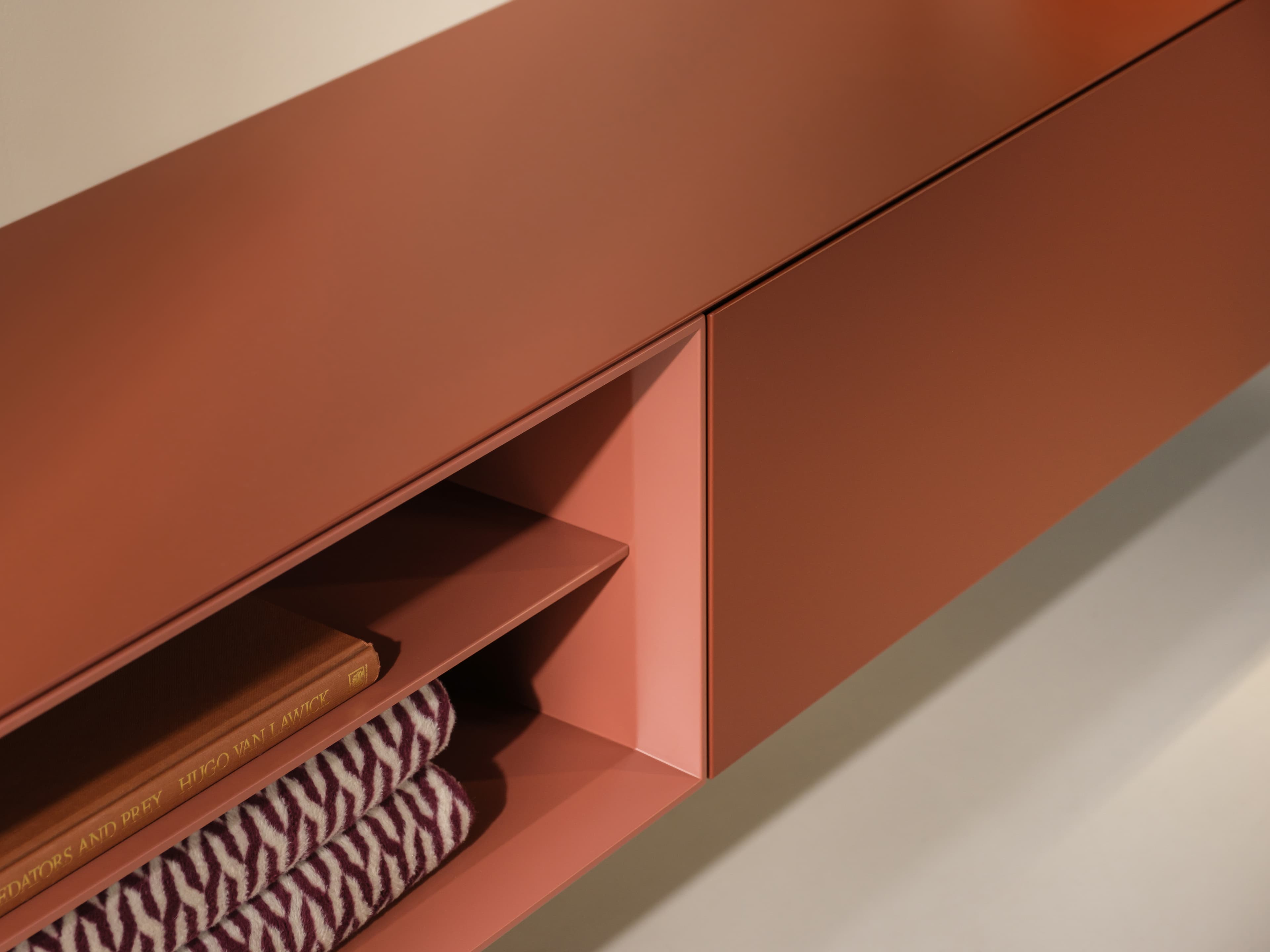 De inzet nis heeft een subtiel kleurverschil met het meubel. De afwijkende kleur en het open gedeelte geven een speelse ruimtelijkheid aan het geheel. Bovendien is het een handige opbergplek voor bijvoorbeeld boeken, tijdschriften of een afstandsbediening. De valkleppen vallen mooi rustig open dankzij het verfijnde push-to-open systeem met hoogwaardige gasveren.