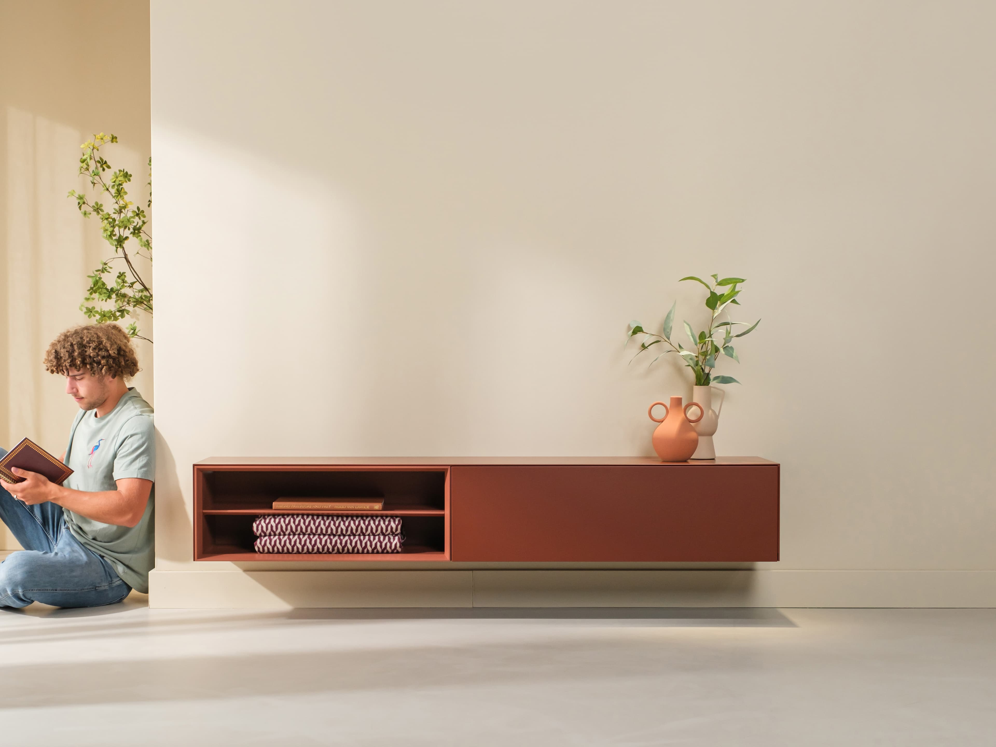 Het tv meubel is in formaat, kleur en indeling eenvoudig naar wens aanpasbaar. Bepaal de kleur van het meubel en de inzet nis los van elkaar. Kies uit onze signatuurkleuren of ga voor je eigen unieke kleur. Van RAL tot vele andere bekende kleuren en kleurenwaaiers. In effen, maar ook in houtstructuur.