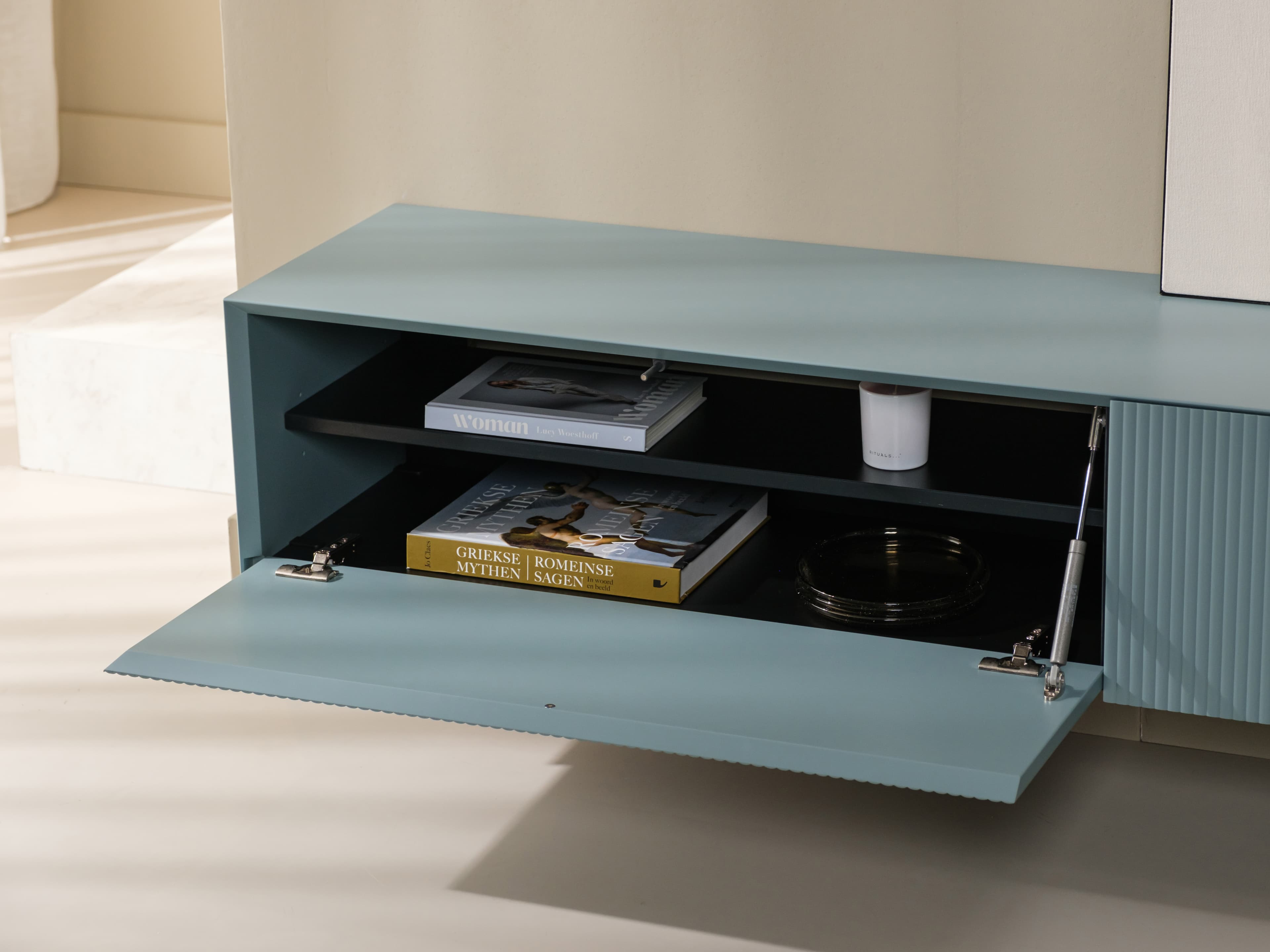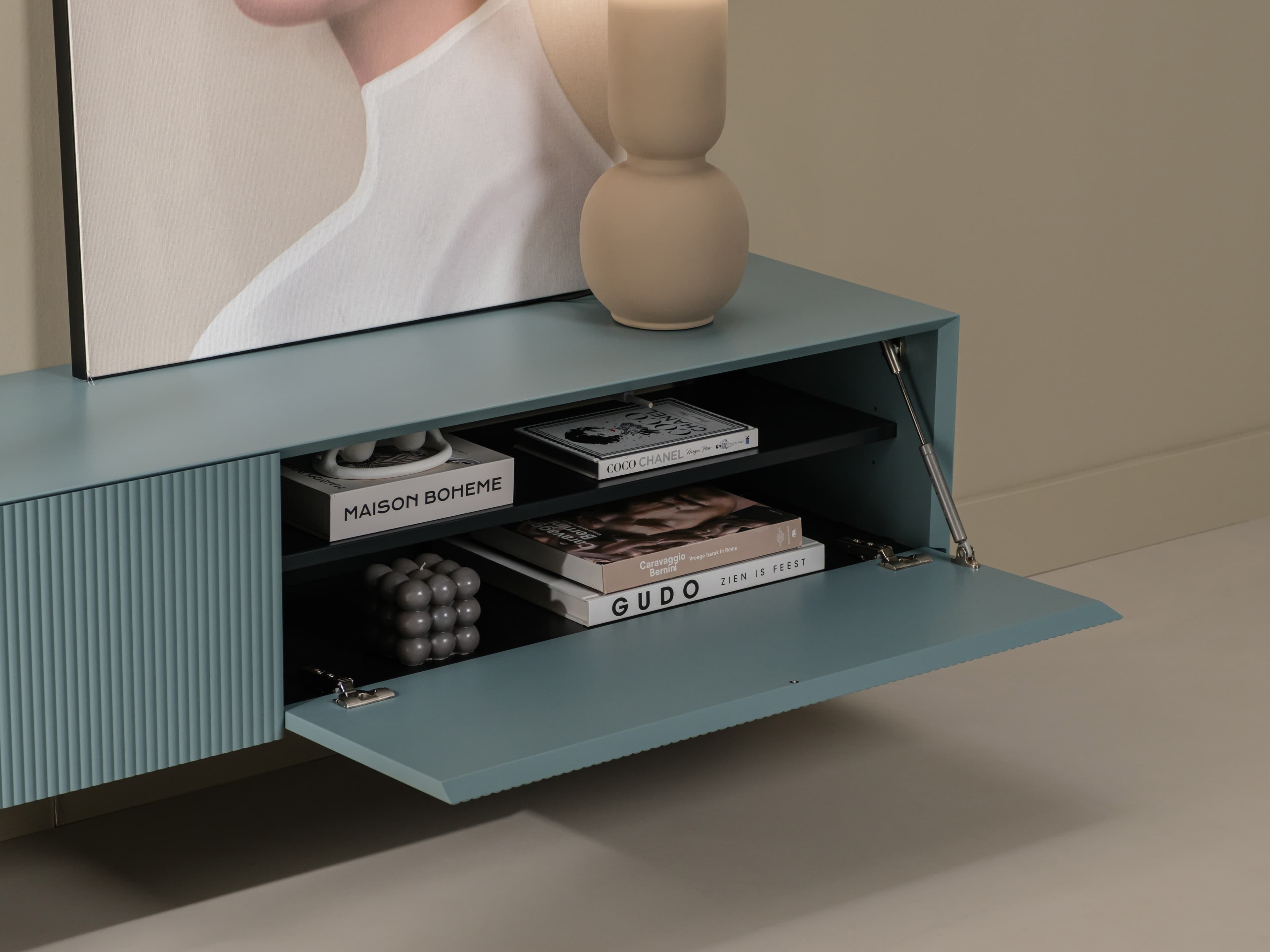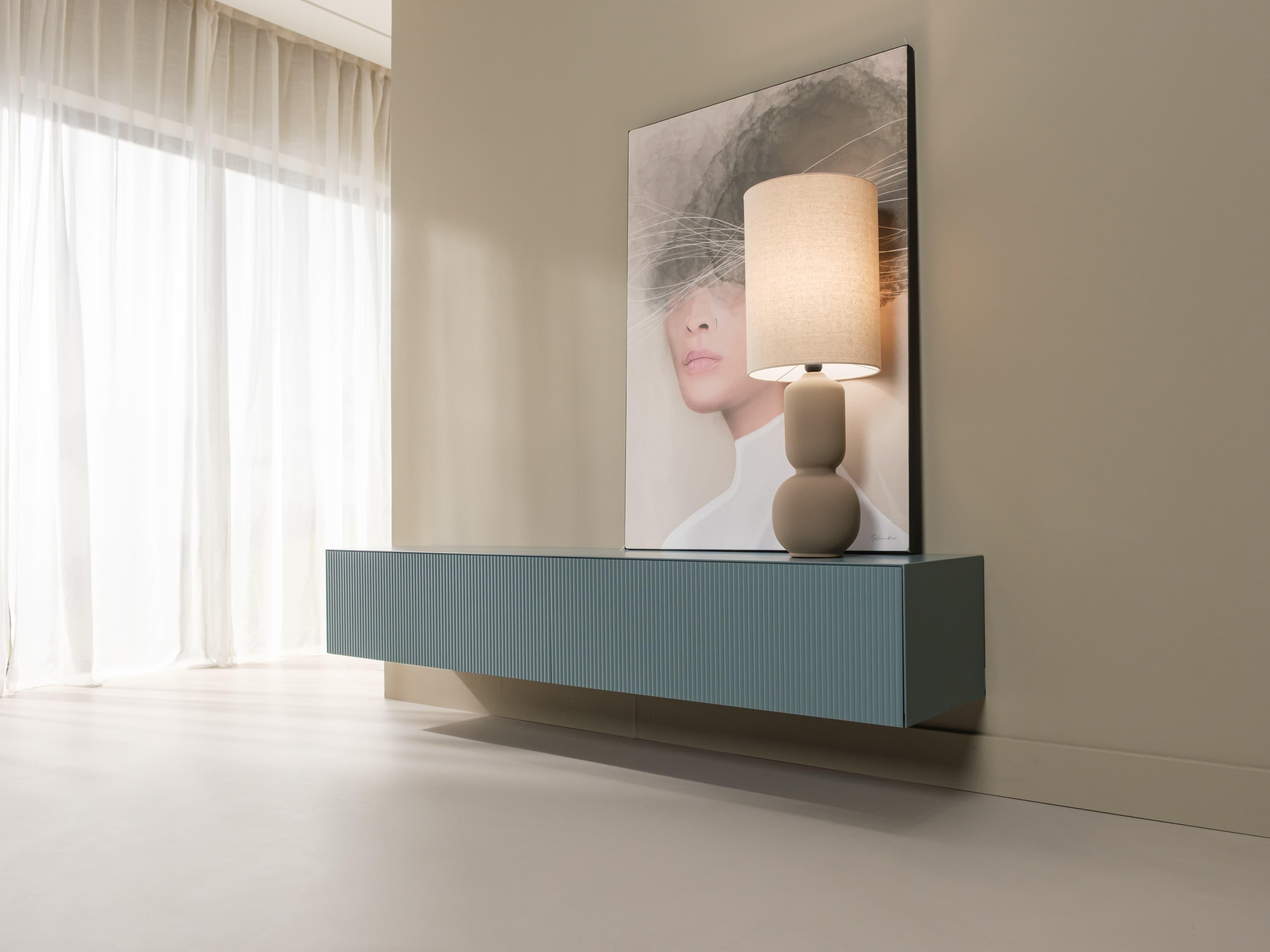 Zwevend tv meubel uit de Excellent serie. Dit model is gespoten in een unieke kleur en uitgevoerd met de ribbelfronten. Kenmerkend zijn de stijlvolle slanke lijnen en perfect afgewerkte details.